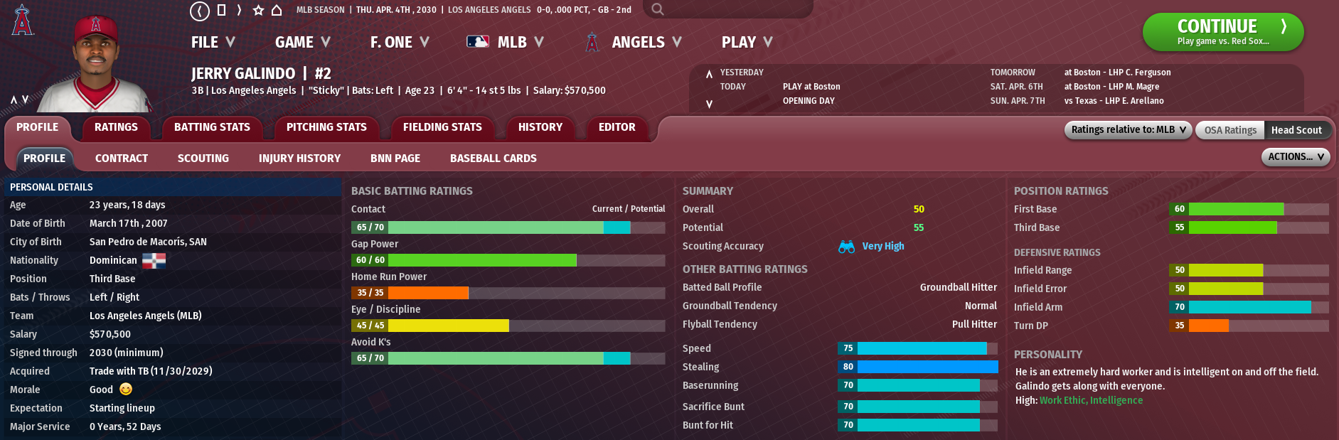 ...in the 2029 season, our payroll was $232.3m... It's an interesting change of direction, and actually isn't timed too badly. This offseason saw the departures of Corbin Burnes ($25m), and Shane Bieber ($21.3m). As a result of the ownership change, I didn't extend Terrin Vavra ($23.5m). He was good for us, 4 All-Star appearances and a Silver Slugger award from his 6 seasons in L.A., but I didn't think he was justifying his price tag, and now that money is a factor, he's off. Josh Jung ($7.8m) is also gone. He didn't have a good year, and got traded to the Nats for a pair of relievers. He was allowed to go as I wanted to get this guy in: ![]() Younger, cheaper, and hopefully, better. All told, the payroll has been reduced to $174.9m as of opening day. With our three most veteran bats (Perez, Delgado, Trout) (~$74m) potentially all in their last season, getting down to $160m shouldn't be too tough...though we'll see what that does to our performances... |