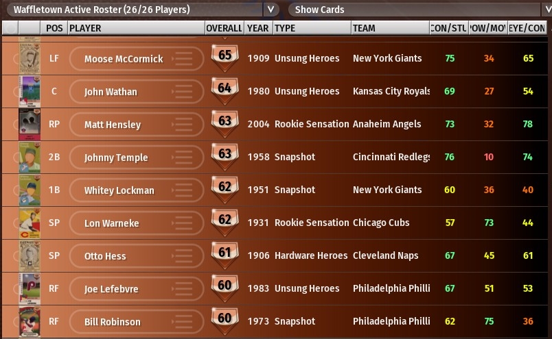 that's a pretty standard pull of cards for the starter packs... and don't worry about not having extra loyalty packs or the like... I've been around since v19, so got a couple diamond packs/gold pack/etc.... both diamond cards are Live cards (so can't use 'em once league play begins), but going to play the long game and hang on to them for missions rather than go for the quick 8K pp or so... you'll definitely get more satisfaction for the points you spend if you buy the cards outright rather than spend it on packs, since you'll know exactly what you're getting.... flip side to that is, you potentially could spend 1K on a regular pack and pull that one-in-a-million historical perfect card that can either bankroll your team for multiple seasons by selling it, or carry your squad for years by playing it... good way to get some free packs is to go watch the live streams on twitch on the ootp channel (or sanctioned affiliate streamer channels as well)... limited to 5 packs per day, but that adds up after awhile and is invaluable to FTP teams (though streams are still paying out packs for v22 and haven't updated to v23 yet.... hopefully not to much longer for that switch) btw, below is my squad at the moment.... the Bosio card is the only really big pull I've nabbed from packs so far.... haven't bothered to buy any cards yet myself, just going with what the packs have given me |