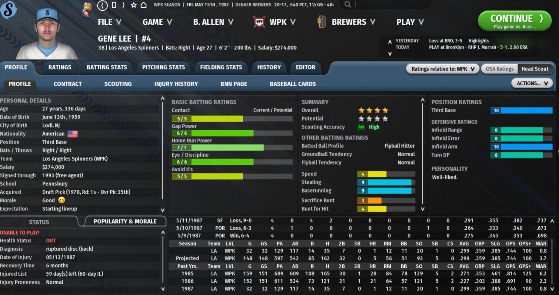 Summary: The Brewers start the week on the road in Baltimore against the Lords of the MGL East. The Lords, as has been true for much of their history, have a potent offense, particularly in terms of homerun power, but little pitching. Granted some of this is a byproduct of the park they play in (Community Stadium) which favors hitters and especially left-handed power hitters. So naturally the middle part of their batting order (from 2-5) features left-handed slugger Mike Lovett, switch-hitter Alex Afanador (who hits better from the left side of the plate), second-year right fielder Chris Buchanan (LHB), and another second-year player in left fielder Sam Lawson (LHB). Each one of these hitters is a serious threat to reach the seats in every at-bat, with Afanador and Buchanan possessing the best all-around hit tools. In the first game of the series, on Monday evening, the Brewers held the Lords to just a single jack, but still lost 4-2 as veteran starting pitcher Warren Shields pitched a strong 8 innings for the home team. Denver starter Eric Fehrenbacher had another strong start without a decision, lasting 7 innings and giving up 2 runs on 5 hits. Jeremy Beeson’s first triple of the season was the lone extra-base hit for the Brewers. Tuesday’s game was a more typical slugfest in Community Stadium, though one-sided, with Bernie Lopez (2-0, 3.54) once again delivering a fine start for the visitors (7 IP, 2 R, 8 H), and being the beneficiary of an offensive outpouring. Backup catcher Omari Williams was one of the many hitting stars, going 3 for 4 with 4 runs scored, 3 RBI, hitting his 2nd double and 1st triple of the 1987 season. And Heath Zweig continues to shine for his new club, going 4 for 5 with 4 RBI from the 9th slot in the lineup, getting his 1st triple as a Brewer. Jeremy Beeson, given the starting job at third base in his second big league season, got off to a slow start, but is starting to get hot and went 3 for 6 with 2 runs scored in the blowout win. The Brewers got the series win on the road with a narrow come-from-behind victory powered by young second baseman Nick Mull, who has been our best player in the early going. Mull went 3 for 3 with a run scored and 3 driven in, hitting his 2nd double of the season and swiping his 4th bag. Jeremy Beeson contributed a 4 for 5, 1 run scored performance. Eric Maisch (1-0, 4.18) got his first win of the season, working 7 innings, giving up 4 runs on 8 hits (including 2 bombs). Dan Folk earned his 4th save. After a brief road trip, the Brewers returned home for a 4-game set against Montreal. In the Thursday night game, the Brewers got a strong enough start from veteran Jim Atwell (7 IP, 4 R, 6 H, 9 K, 2 BB) and another terrific appearance by 24-year-old reliever Cesar Perez, getting his first sustained taste of the WPK. Perez worked 2 flawless innings, striking out 2 batters, and earned his first win of the season. Off-season acquisition Kenny Brown led the offense, going 3 for 5 with a run and 2 RBI, clubbing his 2nd homer of the season. The Brewers lost a heartbreaker on Friday night, relinquishing a 3-1 lead in the top of the 9th when the Royals got to relievers Willie Ramirez and Scott Evans (1-2, 4.50) for 3 runs combined and held on to win 4-3. It was a particularly unfair result for Denver starter Stephen Brooks, who allowed 1 unearned run on 5 hits over 6 innings pitched (he had thrown 119 pitches and was gassed). The Brewers bounced back to get an extra-innings win the next evening but as that is our Game of the Week, see below for more details. And then in the Sunday matinee the Brewers made it 3 of 4 against the Royals. Eric Fehrenbacher continued a mostly solid season, lasting 5 innings while giving up 3 runs on 6 hits but was again denied a decision. Cesar Perez (2-0, 0.84), maybe our best pitcher in the early going, pitched 2.1 innings in relief, nearly perfect- walking 2 and striking out 5- to earn the win. Willie Ramirez pitched the last 1.2 for his 3rd save. Nick Mull’s (.415/.500/.642) torrid start continued, as he went 2 for 3 in this one, hitting his 3rd homer of the season and making an incredible highlight-reel play at second base in the top of the 8th inning to squelch a potential rally for the Royals and end the inning. And Jerry Lillie (.293/.354/.640) only had 1 hit but it was his 7th homer, which ties him for the HR lead in the MGL with Baltimore’s Chris Buchanan. Brewers Game of the Week: For the second straight week the Brewers Game of the Week involves heroics by veteran left-handed starter Austin Bond, in just his second appearance, and first start, of the ’87 season. Although he didn’t get credit for the win, Bond pitched a gutsy 7 innings, giving up 3 runs on 7 hits. Unfortunately, veteran reliever Paul Johnson wasn’t at his best, allowing 2 runs on 3 hits over his 2.2 IP. But the Brewers kept battling at the plate and tied things up at 5 runs apiece when veteran outfielder and team captain (and not generally a source of much over-the-fence power) Heath Zweig (.350/.391/.525) hit his first homerun as a member of the Brewers. And with offseason acquisition, lefty reliever Scott Evans (2-2, 3.86) giving us 1.1 strong innings to hold things there, the Brewers were able to walk it off in the bottom of the 11th, thanks to a Zweig lead-off walk followed by a run-scoring double off the bat of Kenny Brown (.317/.380/.427). Notes from Around the WPK: The Houston Cavaliers remain not only the best team in the SJL West but the hottest team in the early going in all the WPK, at 14-5. They are 1st in runs scored and in runs allowed in the SJL and are getting tremendous seasons out of outfielders Atsushi Matsuda and Alex Raymos. The Seattle Alligators are somehow managing to hang in there above .500 so far at 11-9 in second place. The El Paso Dawgs bring up the rear in the SJL West with a record of 7-12. Over in the SJL East, Washington is in their familiar first place spot, with an 11-8 record. Columbus an