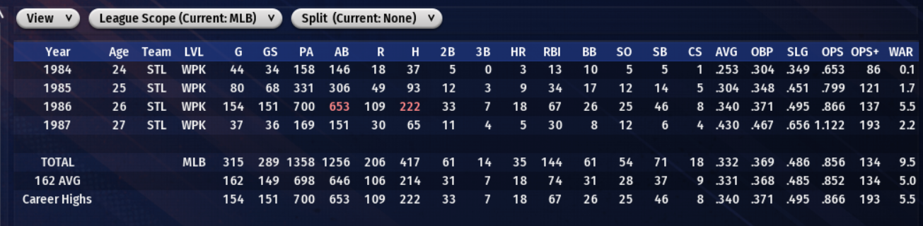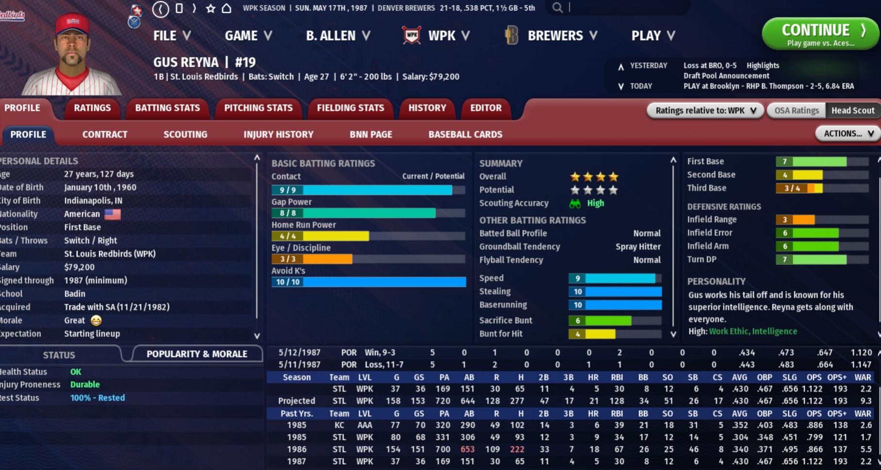 Summary: Week 2 of the season is a much more hopeful one for the Brewers, though admittedly returning home to Centennial Stadium helped. Although they lost the first and last games of the week, they won every game in between. In game 1 against St. Louis the Brewers let a 7-4 lead slip away with some uncharacteristic poor bullpen pitching, starting with lefty Diego Lopez allowing 2 runs in just two thirds of an inning pitched, and then seeing Dan Folk (0-1, 8.10) suffer his first blown save of the season, allowing 3 runs on 4 hits and 2 walks in 1.1 innings pitched. Starter Stephen Brooks was just okay in this one, allowing 4 runs on 7 hits over his 6 innings. Rookie second baseman Nick Mull had the big hit for the Brewers, his 1st home run of the season, and first big league Grand Slam, in the 5-run 4th inning. Booming Brewers bats helped Eric Fehrenbacher (1-1, 3.60) get his first win of the season in game 2. Fehrenbacher worked a strong 8 innings, giving up 4 runs on just 5 hits. Multi-position utility infielder Brandon Singer, off to a slow start, had his best day at the plate yet in 1987, going 2 for 4, hitting both his first triple and first homer of the season, driving in 3 runs. The currently red-hot Nick Mull added a 3 for 4, 2 runs scored performance to the mix. The Brewers took the series with more offense again in game 3, getting homers from Myles Ford (2) and Gene "Basher" Brasher (2). Bernie Lopez had another respectable start though he was denied a decision. He lasted 6.1 and gave up 4 runs (3 earned) on 6 hits, striking out 6 and walking 2. Veteran lefty reliever (and offseason waiver wire acquisition) Scott Evans blew the save and was credited with the win (an embarrassing, if moderately satisfying, accomplishment), pitching 1.2 innings and allowing 1 run on 1 hit (a HR, one of two bombs for veteran Redbird great Steve Whitehead in the game). Dan Folk pitched a shaky 9th for his 3rd save (he gave up a hit and walked 2 batters, but held on to work out of the self-created jam). The Brewers then played host to the Brooklyn Aces. And in game 1 they punished the visitors from that fair borough. For more details of this one see below. Game 2 was a bit closer but the Brewers bats continued to boom at home. In this one the POTG was the recently recalled from AAA outfielder Matt Turner, who went 3 for 3 with 2 runs scored, 1 RBI, and 1 walk. Shortstop Willie Romero, who has mostly been silent at the plate this season, broke out in this one, going 3 for 4 with 2 runs scored. And the Brewers got homers from three youngsters: Nick Mull (2), outfielder Wayne LaCross (2)(also a more recent call-up), and third baseman Jeremy Beeson (1), who is off to a cold start at the plate this year. Jim Atwell (2-1, 7.00) didn't exactly earn the win, giving up 5 runs (4 earned) on 9 hits over just 5 innings pitched, but he got it anyway. And Willie Ramirez, who has mostly been fantastic thus far, did earn his 2nd save of the season with 2 strong innings pitched. In the last game of the series, and the week, the Brewers gave up 3 runs to Brooklyn in both the 6th and 7th innings and the game went into extras tied at 9 apiece. The bullpen did not do a great job in this one, although Cesar Perez, who was saddled with the blown save, was actually quite good, pitching 3 innings, striking out 5 batters and allowing just single run on a Mike Rugg pinch-hit homer, the only hit Perez would allow. Scott Evans (1-1, 5.40) pitched the final 2 innings and took the loss.Starter Stephen Brooks was not good- he gave up 6 runs on 7 hits in 5.2 IP. The Brewers bats continued to be red-hot, with Chris Romines (leading league in batting average at .429) going 3 for 5, driving in 3 runs, recently signed (to a minor league contract) veteran free agent center fielder Heath Zweig going 2 for 5 and hitting his first double as a Brewer, and most impressively Jerry Lillie (see below for more) going 3 for 5 with 3 runs scored, 3 driven in, 2 of his hits being homers (5) and the other one being his 4th double of the season. But young Brooklyn slugging first baseman Roger Rhinehart's 2-run homer in the top of the 11th inning proved to be the winner. Brewers Game of the Week: I wouldn't usually pick a blow-out, even one the Brewers won, as the GOTW, but this one stands out because the ace of the staff, Eric Maisch, had to exit early after getting the first 2 outs of the 4th inning, leaving with his team up 3-1 but with a lot of game to go. (Maisch has shown some injury proneness over his career but in this case fortunately it proved to be minor issue with a recurring back strain and although his next start might need to be pushed off a day he is expected to be fully recovered soon.) Veteran left-handed starter Austin Bond (1-0, 2.45), who has been in the 'pen this year and hadn't yet made an appearance, came in and did a heroic job for 3.2 innings, giving up just 1 run on 4 hits while also K'ing 4. And the Brewers gave him instant offensive support by scoring 4 runs in the bottom of the 4th and then later adding on in the 7th and 8th. Cesar Perez also pitched well again, giving up just 1 hit and no runs in his 1.2 IP. The suddenly hot Willie Romero went 4 for 5 in this one, driving in 3 runs and hitting his 1st home run of the season. Notes from around the WPK: The Houston Cavaliers remain the best in the SJL West at this point, with a 10-3 record. Chicago and Seattle are their nearest competitors in the division, both with 8-5 marks. El Paso brings up the rear at 4-8. The SJL East is mostly bunched up, with the best record being Washington's 7-5 mark and Columbus at 7-6. Boston has the worst record in the WPK thus far at 3-9. The MGL West continues to be owned early on by the San Francisco Velocity, who are off to a 10-2 start. Denver and St. Louis are tied for 2nd at 7-6 each. L.A. is last in the division with a 5-7 win-loss record. And the Charlotte Sting remain atop the not very strong MGL East, with a record of 8-5. They are 