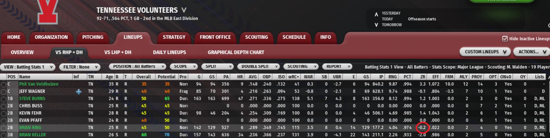 The league sortable stats page sometimes differs from an individuals players fielding page. But definitely on the roster or lineup page, zone rating displays incorrect. Last edited by jfb8300; 08-03-2022 at 02:23 PM. |