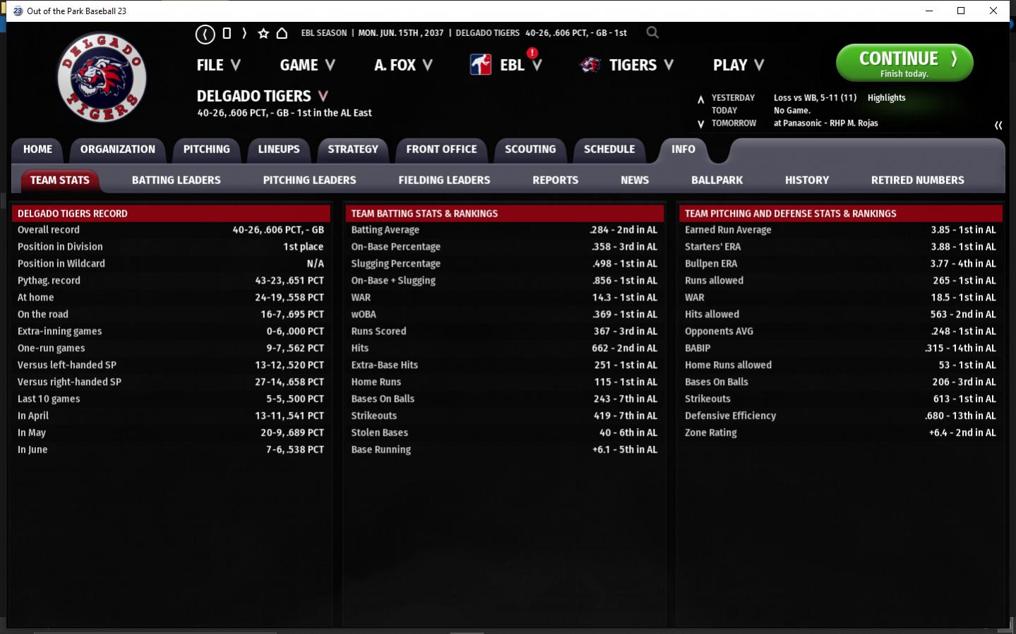 38-31 .551 1½ GB AL west, tied for #2 AL WC. We are 1-2 vs the Thrantas this season. The Thrantas have been playing well this season despite not having great stats.
