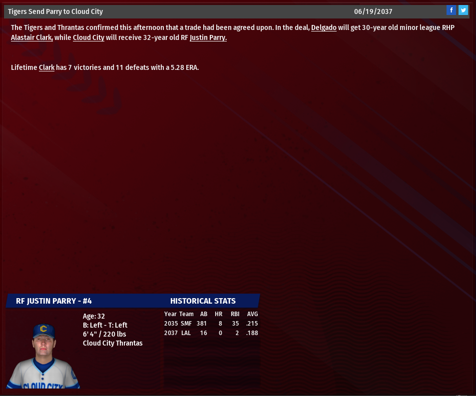 Delgado Tigers traded Rf Justin Parry to the Cloud City Thrantas for SP Alastair Clark.