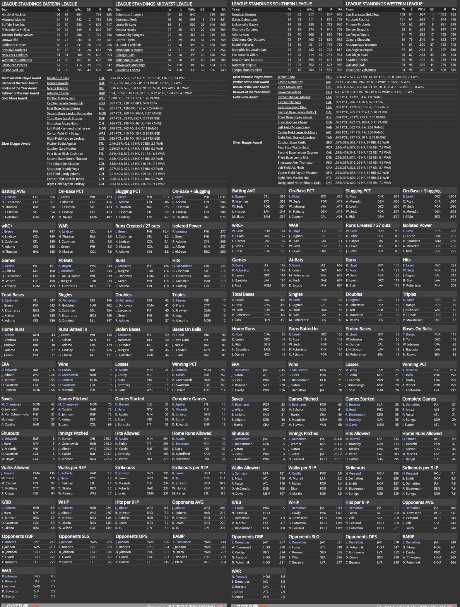 Columbus picked up the Midwest League title at 104-58 with a the MVP in Kayden Lindsay, a third-year outfielder who won the batting title and led the National Association in WAR. Defending World Series champ Cincinnati took the second place spot and playoff berth at 96-66. Pitcher of the Year went to Buffalo’s Derek Edwards as the 22-year old lefty and second overall pick in 1918 had the best ERA in MLB at 2.15. The Huskies beat the Reds in a five game classic to prevent a repeat and the Chargers downed the Maples in four games. The NACS would go the distance with Hartford winning in seven for their second Association title. In the American Association, the Western League was the top heavy one with four teams at 98 wins or more. San Francisco led the way at 108-54 and were one of a select few teams to score 1000+ runs. Portland took the second place spot at 101-61, one better than Phoenix and three over Denver. Pacifics slugger Walter Seda won his third career MVP with a career best 222 hits and 126 runs scored. In the Southern League, Houston took first at 100-62 for their playoff berth since 1914. Dallas, winner of the AA title in the last two seasons, extended their playoff streak to four years with a second place mark at 99-63. Jacksonville (94-68), Charlotte (93-69), and Atlanta (92-70) were in the fight. Pitcher of the Year went to Gators veteran Easton Dematties, who at age 30 had a career year and league best ERA at 2.45. Canaries 1B/DH Christopher Ross socked 58 home runs, tying the all-time record set by Aitor Cerda seven years earlier. The first round of the AA playoffs saw the Hornets sweep the Pacifics and the Gold Rush sweep the Dalmatians. The American Association Championship Series went seven games and Houston outlasted the San Fran offense, giving the Hornets a seventh association title in the AA’s first 20 years. In the World Series, Houston secured a fifth MLB title, defeating Hartford in six games. It wouldn’t be until the mid 1940s that another franchise could claim five titles to their name. Outfielder Richie Ferenchak was an unlikely World Series MVP, picking up 23 hits and 12 runs over 16 postseason games. Other notes; Willie Hodo of Toronto became the second pitcher to reach 3500 career strikeouts. |