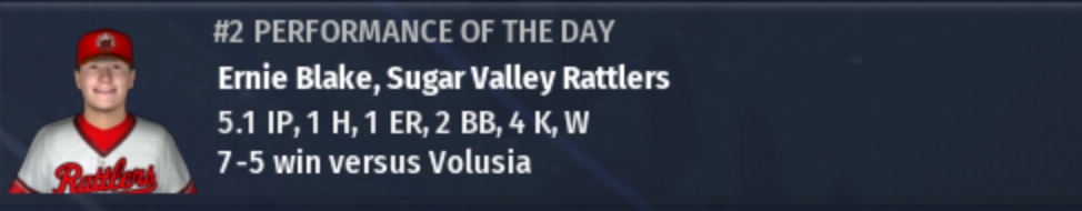 In their first postseason appearance, the Sugar Valley Rattlers have advanced to the RU Title Series. The were pushed to Game 7 by the pesky Volusia Vigilantes, but the Rattlers came through in the end. In Game 7, Barrett Parverol was 4-4 with 2 doubles, a home run, and 4 RBI. He was clearly the well-deserved MVP of the series. Ryan Haney hit a 2-run blast in the bottom of the 8th to break a 5-5 tie, and Ernie Blake shut the door in the bottom of the 9th to secure a 7-5 win and Division Series victory. |
