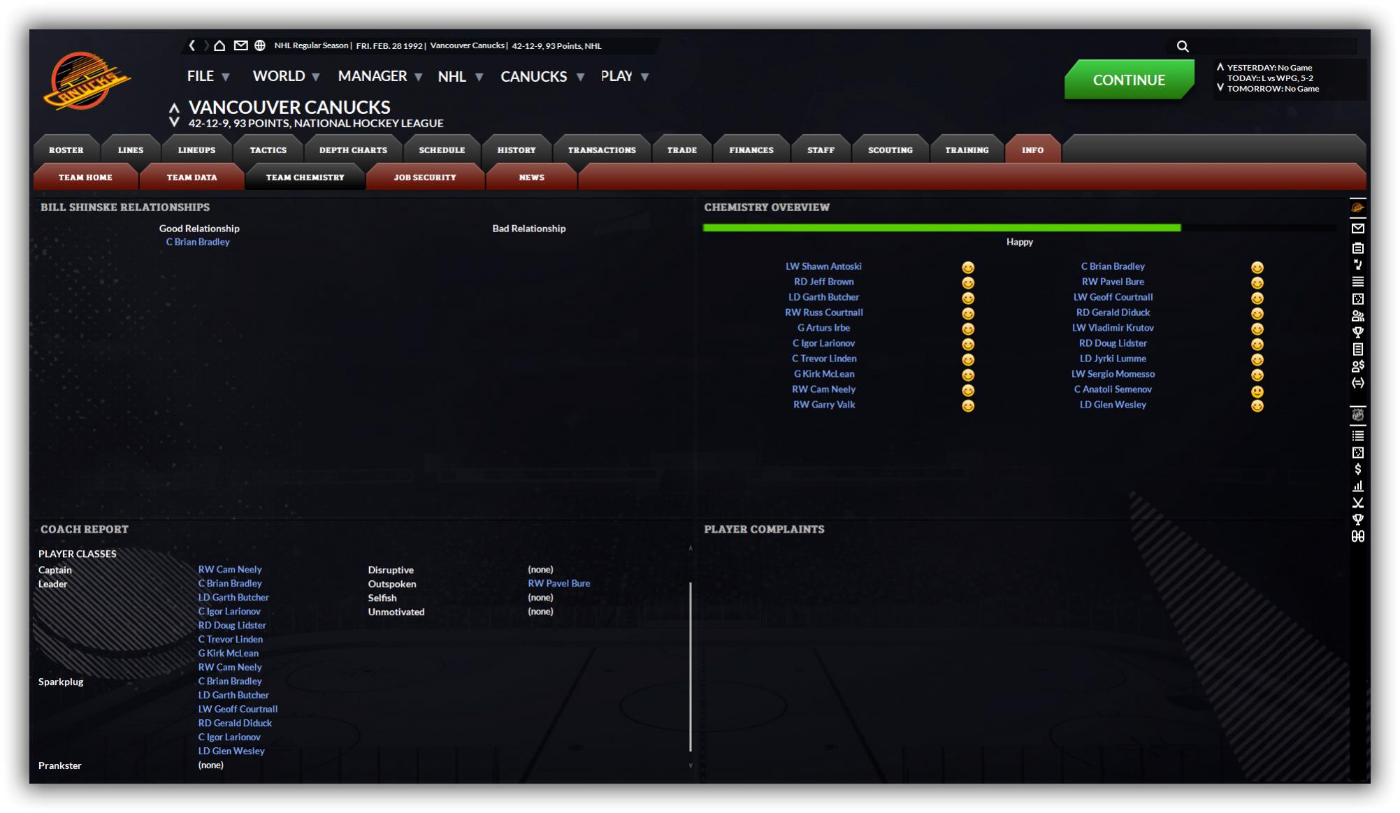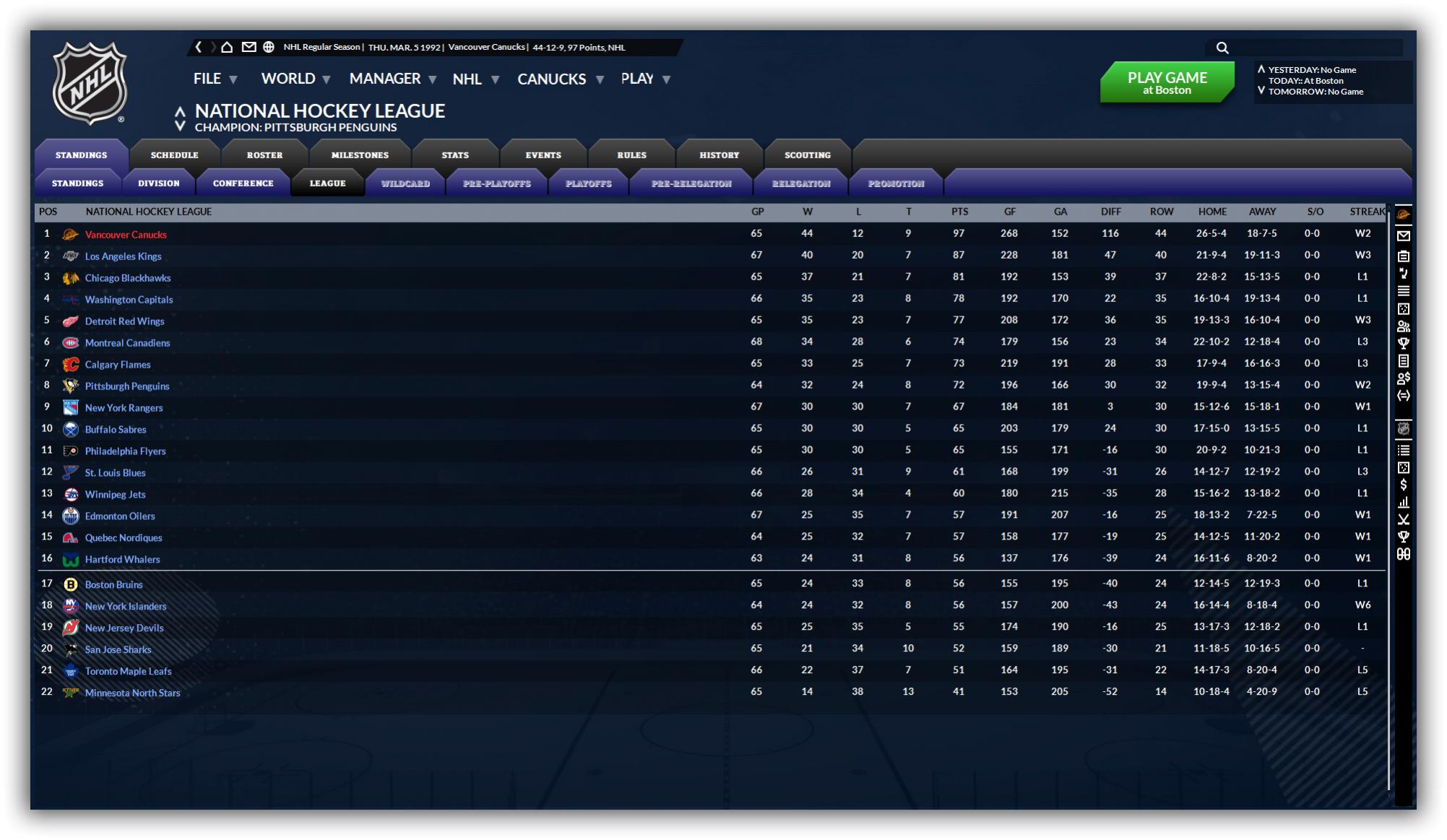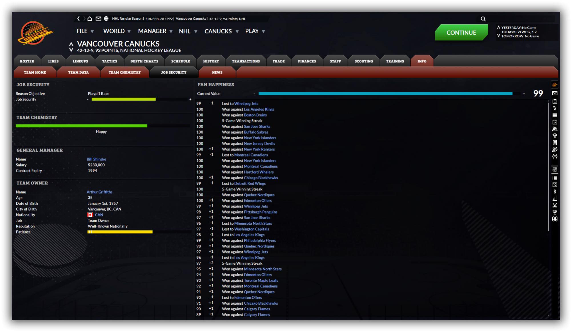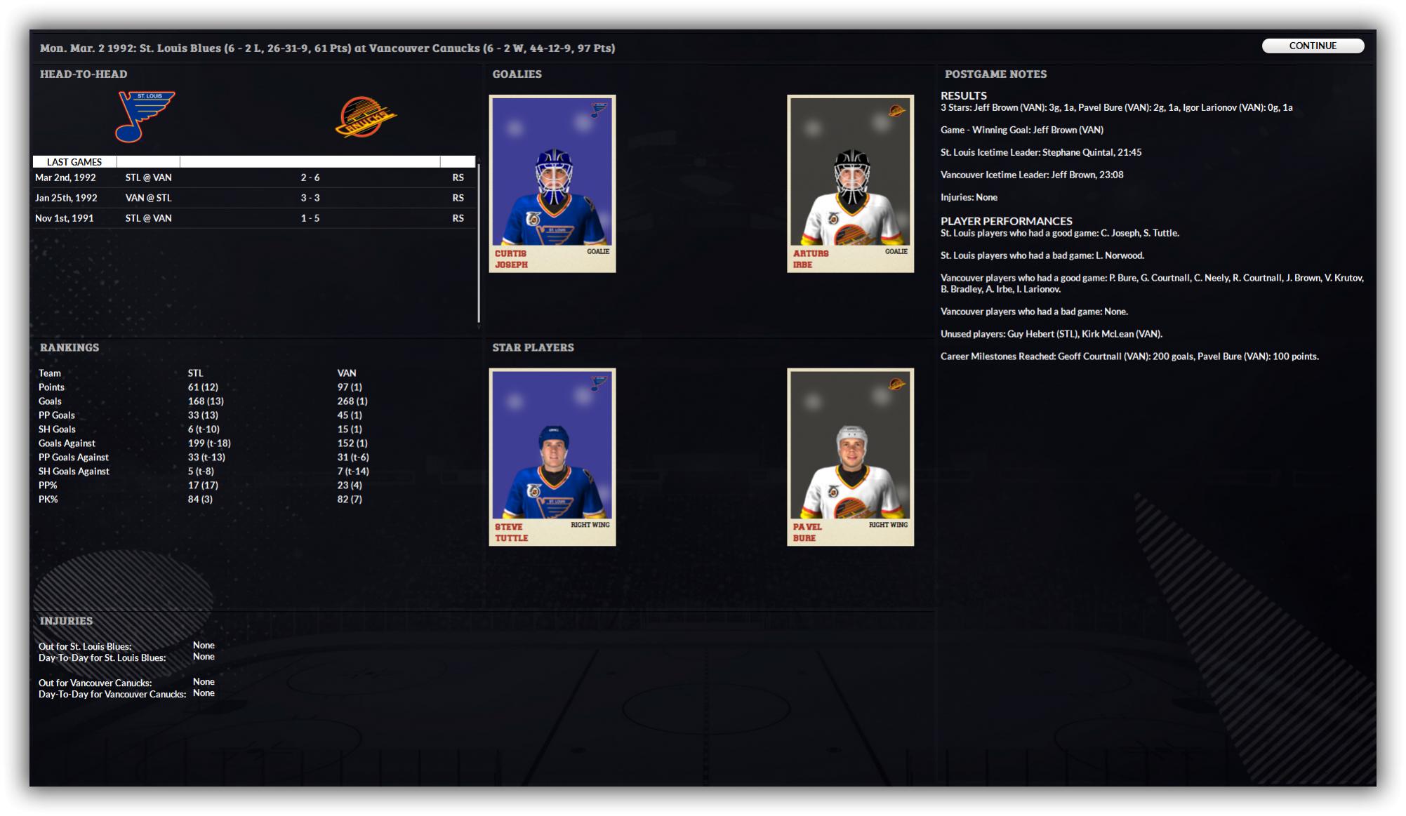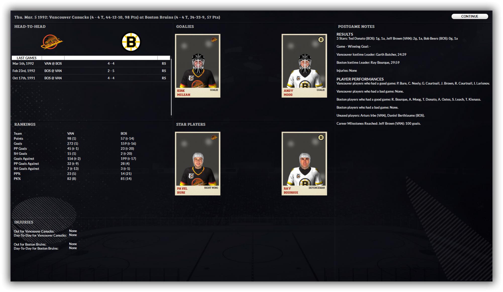 Before it was all said and done, Winnipeg fired 43 shots on Arturs Irbe, who must have been wondering what happened to our usual puck possession game. Down 4-to-1 with 8:17 left in the game, Pavel Bure managed to get us within two, but that's as close as we'd come. Minutes later, the Jets added an empty netter to put the finishing touches on a 5-2 win. Later in the dressing room... GM/HC: "We need to take this game as a learning experience. This is what can happen when you play a desperate team. It's very difficult to match their level of emotional intensity. They've got everything to lose, and we've got nothing to lose, except our self-respect. Great teams rise above and find a way to outmatch their opponents, and everyone in this organization believes, this is a great team!" - - - - - - - Week: 20 Last edited by jumpSeat; 10-04-2022 at 07:33 PM. Reason: Added Image |