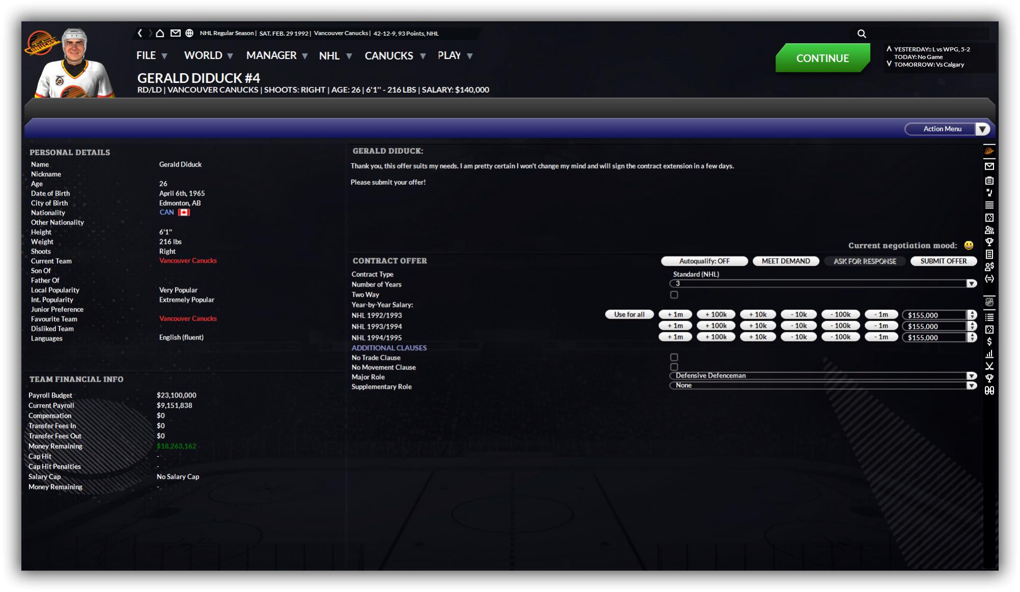 One of the first, (and fastest) to align was third-pair defenseman Gerald Diduck. 'Dids' was a hard-nosed character player, and a great shutdown defenseman who gave you everything he had. He was the kind of player you could throw out on the PK, and trust him to take care of his own end, with no qualms. Gerald loved playing in Vancouver, and it was our pleasure to have him (and keep him) on the team. Diduck's existing contract called for 140k per year. Starting from there, Brian negotiated an extension for another three years at 155k per. That represented a 10.7% increase, or in layman's terms, a number we were very happy with. |
