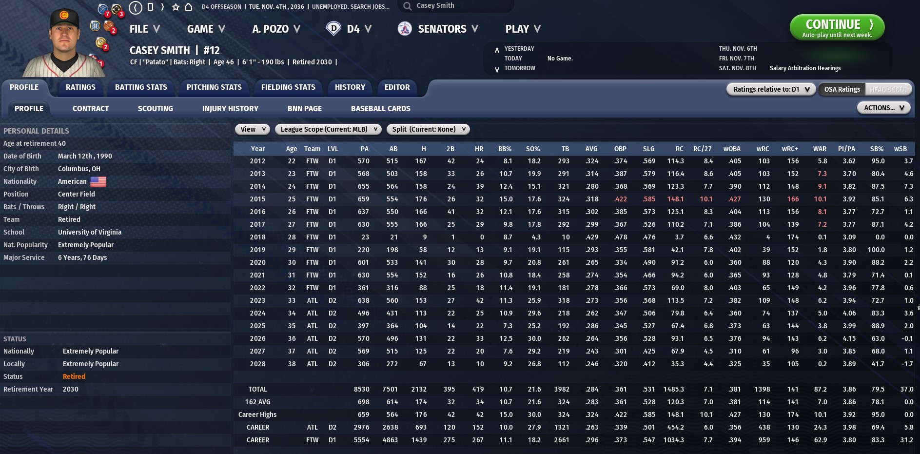 CF Mel Irving, Baltimore Terrapins, 2026 The Terrapins’ young center fielder’s greatest season came the year after he hit the greatest home run in Terrapins history, a walk-off, come-from-behind two strike blast into the right field stands at Terrapins Park. He followed up that homer with an MVP year: a league-leading 8.9 WAR, driven by his defensive value (resulting in his first Gold Glove) and a .320/.372/.523 line with a career-best 35 homers (the only time he cracked 30). His 190 hits and 340 total bases each led D2. While Irving remains one of the greatest defenders in the game, with 11 straight awards in center, his offensive game has never been as good as it was in that age 23 season, when he was the best in the game. CF Kyle DuBell, Chicago Whales, 2029 Another young CF with one extraordinary season. DuBell was never the defender Irving was, but at his best his bat made up for that value, including in his only MVP season, 2029. DuBell hit .296/.364/.631 with 44 homers and 39 doubles, driving in 128 for the D2 champion Whales. His 8.2 WAR led D2 that year, and helped the Whales climb back to Division 1, where the franchise originated. DuBell’s 2029 was in the middle of his most productive stretch as a player, but he fell off a cliff after his age 29 season and has never regained his production, topping 3 WAR only once since 2031. LF Pedro Quiroz, New Orleans Zephyrs, 2029 Some of the highlights of Quiroz’s amazing 2029 are detailed in the previous section, and in truth this list could have replaced this year with 2028, 2030, or 2026, all of which ended with higher WAR totals than 2029. But 2029 was a season of legend, in which Quiroz cemented himself as the Federation’s greatest slugger, smashing the record of 60 homers in a season by two, and the total bases record by 1. Quiroz batted .313/.374/.664, and led D2 in at bats, plate appearances, hits, slugging, runs created, wRC+, runs, RBI, and OPS - though, incredibly, not WAR: his subpar fielding dragged his value down to a “mere” 6.5 WAR. Despite that, the season remains one of the most cherished and remembered in NABF history, a bit of New Orleans magic at the end of an incredible decade of baseball. 3B Brian Runnion, Charlotte Hornets, 2025 The only infielder on the list for these cycles is Runnion, who held down third base for the Charlotte Hornets through most of the 2020s. It’s almost impossible to choose between his 2025 and 2026 seasons, but the Hornets’ conference title in 2025 puts that year over the edge. Runnion was both the team and Division MVP in 2025, the first of his three awards, as he hit .294 while leading the Division in on-base percentage (.439), slugging (.604), OPS (1.034) and WAR (8.3) as well as a host of other categories. He was far and away the best position player in Division 4 that season, his 8.3 WAR amazingly close to double that of the next closest, the San Antonio Missions’ Sam Martinez, with just 4.8. CF Bobby Usry, New Orleans Zephyrs, 2027 Just as his teammate Quiroz would do two years later, Bobby Usry captured the sport’s attention in 2027 with a record-breaking run as he targeted Jonathan Allen’s 220 hit record, set with the Salt Lake Gulls all the way back in 2010. He would do so successfully in the season’s final week, with the record-breaker stopping play in New Orleans as Usry - already an established star though in only his second season in the Big Easy - was honored by the club. He would go on to set the Division 4 single season hits record with 225 in 2031 while with the Browns; he would also set the all-time hits mark that season, a mark he continues to both hold and grow. Pitchers SP Jim Betz, Baltimore Terrapins, 2025 Jim Betz was 36 years old, in his third season with Baltimore. He’d just returned to Division 2, where he’d begun his career with the Havana Sugar Kings, a franchise where he’d had his finest years, and while he’d been excellent for the Terrapins in 2024 many doubted he’d be able to repeat it as Baltimore climbed the ladder. He didn’t: he blew 2024 out of the water with a sterling 20 win season in which he threw almost 220 innings and allowed only five home runs. Five. On top of that incredible figure, Betz put up a 2.27 FIP (57 FIP-) and 8.2 WAR while taking home both a Championship share and a Pitcher of the Year award. On a team of stars, it’s hard to say Betz was the biggest reason the Terrapins did what they did in 2025, but he was certainly in the inner circle. SP Bob Paul, Los Angeles Angels, 2026 Bob Paul has now had two successful careers: the first between 2020 and 2028 as an ace starting pitcher for the Los Angeles Angels, and the second as an all-time great closer with seven different franchises since 2029. This season was the finest of that first career, as he provided a struggling and in-transition Angels squad with its only true anchor. Paul went 16-6 for a losing franchise, striking out just under a batter an inning with a 2,81 FIP (64 FIP-). He walked just 5% of the hitters he faced that year, dominating a tough Division 1. He was denied a Pitcher of the Year Award - it went instead to Boston’s Hector Rayfield for an almost objectively worse season - but he was clearly the most valuable pitcher to his club, and maybe the only thing in those years that kept LA out of Division 2. SP Brian Tate, Albuquerque Dukes, 2026 Tate had a short career, but a brilliant one. For four years with the Dukes, he was the best there was in both Division 4 and Division 3, leading in WAR each of those seasons while revitalizing a struggling Dukes franchise. 2026 was the second, and greatest, of them, as Tate earned 7.7 WAR with a miniscule SIERA of 1.59, a 54 FIP-, and an almost unheard-of 12.1 K/9, which at the time set a record among D4 starting pitchers and was one of the top all-time NABF marks. He also held opponents to just 1.4 walks per nine, also a D4 best. The season earned him the first of his two Pitcher of the Year Awar