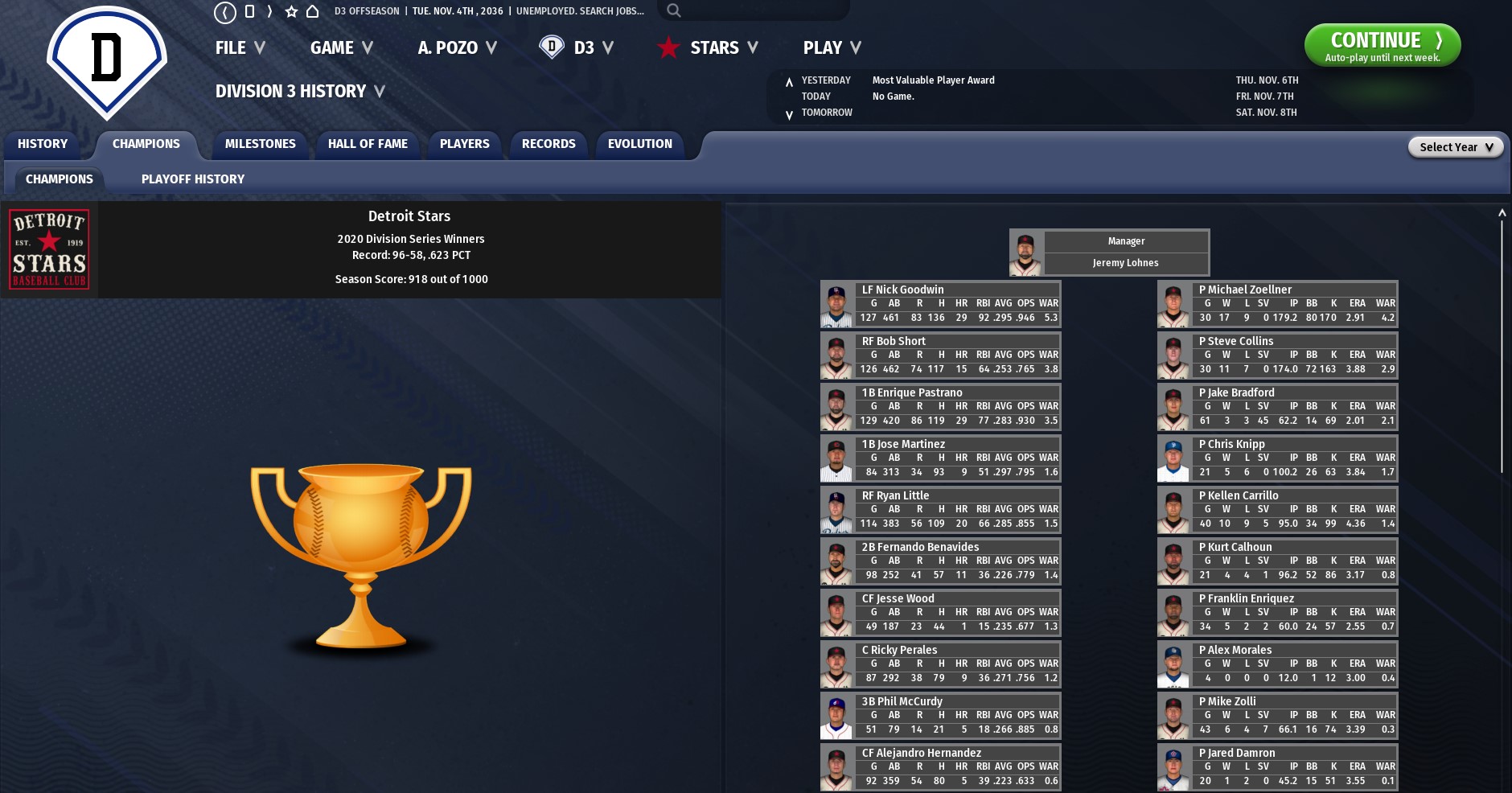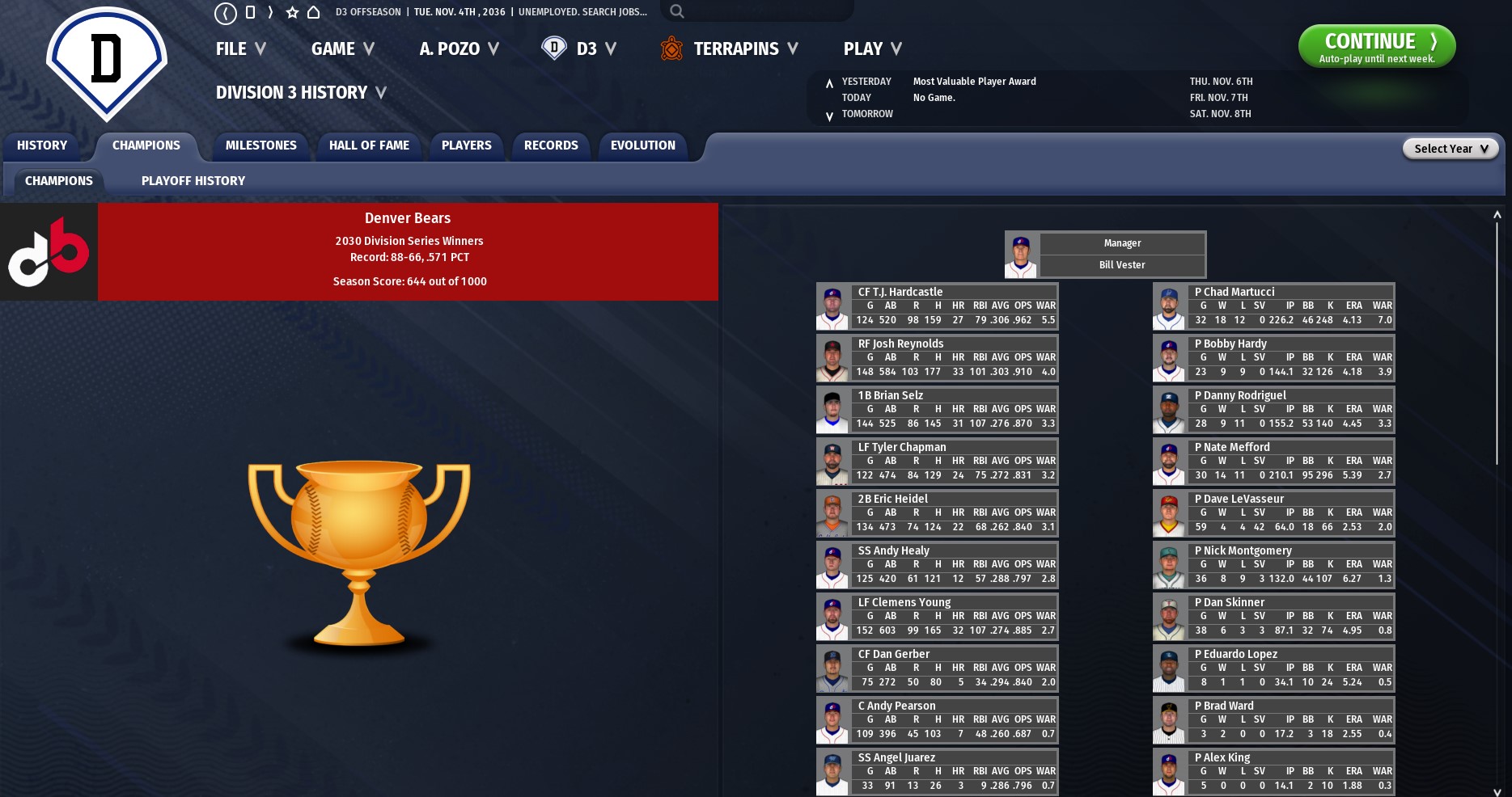 It’s Saturday, October 11, 2025, the second to last day of the 2025 NABF season, and there are four games on today. At 1pm, you watch Game 6 of the Division 4 Championship series; it’s been a good one, with the Albuquerque Dukes leading the Charlotte Hornets three games to 2. It’s a tight contest through 7, but now the Dukes have the bases loaded, though they’re a run back of Charlotte. There are two outs, but the light-hitting shortstop Steve Willis is up; he’s only had two singles during the series and has struck out 7 times. The count runs to 2-2. Then, a fastball, away. Willis lunges and manages a bloop down the line - it’s fair! It bangs against the corner where the wall juts out and scoots just far enough to elude Charlotte LF Xenophon Korkoris. With one run already in, the runner at second is now being waved around - with two outs, he’d been off on contact, and now he dives, his hand sweeps over the plate as the tag comes in, and he’s safe! Albuquerque has taken the lead! They score twice more that inning, and it’s sewn up - Albuquerque takes the title in six. You flip over just in time to catch the 4pm first pitch for Division 3’s Game 7. Another tight contest - this one a smashfest. You didn’t really have a rooting interest in D4’s ALB-CHR, but this one has a David and Goliath feel to it: The Padres are looking for their fifth Championship, and second straight after promotion from Division 4 in the offseason, while Ottawa - long one of the most hapless teams in the Federation - is here for the first time. You like an underdog, and they’re certainly that, but at the moment it doesn’t look great - after a few lead changes and almost as many pitching changes, San Diego is up by two heading into the ninth. We’re in Ottawa, though, so when ace Champions reliever Doug Klutz wraps up a scoreless top half, Ottawa’s top of the order comes due. Ottawa got here through pitching and defense, but they’ve turned on the power so far this series, so it feels like there’s a chance. When CF Nick Washington leads off the bottom half with a solo shot, the Ottawa crowd erupts, and no one sits down for the rest of the game. #2 hitter Herb Phillips Ks, and Frank Flanigan grounds sharply to third, but then the great Josh Randall steps to the plate. Randall signed with Ottawa in the offseason, as good a place as any to end a career, and then he found himself along for the ride. Randall has never won a Championship, and he wants it bad - he lines a single to the opposite field. Another single, this time from the speedy young 2B Lorenzo Escobar, and suddenly Ottawa has the winning run on first. Randall is lifted for a pinch runner as Josh Henry comes to bat. Henry is just 25, and didn’t even play a full season for the Champs, but was electric in the second half, and the crowd senses it. Henry doesn’t make them wait, turning on the first pitch and sending deep, into the RF corner - it misses a homer by inches and rolls toward the right fielder Gonzalez. One run is already in, and Gonzalez comes up firing but it’s too late! Escobar crosses home standing up, into a pile of his teammates - the Champions are Champions, and in walk-off style! The exhilaration of that win almost makes you forget that the D2 Championship game 6 started at 7 - it’s already well into the third when you flip over. The Baltimore Terrapins had won an astonishing 115 games in 2025, easily the most in the Federation’s history, and their victory over Vancouver seemed an almost foregone conclusion, but they’d dropped the first game in Baltimore and had narrowly won the second. The Mounties crushed Danny Rzasa in Game 3, but the Pins came back to take the 4th and 5th, and now stood on the precipice of becoming the first team with championships in three different Divisions… but as you tune in, you see a 5-0 Mounties lead, already. This time they’ve victimized Martinez, who was brilliant in Game 2 but is on the ropes here. The Mounties add two more in the 5th, and another in the 6th; a Steve Mauck solo shot eases the pain in the 7th, but not by much. The Division 1 game is starting up soon, and you figure you can flip back here and there - if the Pins come back somehow, you’ll catch it. They don’t, and you watch the Philadelphia A’s take all the drama out of their own Game 7, vanquishing El Paso 6-2 after a two homer performance by 1B Jake Haston - he hit two earlier in the series and is an easy selection as series MVP. You watch until he finishes his quick shoutouts, hoisting the MVP trophy while his teammate, the great catcher Corey Cerrone, holds the championship cup behind him. Then you switch it off and head to sleep. So now it’s October 12, and only one game remains between baseball and the offseason: a Division 2 game seven between the best regular season team in NABF history, and a Mounties club whose 94 wins are hardly nothing, but still pale in comparison to that juggernaut. Or so people have said, anyway: here they are, now, one win away from an upset victory over a superteam. And it’s Rzasa, again: he’d had a terrible Game 3, which, if repeated, could mean a long offseason in Baltimore. Rzasa hadn’t lasted past the second inning in Game 3, but in Game 7 he manages four plus before exiting, his Terrapins leading 6-4 after a Doug Padgett bases-clearing double in the third off promising young starter Danny Pierson. Philadelphia’s manager will take heat for starting the youngster in this series, you think. Padgett has given the Pins an extraordinary series so far, but once Rzasa left things have gone awry, and it looks like that effort might be wasted as Vancouver drops two on Baltimore’s pen in the seventh, tying it up. In the eighth, they finally get to David Linder, who has handcuffed them in four scattered innings over the rest of the series, and entering the ninth it’s 7-6 Vancouver. Baltimore closer Matt Heitzman sits Vancouver down in order, as he has all 