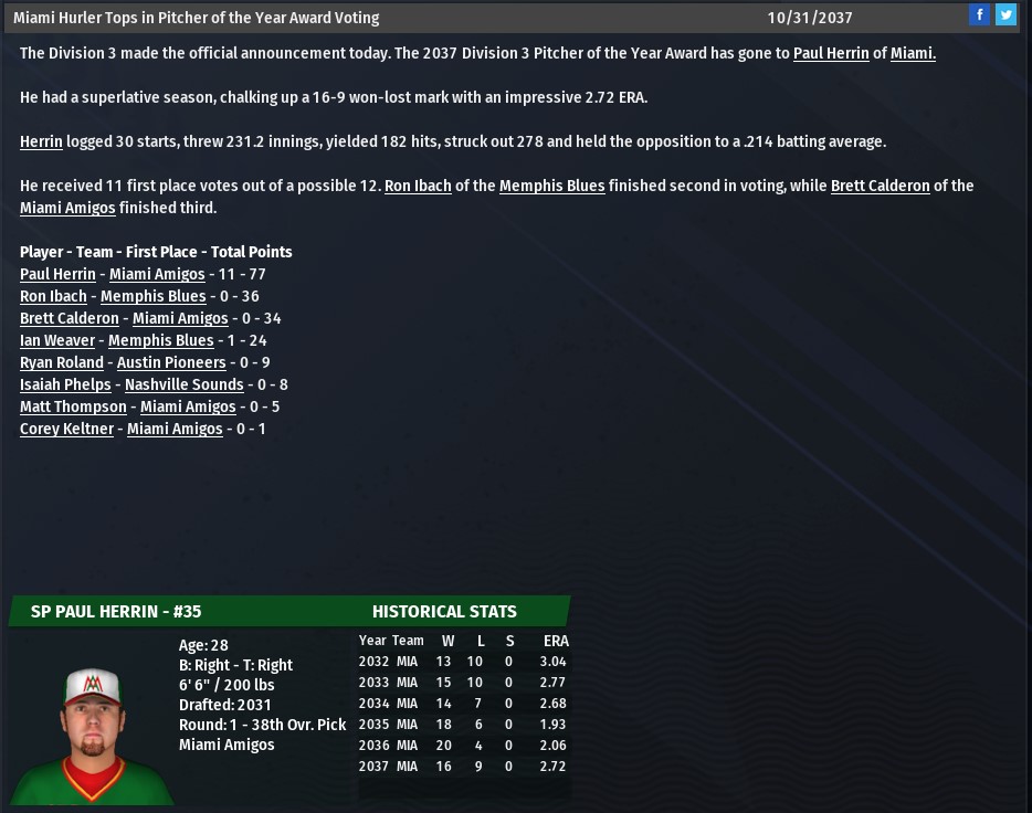 Aaron Cottrell, SP, Indianapolis Clowns Cottrell becomes the fourth pitcher (not including two-way seasons) to win the Pitcher of the Year and MVP in the same year with a stellar 2037. The Clowns ace went 18-7 with a 2.00 ERA, striking out 245 while walking only 5% of batters faced and allowing only 7 homers all season. his 7.8 WAR was tops among all D4 players. Cottrell’s Pitcher of the Year was unanimous, while his MVP was more closely contested, though he still took home half of the first place votes with the others spread among four players. Oh, and he won a Gold Glove for his defense to boot. A complete pitcher. Division 4 Reliever of the Year Makoto Morimoto, RP, St. Louis Browns Morimoto, who signed with Cleveland after the season ended, led D4 with 42 saves while striking out 80 batters in 75 innings. His 2.42 FIP and 59 FIP- were the best in the Division among relievers, as was his 2.7 WAR. Division 4 Rookie of the Year Greg Smith, SP, Indianapolis Clowns As if the Clowns needed more great pitching, here comes Greg Smith: the 23 year old started the season in Indianapolis’s pen, earning 11 saves over the season’s first two months before being tapped for the rotation. He was outstanding there too, winning 11 with a 2.57 ERA and league best 1.09 WHIP, earning 3.8 WAR on the season. Offensive Leaders Batting Title: Ernesto Gonzales, LF, Charlotte Hornets - .350 On-Base Title: Ernesto Gonzales, LF, Charlotte Hornets - .397 Slugging Title: Ron Golden, 3B, San Antonio Missions - .570 OPS Title: Ron Golden, 3B, San Antonio Missions - .928 Home Run Title: Ron Golden, 3B, San Antonio Missions - 34 Stolen Base Title: Danny Aviles, 1B, Las Vegas 51’s - 43 wOBA Title: Ron Golden, 3B, San Antonio Missions, .392 WAR Title: Ernesto Gonzales, LF, Charlotte Hornets - 6.1 Pitching Leaders ERA Title: Aaron Cottrell, SP, Indianapolis Clowns - 2.00 Wins Title: Aaron Cottrell, SP, Indianapolis Clowns - 18 Saves Title: Makoto Morimoto, RP, St. Louis Browns - 42 Strikeouts Title: John Sayre, SP, Phoenix Firebirds - 278 FIP Title: Aaron Cottrell, SP, Indianapolis Clowns - 2.52 Shutdowns Title: Makoto Morimoto, RP, St. Louis Browns - 36 Accomplishments Albuquerque’s Ricky Peck threw only the second perfect game in D4 history, and the sixth in NABF history, in a 14 K gem against the Washington Senators on July 13. Francisco Rosado threw the NABF’s only Championship Series no-hitter when he struck out 11 Clowns and allowed no hits in Game 4 of the 2037 Series, a series the Firebirds ultimately lost. Only one D4 player hit for the cycle: Cincinnati’s Joe Hays went 4-5 with a single, double, triple and homer on July 7 vs. San Antonio. |
