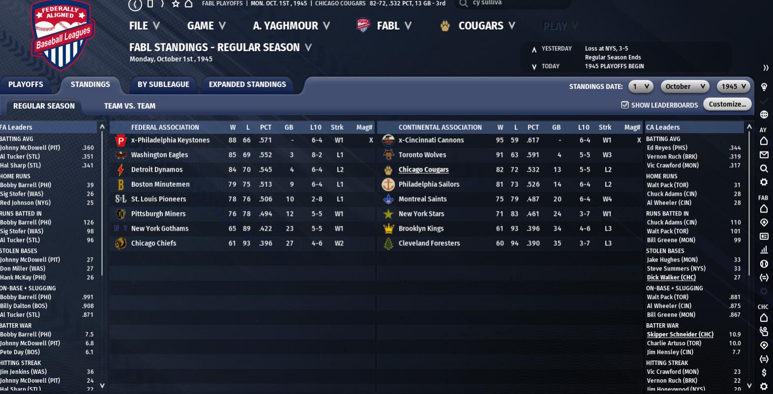 Seasonal Record: 78-69 (3rd, 13 GB) Stars of the Week None Generated Schedule 9-10: Loss at Foresters (3-7) 9-11: Loss at Foresters (2-3) 9-12: Win at Wolves (4-1) 9-13: Loss at Wolves (1-4) 9-14: Win at Wolves (8-7) 9-15: Win at Cannons (5-4) 9-16: Loss at Cannons (1-8) 9-16: Loss at Cannons (0-3) Recap And with another 3-5 week, the Chicago Cougars have been officially eliminated from postseason contention. What makes it even worse is we're barely holding on to third place, just half a game above the Sailors. We've secured a .500 or better record for the ninth consecutive season, but we're at risk of snapping our six season streak of finishing in the top three spots. Dropping both games in Cleveland was pathetic, and of course, we beat the Wolves (2) more then the Cannons (1). That helped the Cannons maintain their 3.5 game lead, as both teams finished the week an impressive 6-2. We have just four games this week and three the following week, so the boys will get plenty of rest to finish off the season. I still want to win every game left; there is both pride and a stronger draft spot at stake, so don't expect backups to flood the lineup. This week will be all about Dick Lyons, who will make his 563rd appearance and final appearance as a Chicago Cougar on the 23rd in our final home game of the season. We'll have a nice big number retirement ceremony for the beloved southpaw who is the only remaining player from the pre-human era to stay with the same organization they started with. In a season with not much to celebrate, this will be our World Series, and I hope we can win him one last game. His 237 wins are second most in Cougar history (crazy enough Harry Parker is 5th with 114), and despite not looking himself this year, he's been a dependable starter for 18 seasons. It will feel weird without him next season, but he'll be officially passing the torch to the youngsters Duke Bybee and George Oddo, and he'll have veteran Mike Taylor, his teammate for the last 13 and a half seasons catch him. Their combined 84 years and 227 days will be tough to top, and their combined leadership has helped us consistently win more then we lose. In the 13 full seasons they were teammates, we had just two (1935, 1936) losing seasons, equal to the amount of 97 win (1933, 1941) seasons during their tenure. Tough week all around, but George Oddo's likely final start of the season went pretty well. The 10 hits in 7 innings wasn't great, but he allowed just 3 runs (2 earned) and 2 walks with 6 strikeouts against a potent Cannons offense. The 22-year-old made 17 starts for us this season, an even 7-7 with a 3.02 ERA (117 ERA+), 1.17 WHIP, 51 walks, and 71 strikeouts. These were excellent numbers for the talented rookie that Tom Weinstock believes will develop into an ace. With Papenfus, the Jones Brothers, Joe Brown, Harry Parker, and Joe Brown all in line for starts next season, there's no obvious spot for Oddo. There's also Duke Bybee, who may join Oddo in Milwaukee, as he's looked overmatched so far. It's just three starts, but his two this week were very bad. The Foresters piled on 9 hits, 6 runs, and 6 walks with just 3 strikeouts in 6.2 innings pitched. Against the Wolves he walked 6 more, leaving after 7 with 11 hits, 7 runs (6 earned), and 2 strikeouts. Despite his struggles, I can't get too mad at him, as he has just 2 starts above C ball before his debut, and he hasn't pitched in years. We have so much talent in the rotation that we can afford to take things slow with Duke, who's hopped back up a spot to 6th in the prospect rankings. Pete Papenfus made a pair of starts, beating the Wolves while being hit hard by the Cannons. He went all nine in Toronto, allowing just 7 hits, a run, and 4 walks with 6 strikeouts. He fell apart in Cincinnati, just 7.1 innings with 9 hits, 8 runs (7 earned), 5 walks, and 4 strikeouts. It was his first start this season with more walks then strikeouts, but he's still struck out (47) 20 more hitters then he's walked. Harry Parker made a pair of starts as well, including our only win against the Cannons. Parker went 7 with 7 hits, 3 runs (2 earned), 3 walks, and 3 strikeouts. It was his first decision in five starts, as he couldn't top the Foresters earlier in the week. We didn't give him much support, as he left with one out in the 7th after allowing 9 hits, a run, and 3 walks with 6 strikeouts. Parker's next (and likely last) start of the season will be #35, and he surpassed 250 innings (250.2) for the fifth time in six seasons. The last start went to Billy Riley, who went 7 with 6 hits, 2 runs (1 earned), 5 walks, and 3 strikeouts. Rusty Petrick was active out of the pen, making 4 appearances and throwing 6.2 innings. He got a win and save, charged with 6 hits, 4 runs, and 2 walks while striking out just one. Mike Thorpe made three appearances but recorded just five outs, tagged with a loss, 2 hits, and a run. With just seven more games and plenty of off days, I doubt we'll need the pen much more, but I haven't yet decided if we'll bring up a few extra arms for the last week. Guys like Charlie Kelsey, Bill Tuttle, and Angel Lopez deserve a shot, but there aren't many games left and they deserve to win a Century League pennant instead of just wasting away in our pen. The lineup will get Rich Langton back this week, but that means less time for Ray Struble, who was one of two effective hitters this week. Struble went 6-for-18 with a homer, 2 RBIs, 2 runs, 3 walks, and 2 steals. The other was the red hot Skipper Schneider, who was 10-for-29 with a double, 3 (!!) homers, 2 walks, 4 RBIs, and 6 runs. That doubled Skipper's homer total for the season, and he's just a tenth of a win away from his first 10 WAR season. 25 in October, Skipper is close to finishing his six big league season, and his .291/.351/.391 (113 OPS+) triple slash could end up the best in his young career. We could technically add a third player to the list of effectiveness, as George Sutterfield made the 