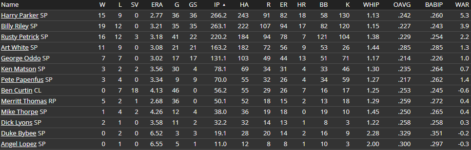 Acquired: Via Draft: 7th Round, 108th Overall (1934) Alma Mater: Bushwick Despite being a 7th Round selection, I've given a lot of love to Harry Parker in my report already. He was a guy I bet really hard on last draft, and of those picks, just last year's first Carlos Montes ranks ahead of him. I do think Pug Bryan is the better pitcher, but Parker has really blossomed in his first season with us. He's sitting comfortably in the 91-93 range with his fastball and cutter, but he has three really good secondary pitch. He also throws a curveball, the only pitch my scout doesn't think is average or better. That may not sound like much, but since we are in the 30s, the stuff ratings of our pitchers are very low. The fact that my scout says Parker has four average pitches and a good changeup, is a pretty high compliment. Parker is 20, so a little older then most high school draftees, but that's really helped him climb the ladder. The 6'6'' righty started the year in San Jose and made 9 strong starts. He was 6-3 with a 2.39 ERA (190 ERA+), 0.94 WHIP, 13 walks, and 36 strikeouts in 75.1 innings before a promotion up to Class A Lincoln. Parker continued to excel there, and even against the tougher competition was 6-5 with a 4.15 ERA (133 ERA+), 1.43 WHIP, 29 walks, and 48 strikeouts in 93.1 innings pitched. Parker's strikeout numbers are really strong and he did a great job limiting walks. Of course, there is a downside to every pitcher, and for Parker, it's his flyball tendencies. Still, I'm not even phased. He may be good enough that it won't even matter. While I'm pretty confident of nearly every player I ever draft, I don't think I've ever been so convinced from draft day that a late round pick would develop into one. It all started in the later rounds of the 1934 draft, when I was browsing the pitchers for guys with a current role of "Starter" in the pool. While that alone is no guarantee of talent, in Stats Only, you take what you can get. To be a current starter, you (generally) have to have three big league quality pitches, but very few draft eligible players ever get this high mark. While clicking through some hundred arms, I stumbled on an absolute unit of a man from New Jersey who had that mark. But what really stood out was the age; he was still in high school. I'm not sure how Parker slipped through the cracks and 107 players were selected before him, but all I can do is be thankful that we were able to snag such an outstanding young pitcher. Parker wasn't always a top 100 prospect, but after dominance at 20 in San Jose (6-3, 2.39, 36) and Lincoln (6-5, 4.15, 48) in his first pro season, Parker cracked the top 200 for the 1935 offseason. In his first two seasons, his 134 ERA+ in Lincoln in '34 was his lowest ERA+ in four stints, and he reached AAA as a 22-year-old in 1937 where he had an absurd 65 FIP- and 4.9 WAR in 152.2 innings pitched. Despite that, he returned to Milwaukee for 14 more starts, going 7-5 with a 3.79 ERA (118 ERA+), 1.21 WHIP, 24 walks, and 57 strikeouts. Those proved to be the last starts he'd ever make in the minors, and Parker got a midseason callup in 1938 at 23. He struggled, as he often does, with the longball, allowing 15 in 130.2 innings pitched, but he held his own on the mound. The intimidating six pitch righty finished 7-8 with a 3.99 ERA (99 ERA+) and 1.15 WHIP with 29 walks and 69 strikeouts. While average overall, there was plenty to be excited by, as the WHIP was great, his 4.8 K/9 was excellent, and his 2.4 K/BB was among the best in the league. From that day on, Parker became a mainstay in the rotation, and since 1939 he's put up an above average or better ERA+ in each subsequent season. As a sophomore the home run issues lingered, as he allowed a league high 36, but the durable giant went 14-11 with a 4.19 ERA (102 ERA+) and 1.32 WHIP. His K/BB dropped to 1.5, as he walked 68 while striking out 103. The 2.6 BB/9 is still the highest mark he's put together, and he's just once past 2.0 since. Year three Parker took another step forward, but still led the CA with 30 homers allowed. He dropped his BB/9 to 1.7, and finished 16-10 with a 3.67 ERA (109 ERA+), 1.23 WHIP, 49 walks, and 108 strikeouts. He cracked 250 innings (255.1) for the first time in his young career, and he led the league with 21 complete games. Parker fully broke out in 1941, where he was selected to his first of shockingly just two All-Star games, going 19-10 with a 3.19 ERA (124 ERA+), 1.18 WHIP, 66 walks, and 107 strikeouts. He once again led the league in complete games, this time with 24 in 31 starts, threw a then personal most 262.1 innings, and was a crucial member of our pennant winning staff. With Peter the Heater enlisting after our embarrassing title defeat, Parker was the staff ace, and won 21 games to go with a 2.92 ERA (113 ERA+), 1.13 WHIP, 40 walks, 105 strikeouts, and an elite 2.6 K/BB. His 0.8 HR/9 in 258.2 innings pitched. Parker was off to a similar start in 1943, working to a 2.89 ERA (113 ERA+) and 1.14 WHIP, but he dealt with a sore shoulder in May, his first injury lasting more then five days. That was a harbinger of chaos, as Parker left his 12th start of the season with a torn flexor tendon, ending his season and the Cougars pennant hopes. That brought plenty of anxiety for the 1944 season, where the 29-year-old was healthy enough to return to the rotation. There were plenty of worries about his quality, but Parker quickly silenced the doubters. Selected to another All-Star game, Parker was robbed of a much deserved Allen Award, and shockingly received just one first place vote despite having much better stats then eventual winner Butch Smith. What hurt Parker was his record, just 16-10 while Smith won 20 games, but he had an elite 2.19 ERA (159 ERA+) in 250.1 innings pitched with league best's in WHIP (0.99), K/BB (2.9), FIP- (74), and WAR (6.7) while just a few outs shy of Smith's matching 2.19 ERA. The thing was, Parker was not the same pitcher as he was p