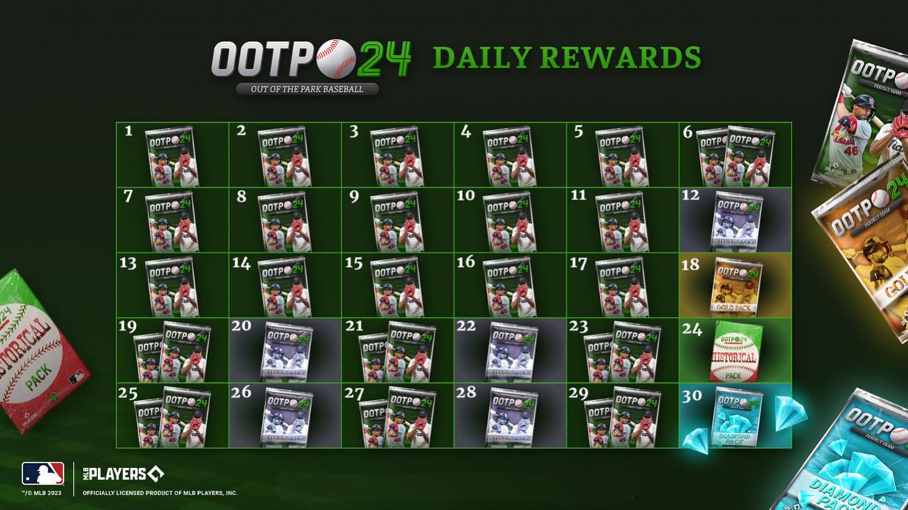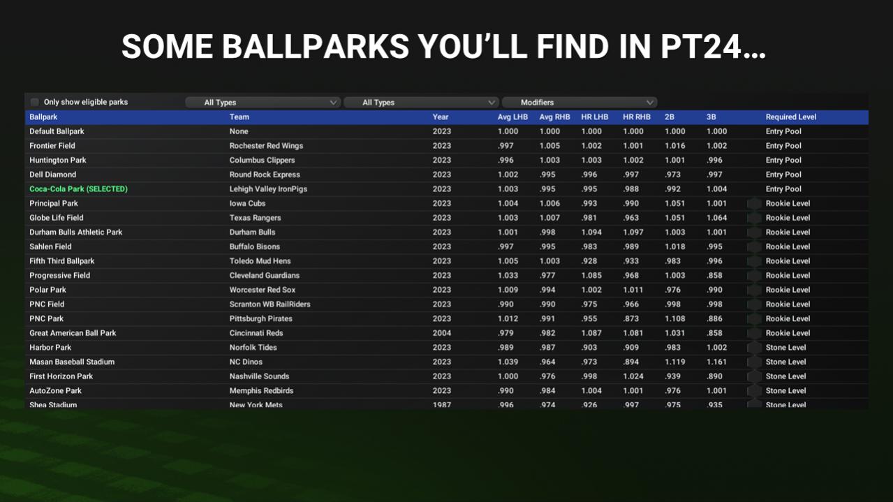 LOYALTY REWARD INFORMATION! If you've played Perfect Team in the past, we typically give packs at the start for people who've played PT for a long time. This year is no different: If you've played Perfect Team since... PT19: 3 Diamond Packs and 5 Gold Packs PT20: 2 Diamond Packs and 4 Gold Packs PT21: 1 Diamond Pack and 3 Gold Packs PT22: 2 Gold Packs PT23: 1 Gold Pack All rewards will be given out when starting your team, on the same screen as starter packs. NEW LOGIN REWARD SYSTEM! Last year, we introduced a login reward system that would reward people for logging into the game with points and packs. This year, we bring that back, but in a different way. This year, the login reward system will be a 30-day schedule, all packs, with a certain number and type on any day. See the first screenshot below for the complete schedule. The big kicker with this year's login rewards? They will not reset back to Day 1 if you miss a day. This way, you won't miss out on any of the rewards in the schedule if you take a break! BIGGER REWARDS FOR PROMOTIONS! This year, we're giving out bigger rewards for promoting your team to the highest levels of Perfect Team, with achievement multipliers and one-time rewards for your first promotion to some of the highest levels! Multipliers: 1.5x achievement PP multiplier in Gold League 2x achievement PP multiplier in Diamond League 3x achievement PP multiplier in Perfect League All other leagues will have regular PP values for achievements. One-time rewards for first promotion to higher levels: First Gold League promotion: 25,000 PP First Diamond League promotion: 50,000 PP First Perfect League promotion: 75,000 PP PITCHER BABIP IN PERFECT TEAM The new Pitcher BABIP rating, in a nutshell, shows off how well a pitcher is able to control batting average on balls in play (BABIP). The higher the rating, the better at controlling BABIP they are. The BABIP stat will feature below movement on the back of the card along with an "HR" rating, which is reminiscent of the old movement rating (basically, how good a player is at suppressing home runs). A look at what it looks like is in the screenshot from my slideshow below. Myself and Paul Sporer, our new Content Director, talk about the implications quite a bit at the 15:50 mark of the YouTube VOD - in a nutshell, there's two different factors to take a look at now when it comes to movement, and could be a big help for guys who are both groundball pitchers and flyball pitchers alike, possibly moreso for guys without big swing-and-miss stuff, to try to suppress balls in play themselves. PARTNERSHIPS! This year, Perfect Team is proud to partner with a number of different places for content in this year's game, some familiar and some new! TOPPS Perfect Team will be partnering with Topps once again this year for content, but it's going to look a bit different! This year, the Topps partnership will focus on cards based around the MLB Dream Bracket event from 2020, where 64 historic baseball teams squared off in OOTP21 to see who was the best. Cards in the Topps set will range from Iron to Perfect cards, and there will be a new and different mission structure, which will be revealed at a later date. Pulling a Topps card will also earn you a code for 100,000 coins and 10 Series 1 Baseball Packs in the Topps BUNT app! (Limit 1 code per user). The first set of Topps cards will kick off soon, so stay tuned for more! BASEBALL-REFERENCE This year, Perfect Team will be partnering with our friends at Baseball-Reference for different sets of cards throughout the year, which will feature both packable cards and missions! Stay tuned for more about this partnership in the near future! FANGRAPHS This year, we're excited to be partnering with Fangraphs for our annual Future Legend cards! The cards will be based in concert with Fangraphs' Top 100+ list, with the cards and sets to be revealed at a later date. Any Top 100+ player can show up in any set, so stay on your toes! SPECIAL PLAYER RELATIONSHIPS Perfect Team will feature three historical players, to be announced after launch, that will have special events and cards tied to them! Each of the players will have a card at every card tier, and you'll find them in packs and missions. All of the cards will have different actual pictures from that player's career, with charity events surrounding each of them! This is gonna be fun to have actual pictures of some historical legends in the game once again! BALLPARK CHANGES IN PT24 This year, PT24 will be featuring a new way ballparks will be handled. Ballparks will now be selected from a list of real and historical MLB, Minor League and KBO ballparks, each with their own park factors and a year attached! (Yes, the Default ballpark is still available.) At the beginning, in Entry Pool, you will have 5 ballparks to choose from - the default stadium and four other real MiLB ballparks. As you progress through the levels, you unlock more stadiums to choose from, no matter if you're demoted or not! Each ballpark has its own unique characteristics and park factors. A couple screenshots from the Beta of the ballpark list are attached. This will help foster more creativity, flexibility and strategy to ballparks in PT24! TOURNAMENT CHANGES IN PT24 There will be plenty of new things coming to tournaments in PT24, in all different facets! First things first, players will still have 3 regular tournament slots and 2 Perfect Draft slots, so that stays the same from last year. Daily Tournaments This year is going to put more of an emphasis on Daily Tournaments. There will be 7 categories of Daily Tournaments available, with each category having a few daily tournaments associated with them. The categories are Open, Iron, Bronze, Silver, Gold, Diamond and "Wild Card" tournaments. Each category will have its own leaderboard, similar to how leaderboards worked in PT23, with weekly prizes for how well you do! If you finish in the Top 128 in a particular category, you will q
