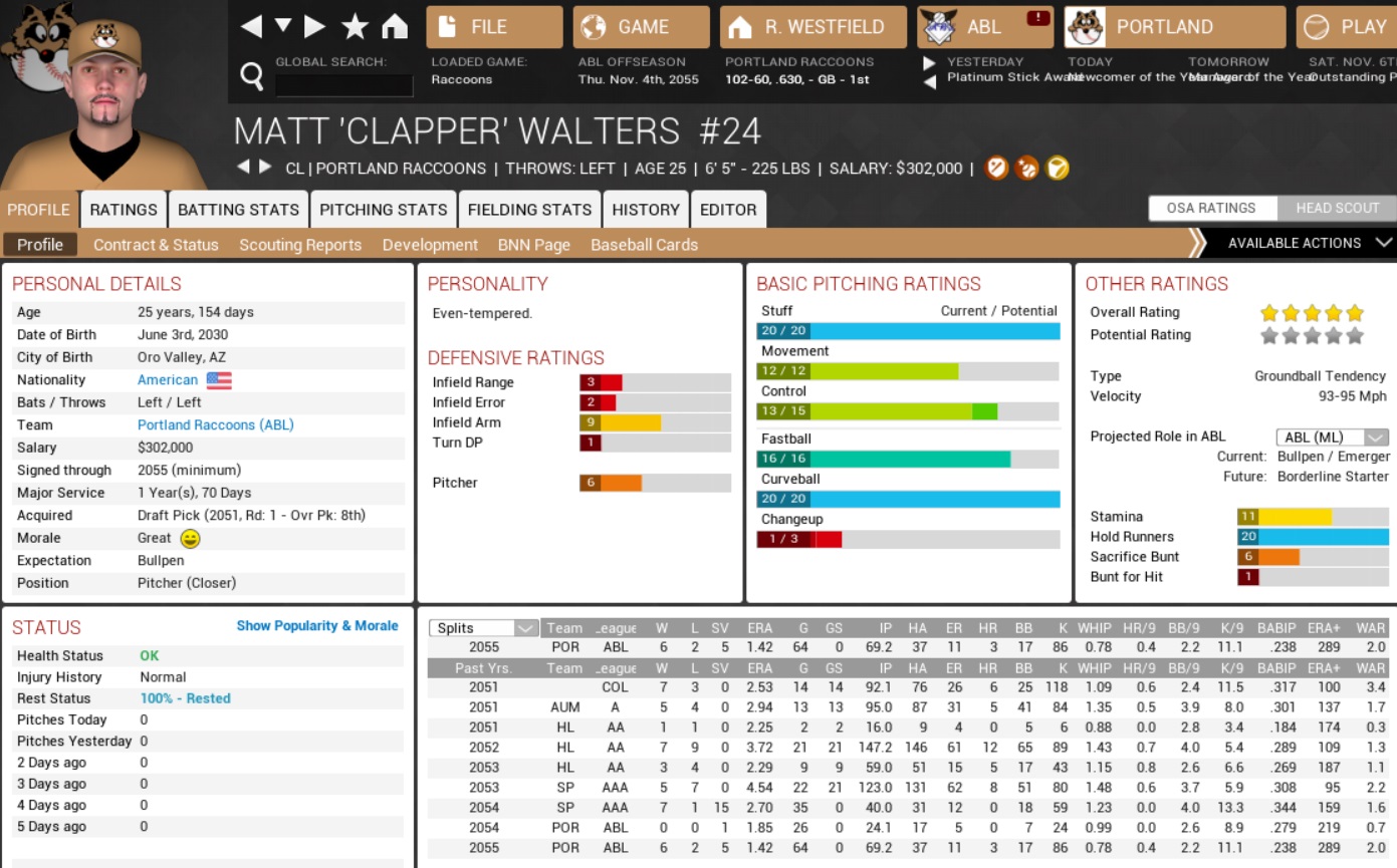 Besides that, the mayor complained about the unsavory neighborhood the ballpark was in, which was not a complaint I even understood. Right around the ballpark there was a scrapyard, three liquor stores, the city dump was just three blocks away, and just a bit up the banks of the Willamette was a wildlife preserve where birds were nesting and laying delicious eggs. What more could the Raccoons want from their ballpark infrastructure? +++ December 18 – The Loggers sign former Blue Sox closer Ryan Dow (42-39, 3.15 ERA, 207 SV) to a 2-yr, $6.7M contract. December 20 – The Knights add pitching, signing not one, but two formerly Canadiens hurlers in one go: SP Terry Herman (105-69, 3.51 ERA) gets $10.8M over two years, and CL Ruben Mendez (24-27, 3.53 ERA, 85 SV) grabs $12.2M over three years. December 26 – 36-year-old veteran ex-NYC RF/LF Danny Rivera (.282, 342 HR, 1,473 RBI) snatches a 2-yr, $10M contract with the Bayhawks. January 2 – The Crusaders secure the services of lefty closer Ben Lussier (29-36, 3.45 ERA, 169 SV) for $9.84M over three years. The 29-year-old was with the Warriors previously. January 5 – Cincinnati inks ex-LAP SP Larry Broad (57-71, 4.53 ERA) to a 2-yr, $3.34M deal. +++ What are the Raccoons doing? Well, we were trying to get a left-handed infielder to back up the left side or the guys up the middle (or, heck, both!), but haven’t been lucky so far. Ed Crispin signed with Tijuana for $710k; Adam Bates went to Washington for $482k; Tony Lopez was off to Salem for $484k; +++ HALL OF FAME VOTING RESULTS The electorate enshrined closer Josh Boles in the Hall of Fame this year. The 3-time Reliever of the Year (2027, 2035, 2038) led the league in saves twice in 2028 and 2029, both with the Raccoons, his first major league team, which signed him on a minor league contract after he was let go by the Warriors, who originally drafted him with the #59 pick in 2022. They came to regret that decision, because not only did Boles sign games with the Raccoons, but also their division rivals in Denver and Dallas during his career. In fact, Boles pitched for eight major league teams, getting at least 40 saves for five of them, and 85+ for four. In total he saved 508 games in a 19-year career, going 71-85 with a 2.94 ERA, appearing in 1,114 games and striking out 1,296 batters. He made the All Star Game 11 times, and won two rings, both with the Raccoons in 2026, his rookie season, and 2028. In fact, the greatly scattered record of Boles in terms of employers made it a bit hard to select a team logo on his plaque, but the committee went with the Raccoons, who he saved the 132 games for (most of all the teams he played for), got one Reliever of the Year award with, and won both of his rings with. Boles was the 11th player inducted into the Hall of Fame as a Raccoon (most of all teams), joining, last chronologically but first alphabetically: Nick Brown, Angel Casas, Yoshi Nomura, Tetsu Osanai, Alberto Ramos, Neil Reece, Mark Roberts, Kisho Saito, Jonny Toner, and Grant West. Full results: POR CL Josh Boles – 7th – 82.5 – INDUCTED POR LF Manny Fernandez – 3rd – 73.1 ??? CL Chris Henry – 5th – 63.6 SAL C Morgan Kuhlmann – 5th – 16.2 PIT SP Roberto Pruneda – 3rd – 10.7 BOS SP Rich Willett – 4th – 6.8 SAL 1B Bill Jenkins – 1st – 6.5 SAL CL Rico Sanchez – 2nd – 6.2 DAL SP Eric Weitz – 5th – 5.2 CHA 3B Jose Farfan – 1st – 3.6 – DROPPED DAL SS Jon Ramos – 3rd – 2.9 – DROPPED SAC RF Carlos Cortes – 1st – 2.3 – DROPPED CHA 2B Oscar Aguirre – 2nd – 1.9 – DROPPED CIN SP Willie Gallardo – 1st – 1.3 – DROPPED CHA SP Oscar Flores – 1st – 1.0 – DROPPED RIC RF Joe Ritchey – 1st – 0.3 – DROPPED ??? SP Josh Vercher – 1st – 0.3 – DROPPED