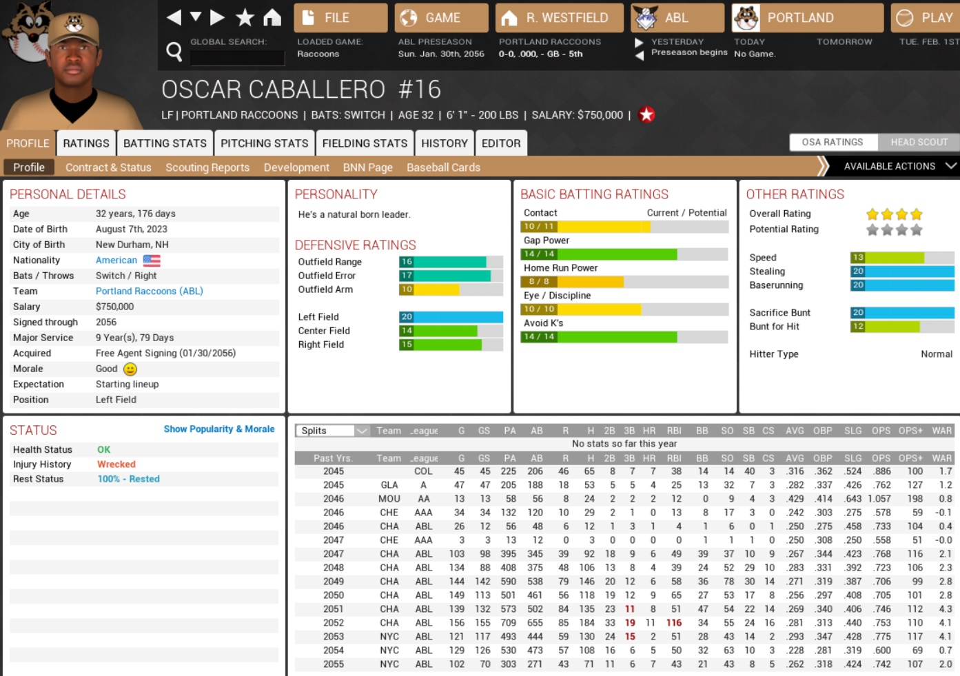 Cameron Argenziano and Craig Kniep both figured to return to AAA with that arrangement. Argenziano had long been out of options, but Kniep had one more option left for the 2056 season. The last guy on the fringes of the roster was Geoff Sather, who had no hope as a left-hander and was assigned back to AAA at this point. Unless a new right-handed catcher fell out of the sky yet, the Coons’ backstops were set, and the starting personnel in fair ground were pretty obvious. Rams, Waters, Lonzo, and Venegas on the infield, and Pucks, Royer, and Brass in the outfield. The leftovers were Daniel Espinoza, new signing-on-the-cheap Adriano Chavez, and lefty outfielder Carlos Solorzano, who had batted for a 65 OPS+ in spotty service in his rookie season. So the Coons had some breathing room in the outfield for sure. There were four outfielders in AAA that were on the 40-man roster, and that didn’t even include well-travelled Prospero Tenazes, who was a career .260/.299/.331 batter and an expert at clearing waivers, and would also turn 30 in ’56. The others were lefty corner outfielder Humberto Hernandez, who was going to be 28 in early April and had made seven appearances for the Raccoons in a spot of bother this year, but was not much of a consideration. The trio of 23- and 24-year-olds, however… OF Todd Oley had come over with Kniep from the Caps in July, and had hit .298/.356/.396 in 56 games for the Alley Cats, his first exposure at the AAA level, while also turning 23 years old within a month of his arrival in the organization. Center was the left-handed batters’ best position, although with more training to get used to the position he’d also be a frightening defensive rightfielder, possessing a killer arm to scare runners with. He also had great speed, stealing 30 bags between AA Lincoln and AAA St. Pete in ’55. It was more about *when* he’d come up this year, not *if*. LF/RF Elijah Johnson had hit .278 with 9 homers in his first full AAA season (just 14 games in ’54), and LF/RF David Flores had missed most of the year with a broken kneecap, batting .262 with 2 homers in just 42 games. Johnson batted lefty with mediocre defense, while Flores was a switch-hitter with better defense, and also a keen eye, good enough for a .401 OBP in his short season, although he was not the fastest kid on the block and had stolen zero bases in zero attempts. So one possible move was to bring up Oley, although he wasn’t pairing well with Royer, who was a switch-hitter with almost perfectly even splits. Oley’s splits were negligible in fact; it was hard to gain anything from platooning those two. The most pronounced splits among our current outfielders were actually on Pucks, who could really struggle against left-handed pitching. So, Oley spelling Pucks against southpaws and otherwise splitting time with Royer…? Don’t forget that Ramsay had similar splits to Pucks and Pucks could move to first base, too. All this was well and fine, but maybe the Raccoons could use another guy actually hitting left-handers better than right-handers… +++ January 14 – NAS 2B/SS/RF Jake Groff (.274, 10 HR, 117 RBI) retires from baseball at age 27 after two failed surgeries to properly glue his broken kneecap back together. January 15 – Indianapolis acquires SP Bill Lawrence (16-21, 4.93 ERA) from the Aces for two prospects. January 24 – SP Adam Middleton (82-61, 3.98 ERA), age 32 and most recently with the Canadiens, signs up with the Gold Sox for five years and $22M. January 29 – Another starting pitcher signs with Denver, as the Sox sign up ex-WAS Tony Llorens (80-86, 3.51 ERA) on a 3-yr, $11.84M contract. January 30 – The Raccoons sign up ex-NYC OF Oscar Caballero (.268, 59 HR, 526 RBI) to a $750k contract for the 2056 season. February 1 – The Canadiens add ex-CIN SP Martino Barbiusa (51-54, 4.01 ERA, 2 SV) with a $1.38M offer for 2056. February 11 – Vancouver also grabs former Crusaders starter Edwin Sopena (86-71, 3.70 ERA) with a hefty 5-yr, $29.7M contract. February 15 – Erstwhile Cyclones outfielder Chad Williams (.294, 77 HR, 468 RBI), 31 years old, signs a 3-yr, $5.1M deal with the Crusaders. February 16 – The Cyclones acquire RF/LF Rick Colwill (.290, 10 HR, 114 RBI) from the Scorpions for MR Taylor Stabile (55-43, 3.78 ERA, 23 SV) and a prospect. +++ Caballero is a veteran switch-hitter, playing for his pension this year, who at age 32 was still a very good defender and had extra-base power, having led the CL in triples three times in a row from 2051 through 2053. He was also better at hitting left-handers, adding to the mix the Raccoons had going on in the outfield. The downside was that he had a real knack of getting hurt and had missed 33+ games each of his three seasons in New York. To get Caballero onto the 40-man roster, which was choke-full, Humberto Hernandez was passed through waivers and DFA’ed, but there were shockingly no takers on a 27-year-old casual corner outfielder with less than two pawsful of ABL games. Raffy started throwing in the second week of February. He was now 25, off the third straight injury-addled season, and I was not at all comforted by his first bullpen in earnest resulting in Matt Fiore spending most of his team retrieving balls from the backstop. Past Dumpster Divers with new contracts: Shuta Yamamoto was back to the Caps for $950k; the Loggers got themselves Vic Scott for $470k; Eric Reese joined the Scorpions for $400k; the Knights added Ricky Jimenez for $520k;