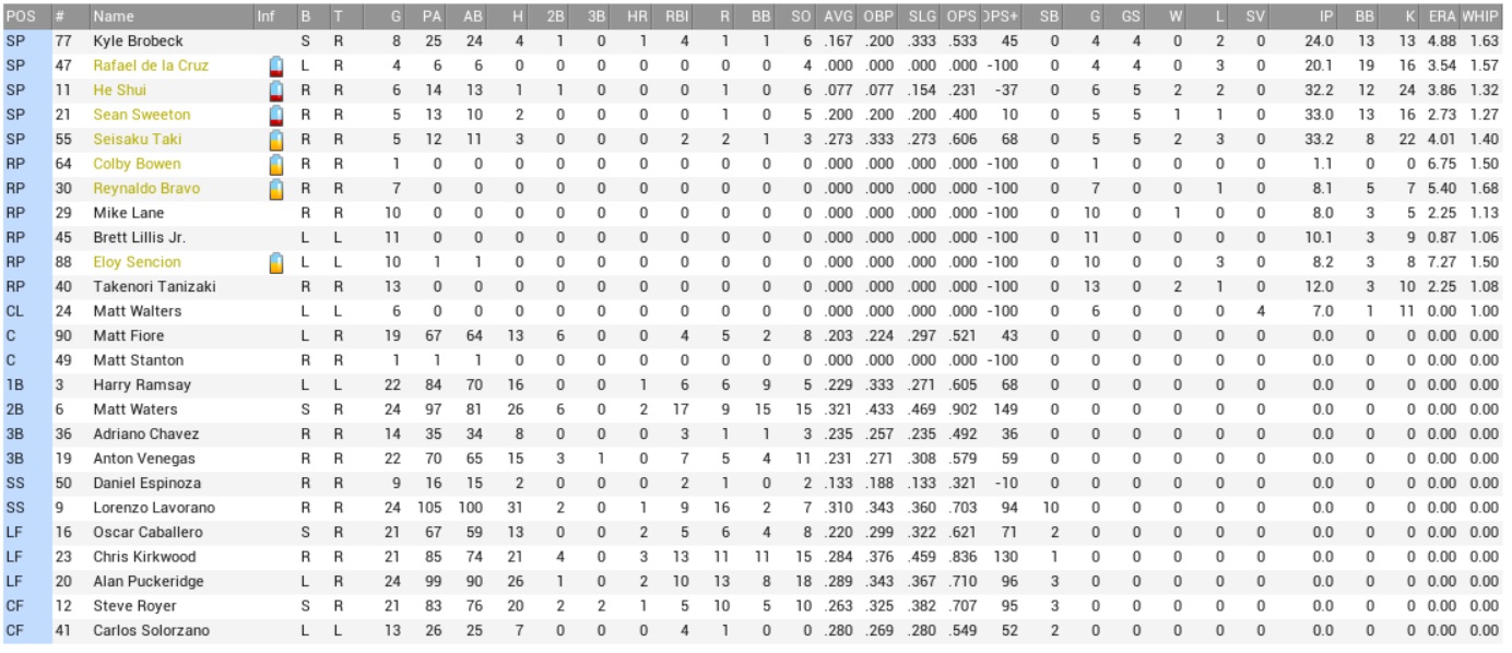 SP He Shui, 30, B:R, T:R (20-6, 2.81 ERA | 38-14, 2.65 ERA) – four pitches, a 94mph fastball, and very good control. Won Rookie of the Year and Pitcher of the Year in his first season, but had to settle for the most wins last year while Kennedy Adkins took the Pitcher of the Year award. Posted the fewest walks per nine innings (1.9) in ’55. He also does all of this silently while minding his own business. Seriously, I don’t remember him saying a word even once. Might be mute after all. SP Seisaku Taki, 28, B:R, T:R (9-9, 3.91 ERA | 50-39, 3.22 ERA) – right-handed groundballer that was imported from Japan to some success, like, uh, winning both Rookie of the Year and Pitcher of the Year in his debut season (like He Shui!), PLUS a Gold Glove. Taki has three very good pitches, throws 95, and should continue to be a delight, even though his ERA keeps creeping up every year. The good news is that he’s in a contract year. The bad news is… that he’s in a contract year (kinda, he’ll be under team control for an additional year, but at the mercy of the arbitrator). SP Sean Sweeton *, 30, B:R, T:R (17-10, 2.91 ERA | 75-57, 3.56 ERA, 1 SV) – acquired from the Scorpions in the sweeping Danny Munn trade, Sweeton brings four good pitches, a solid track record for a slumbering team, and good behavior to the plate. SP/3B Kyle Brobeck, 28, B:S, T:R (9-8, 4.41 ERA | 36-32, 4.31 ERA, 1 SV) – Brobeck is a weird, weird pitcher slash third baseman. He barely strikes out more batters than he walks, gives up long ones, often gets bogged down by the middle innings, but he’s also a career .316/.374/.439 batter that is now making a few dozen appearances at third base every season and would be a fabulous novelty star on a lesser team. SP Rafael de la Cruz, 25, B:L, T:R (4-5, 4.09 ERA | 32-32, 3.66 ERA) – golden boy returned from his torn UCL in June of 2054… and struggled all the way to the end of the season. Came back to start 2055, then tore the next stupid thing. He has made only 43 starts in three seasons, and his control has gotten progressively worse, while strikeouts are going down. He constantly seems to be in a 3-2 count, meaning his starts are short thanks to low-ish stamina, and he went only 4.8 innings per start before keeling over in ‘55. Maybe I should have traded him for goodies at some point………. MR Reynaldo Bravo, 24, B:R, T:R (0-0, 3.60 ERA | 0-0, 8.74 ERA) – good fastball/curveball, not such a great rotator cuff. Missed most of 2055 and made only a few token appearances in the Bigs over the last two seasons (11.1 IP total), but the stuff is there. MR Takenori Tanizaki, 28, B:R, T:R (0-7, 2.95 ERA, 1 SV | 0-7, 2.95 ERA, 1 SV) – that ERA and that record don’t seem to match, but somehow he was always there to accelerate a meltdown, despite walking less than two batters per nine innings. Good splitter, strong control, and maybe better luck this time. Please. MR Eloy Sencion, 29, B:L, T:L (4-2, 2.66 ERA, 1 SV | 20-5, 3.17 ERA, 8 SV) – fastball, vicious slider, and by now has firmly established himself in the majors after apparently forgetting how to pitch in 2052 and taking a nosedive all the way to Ham Lake as a 25-year-old. Pitched without many complaints last year, although of our three left-handed relievers he’s the one I’m least inclined to let run into the right-handed lumber factory. SU Mike Lane *, 28, B:R, T:R (6-5, 3.36 ERA, 2 SV | 16-10, 3.34 ERA, 10 SV) – right-hander with a fastball and curve and quite variable results as far as his K/9 goes, which has been all over the place between 5.7 and 9.3 in his four seasons as a regular with the Miners and Scorpions, from where he was acquired along with Sweeton and Royer in the Danny Munn trade. SU Brett Lillis jr., 30, B:L, T:L (5-2, 2.29 ERA, 6 SV | 15-14, 3.18 ERA, 12 SV) – second-generation lefty reliever in the Coons pen – well, whenever he’s not injured. Very steady, also against right-handers, and might split eighth-inning duties with Lane. SP/MR Fernando Salazar *, 31, B:L, T:R (4-7, 4.66 ERA | 39-46, 4.25 ERA, 1 SV) – acquired from the Warriors, where he had been doing swingman duty for all five of his major league seasons, with his 184 career games split nearly halfway down the middle between starts (97) and relief appearances (87). Three nice pitches, and a fairly persistent K/9 around eight, which wouldn’t be too bad to have in the rotation. Often pitched to a meh defense with the Warriors, so maybe we can turn him around. CL Matt Walters, 25, B:L, T:L (6-2, 1.42 ERA, 5 SV | 6-2, 1.53 ERA, 6 SV) – Rookie of the Year, Reliever of the Year without even being the regular closer, and who cares anymore whether this former #8 pick is technically a failed starter? Unhittable curve and a 94mph heater; more than five strikeouts to every walk in his 69.2 innings last year. More of that, please! C Matt Fiore *, 33, B:L, T:R (.253, 6 HR, 27 RBI | .279, 23 HR, 149 RBI) – fine defensive catcher that lost his youth on the Buffos’ AAA team and has played only one season as primary catcher with the 2054 Stars, from whom he was also acquired in trade. Keen eye, with more walks than strikeouts in each of the last three seasons, but not enough speed to play around with that at the top of the order. C/1B Tyler Philipps, 29, B:R, T:R (.213, 3 HR, 18 RBI | .236, 7 HR, 61 RBI) – excellent defensive catcher that debuted late in the 2051 season, then made the Opening Day roster behind Sean Suggs in ’52, but ended up spending most of his time in AAA again after an early demotion. Backup to Chris Gowin for two years, and currently anxiously eyeing what young Marcos Chavez is doing in AAA. 1B Harry Ramsay, 28, B:L, T:L (.312, 5 HR, 41 RBI | .282, 43 HR, 196 RBI) – missed the start of ’55 on the tail end of a kneecap injury, then didn’t hit when he returned and spent a few more weeks in AAA. Somehow has gone from hitting 20 homers in ’53 to just five in ’54, and also halved his doubles on