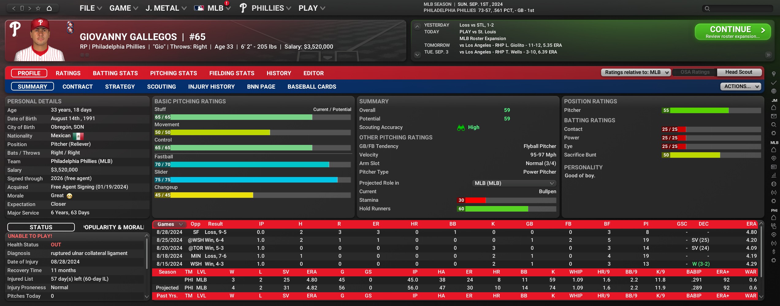 The big story though is the third injury. Phil's closer Giovanny Gallegos is out with a ruptured ulnar collateral ligament. Recovery is estimated to be about 11 months. Gallegos was dominant during the first half of the season but showed signs of slowing post All Star break. In 45 appearances Gallegos was 3-2 with 25 saves and a 4.80 ERA.