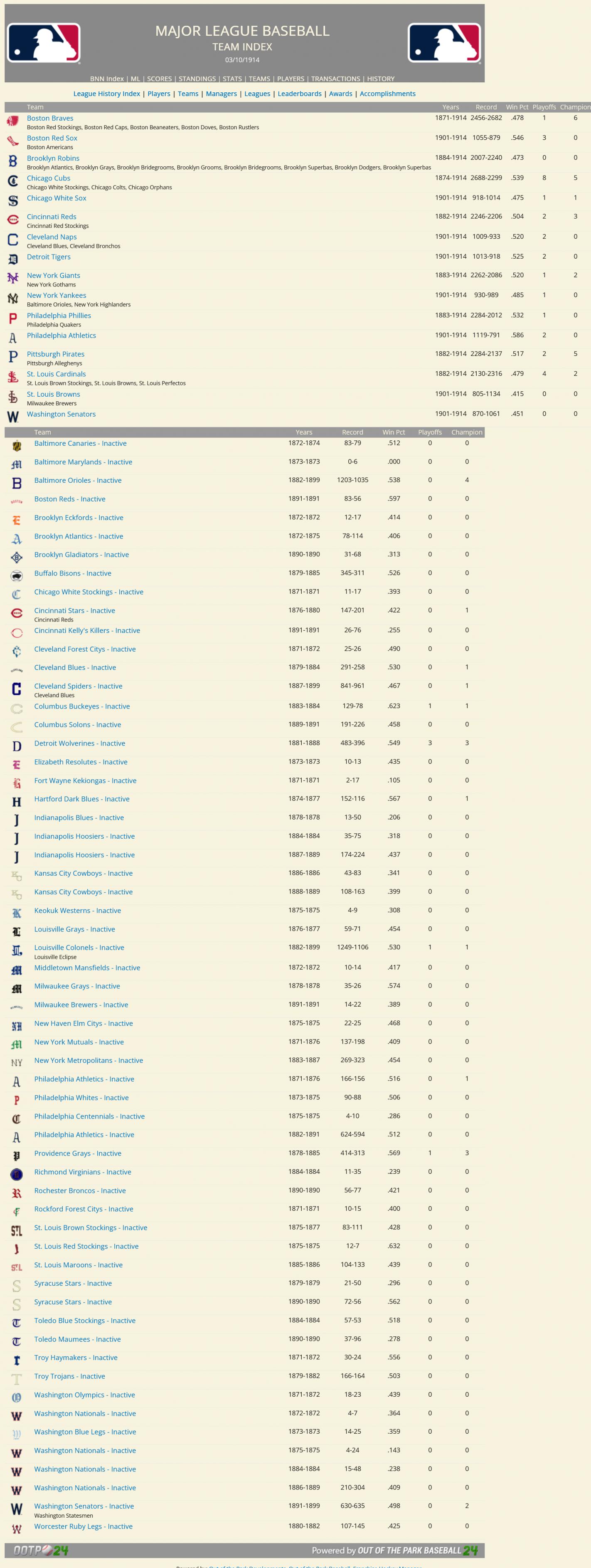 Of course you must manually change the teams and league format every seasons until 1901 or it won't work. After a season when the game created it's new structure compare with the real season and correct everything, by example in 1872 Rockford become Baltimore which isn't true so what you must do is wrote the historical team and franchise id for the Baltimore team and rewrote everything back with the Rockford info (you left both id empty since you will delete the team January first), when this is done create a new team for Baltimore with the id you wrote before. Don't forgot to move the rookie players to BAL who will be with ROK (in that case there isn't one) and don't forget to load the correct schedule and move all the teams in their correct leagues. This sound complicated but after a while you get use to it... just backup your league before the off season so you will be able to restart if you do an error. The image is all the teams who were in my league (1871 / 1913) and as you can see everything is historically accurate (except for the win/loss record and championship of course).
