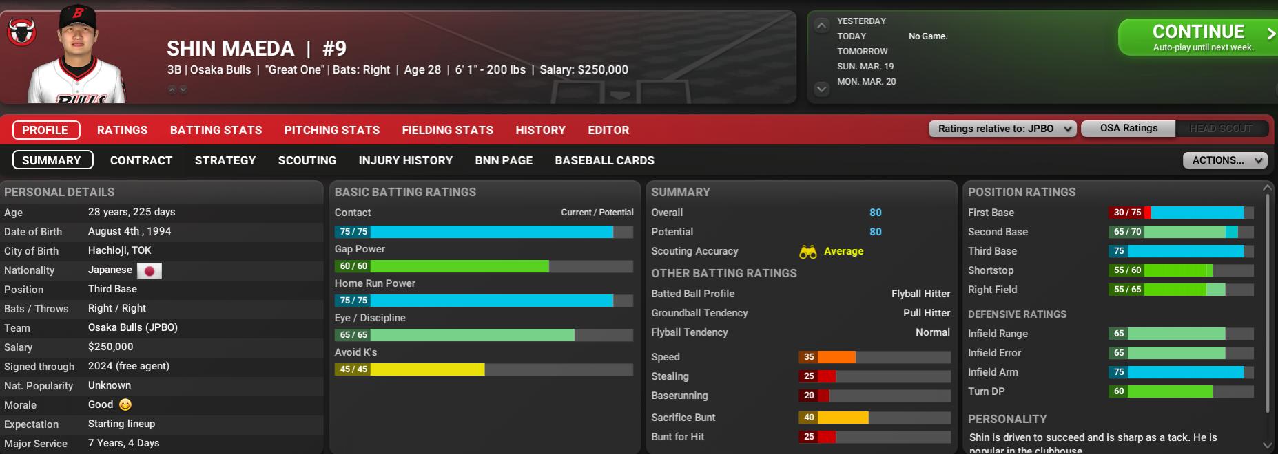 Decided to take up the challenge of righting the ship for Hiroshima (one of the worst teams in JPBO, with the lowest budget among all 12 teams). This team is in rough shape. No money. Lacks of talent. Basically I have a Seiya Suzuki clone Takao Ando who can play all over the field. And a weak Ace, ideally number 2. Masami Tanada (like Mori****a). Last edited by uknownick; 12-03-2023 at 09:57 PM. |