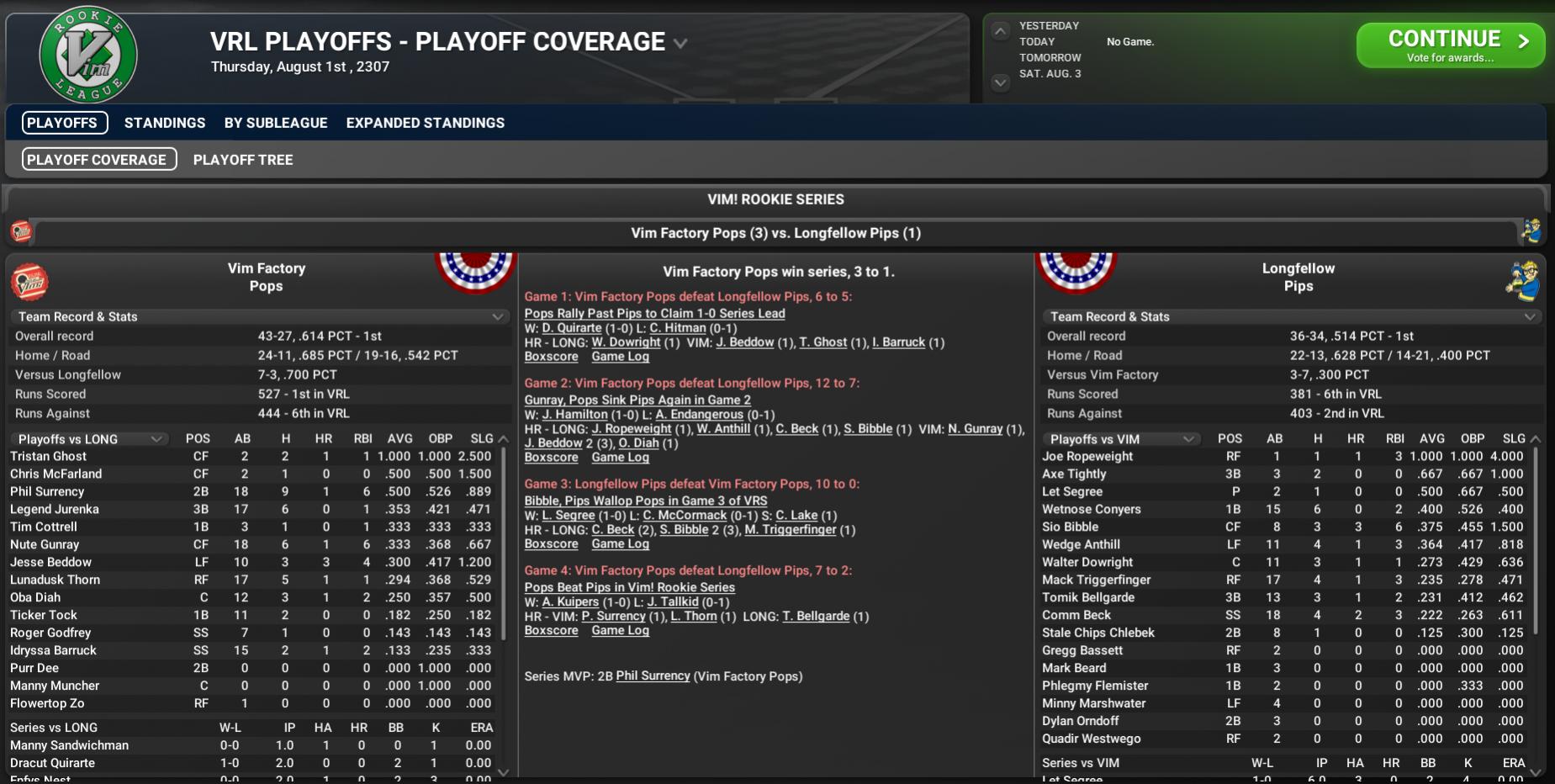 ---------------------------------------------------------- Nuka News Update Reporting on the NWL, APL, NWLR, and BBL Leagues by Evan Guy 1 August 2307 NWL Update The North Bradberton Division has become interesting, but the South Bradberton Division is almost over. With 18 games to play in the regular season, the Victory Cave Crickets and the Wild Gatorclaws are knotted at 41-31 atop the North Bradberton Division. At 36-36, Quantum is just five games back. In the South, the Cherry Ghourillas are on an 11-game winning streak, along with winning 19 of their last 21 and going 20-4 since the All-Star Break. The Ghoulrillas now have a 12-game lead and a Magic # of 7. It's a time for celebration in Grape as Ah Oona has just walked away with July's Nuka World League Batter of the Month award. He socked 39 hits in 97 at-bats to put up a .402 batting average, 14 home runs, 26 RBIs and 31 runs scored. Thus far this season Oona has hit .346 with 31 home runs, 68 RBIs and scored 72 times. It was a productive month of July for Wild reliever Will Wylde. He put up some impressive figures with 4 saves in 4 save opportunities -- figures so impressive that the Nuka World League chose him as its Pitcher of the Month. During the month, the Gatorclaws bullpen specialist chalked up 4 wins and no losses while compiling a 0.00 ERA. In 12 innings Will Wylde yielded 5 base hits, struck out 5 and walked 2. Opposing batters hit .128 against him. This season Wylde has notched 4 saves with 25 strikeouts and 18 walks in 57.2 innings while registering a 6.09 ERA and a 5-5 won-lost record. Pudding Ohnderitz is still a bit shy, but then, who could blame the newest Nuka World League Rookie of the Month honoree? He hasn't been around the league long enough to fully know the ropes yet, despite the fact that he's putting up veteran-like numbers. In July the Orange hitter tagged opposing pitching for a .394 average with 37 hits, 5 home runs and 17 RBIs. So far this season Ohnderitz has hit .331 with 8 home runs, 42 RBIs and scored 48 times. NWL Minors In the APL, we are entering the last week of the season. In the APL North, the Safari Adventure Gazelles (Wild) have a large enough lead that they should clinch the division soon. In the South, the Grandchester Flying Ants hold a three-game lead. Tony Sanchez is not used to being associated with Batter of the Month-caliber players, but today the Safari Adventure right fielder joined that select company when the Amusement Park League announced the results of July's voting. Sanchez totaled 45 hits, 7 walks, 4 home runs, 26 RBIs and 22 runs scored last month to put together a .455 batting average and .495 on-base percentage. This year Sanchez has hit 19 home runs and posted a .358 batting average. It was a monstrous July for the Amusement Park League Pitcher of the Month award winner, Wee Hughie of the Grandchester Flying Ants. He put up some mighty scary numbers. Hughie recorded 4 wins and no losses in 7 starts. Throwing a total of 52.1 innings, he yielded 54 hits, mowed down 24 on strikes, gave up 23 walks and put up a solid ERA of 4.13 in a stellar month on the mound. This year Hughie has a 8-4 mark in 11 starts with a 4.66 ERA. He has given up 98 hits in 92.2 innings, struck out 54 and issued 41 walks. Opposing clubs have compiled a .275 batting average against him. The NWLRL season is now complete. It was all about winning for the Dunmore Ferris Wheels -- and win they did. There was nothing fancy in how they went about it, players said, they just prepared mentally and physically and then went out and played baseball. "We did the little things right and we did the big things right," said right fielder Burnt Almada, who was named series MVP. "Now we're the league champions." Dunmore defeated the Red Rocket Radrats by a score of 7-5 at Blizzard Park to take the series 3-2. "Sometimes you get lucky and sometimes you make your own luck," said Dunmore manager Greg Hammerberg. "We got lucky a few times, but mostly we did the right things by being prepared for each game and playing the game the way it's meant to be played." At only 18 years of age, Clyde Rawhide could very well have many more months like this last one during his career. That would be great news for fans of the Nuka Plant Electrics, as July was one to remember for the first baseman and he has captured the NWL Rookie League Batter of the Month award. On the month he hit .400 with 7 home runs, 12 RBIs and 16 runs scored. Capping off a whirlwind month in which he went 3-1 with a 1.80 ERA, Shamar Hunt was selected as July's NWL Rookie League Pitcher of the Month today. Reporters caught up with the elated Hubologist Camp starter as he left the clubhouse. "I know it's difficult for pitchers -- when you have a bad start or two, people start wondering if you've lost it. Then you ride stretches like this one for all you can. You find it easier to come to the park every day because know you're contributing to the club, not just waiting for your turn in the rotation to make up for your last start." Shamar Hunt definitely contributed to the club. He had 4 starts, throwing 25 innings, striking out 22, and holding the opposition to a .224 average. Since his debut, Hunt has marked up 12 wins and 5 losses and fashioned an ERA of 3.86. He has fanned 178 batters while pitching 174.2 innings. Vim! View Veracious, Vivacious, Vainglorious Vision of the Vim! Leagues by Vikky Vail 1 July 2307 Vim! League Update The Echo Lake Harbormen hold a five-game lead in the Fog Division despite struggling in their last 10 (3-7) to let an eight-game lead dwindle, while the Far Harbor Ghoul Whales have a six-game lead in the Harbor Division. Should the two hold on to their divisional leads, the Vim! Series would be a matchup of the Vim! League's first two champions. Dalton Farm has won the past four championships. It's perhaps an award he'll win many more times through his career, as at age 23 Angus McGuyver has a lot of baseball ahead of him. But for no