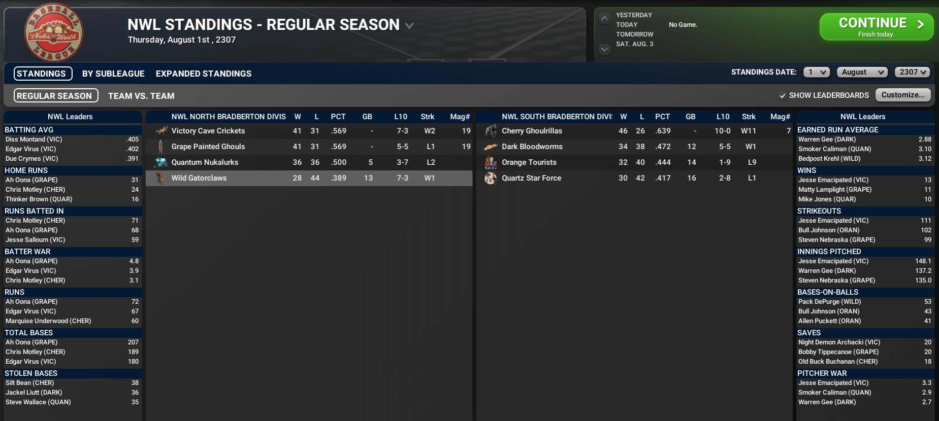 ---------------------------------------------------------- Nuka News Update Reporting on the NWL, APL, NWLR, and BBL Leagues by Evan Guy 1 August 2307 NWL Update The North Bradberton Division has become interesting, but the South Bradberton Division is almost over. With 18 games to play in the regular season, the Victory Cave Crickets and the Wild Gatorclaws are knotted at 41-31 atop the North Bradberton Division. At 36-36, Quantum is just five games back. In the South, the Cherry Ghourillas are on an 11-game winning streak, along with winning 19 of their last 21 and going 20-4 since the All-Star Break. The Ghoulrillas now have a 12-game lead and a Magic # of 7. It's a time for celebration in Grape as Ah Oona has just walked away with July's Nuka World League Batter of the Month award. He socked 39 hits in 97 at-bats to put up a .402 batting average, 14 home runs, 26 RBIs and 31 runs scored. Thus far this season Oona has hit .346 with 31 home runs, 68 RBIs and scored 72 times. It was a productive month of July for Wild reliever Will Wylde. He put up some impressive figures with 4 saves in 4 save opportunities -- figures so impressive that the Nuka World League chose him as its Pitcher of the Month. During the month, the Gatorclaws bullpen specialist chalked up 4 wins and no losses while compiling a 0.00 ERA. In 12 innings Will Wylde yielded 5 base hits, struck out 5 and walked 2. Opposing batters hit .128 against him. This season Wylde has notched 4 saves with 25 strikeouts and 18 walks in 57.2 innings while registering a 6.09 ERA and a 5-5 won-lost record. Pudding Ohnderitz is still a bit shy, but then, who could blame the newest Nuka World League Rookie of the Month honoree? He hasn't been around the league long enough to fully know the ropes yet, despite the fact that he's putting up veteran-like numbers. In July the Orange hitter tagged opposing pitching for a .394 average with 37 hits, 5 home runs and 17 RBIs. So far this season Ohnderitz has hit .331 with 8 home runs, 42 RBIs and scored 48 times. NWL Minors In the APL, we are entering the last week of the season. In the APL North, the Safari Adventure Gazelles (Wild) have a large enough lead that they should clinch the division soon. In the South, the Grandchester Flying Ants hold a three-game lead. Tony Sanchez is not used to being associated with Batter of the Month-caliber players, but today the Safari Adventure right fielder joined that select company when the Amusement Park League announced the results of July's voting. Sanchez totaled 45 hits, 7 walks, 4 home runs, 26 RBIs and 22 runs scored last month to put together a .455 batting average and .495 on-base percentage. This year Sanchez has hit 19 home runs and posted a .358 batting average. It was a monstrous July for the Amusement Park League Pitcher of the Month award winner, Wee Hughie of the Grandchester Flying Ants. He put up some mighty scary numbers. Hughie recorded 4 wins and no losses in 7 starts. Throwing a total of 52.1 innings, he yielded 54 hits, mowed down 24 on strikes, gave up 23 walks and put up a solid ERA of 4.13 in a stellar month on the mound. This year Hughie has a 8-4 mark in 11 starts with a 4.66 ERA. He has given up 98 hits in 92.2 innings, struck out 54 and issued 41 walks. Opposing clubs have compiled a .275 batting average against him. The NWLRL season is now complete. It was all about winning for the Dunmore Ferris Wheels -- and win they did. There was nothing fancy in how they went about it, players said, they just prepared mentally and physically and then went out and played baseball. "We did the little things right and we did the big things right," said right fielder Burnt Almada, who was named series MVP. "Now we're the league champions." Dunmore defeated the Red Rocket Radrats by a score of 7-5 at Blizzard Park to take the series 3-2. "Sometimes you get lucky and sometimes you make your own luck," said Dunmore manager Greg Hammerberg. "We got lucky a few times, but mostly we did the right things by being prepared for each game and playing the game the way it's meant to be played." At only 18 years of age, Clyde Rawhide could very well have many more months like this last one during his career. That would be great news for fans of the Nuka Plant Electrics, as July was one to remember for the first baseman and he has captured the NWL Rookie League Batter of the Month award. On the month he hit .400 with 7 home runs, 12 RBIs and 16 runs scored. Capping off a whirlwind month in which he went 3-1 with a 1.80 ERA, Shamar Hunt was selected as July's NWL Rookie League Pitcher of the Month today. Reporters caught up with the elated Hubologist Camp starter as he left the clubhouse. "I know it's difficult for pitchers -- when you have a bad start or two, people start wondering if you've lost it. Then you ride stretches like this one for all you can. You find it easier to come to the park every day because know you're contributing to the club, not just waiting for your turn in the rotation to make up for your last start." Shamar Hunt definitely contributed to the club. He had 4 starts, throwing 25 innings, striking out 22, and holding the opposition to a .224 average. Since his debut, Hunt has marked up 12 wins and 5 losses and fashioned an ERA of 3.86. He has fanned 178 batters while pitching 174.2 innings. Vim! View Veracious, Vivacious, Vainglorious Vision of the Vim! Leagues by Vikky Vail 1 July 2307 Vim! League Update The Echo Lake Harbormen hold a five-game lead in the Fog Division despite struggling in their last 10 (3-7) to let an eight-game lead dwindle, while the Far Harbor Ghoul Whales have a six-game lead in the Harbor Division. Should the two hold on to their divisional leads, the Vim! Series would be a matchup of the Vim! League's first two champions. Dalton Farm has won the past four championships. It's perhaps an award he'll win many more times through his career, as at age 23 Angus McGuyver has a lot of baseball ahead of him. But for no