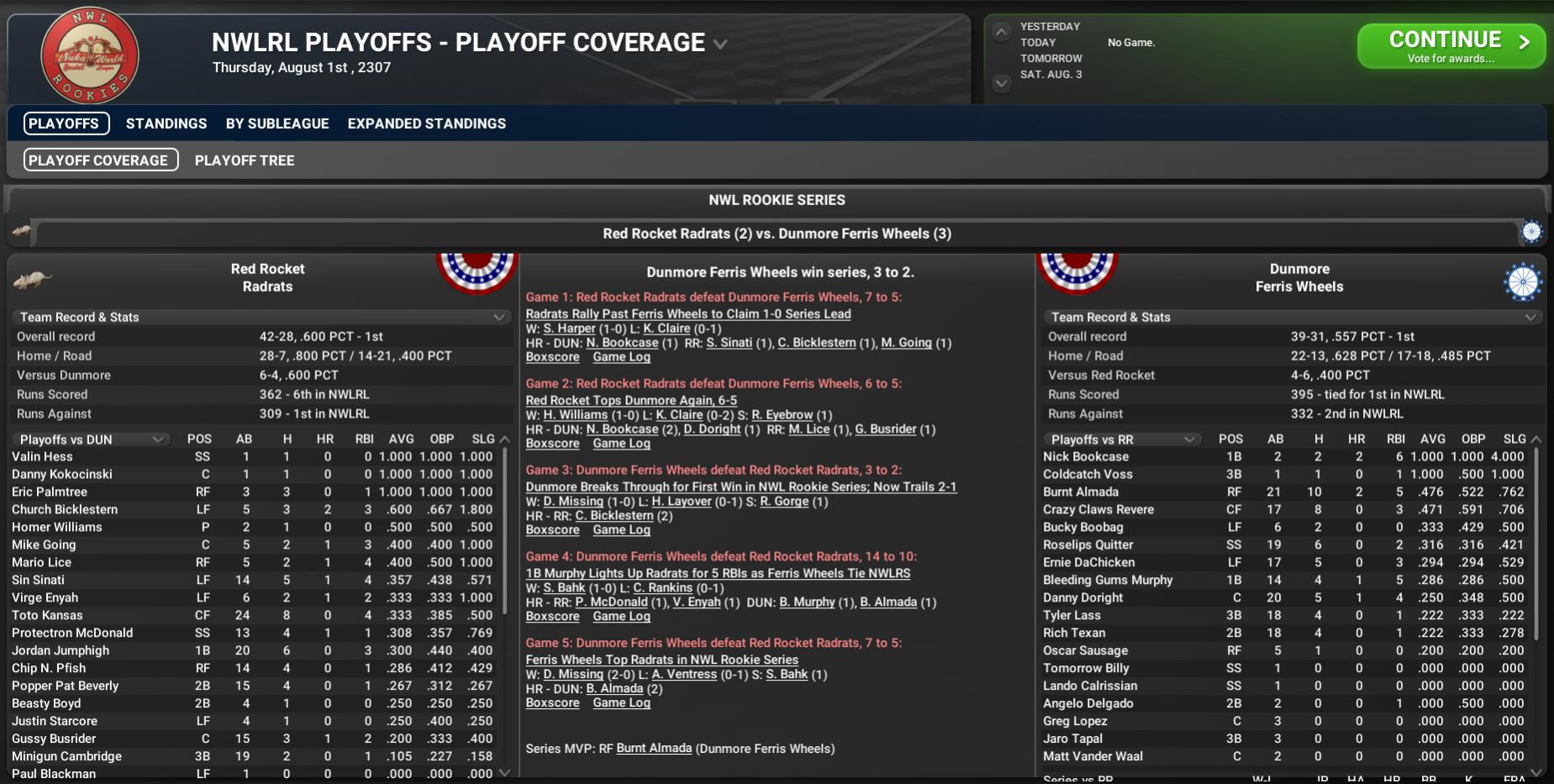 BNN Weekly Report This Week in the CBO, BMU, GBRL, and Youth Leagues by Nat Wright-Kawolski 22 July 2307 CBO Analysis The All-Star break has come and gone, and now the 2307 CBO seasons 2/3 of the way done. At this point in the season, now, teams are just jostling for spots in the playoffs. Only 10 teams can get there, though, so teams will have to decide if they want to sell out for the chance to win the Sole Survivor Season (and generate extra home revenue) or try to build for the future. The current playoff seedings look like this: NCA 1. Easy Town 2. Sunshine Tidings 3. Nordhagen Beach 4. Starlight T-5. Bunker Hill and Nahant The only change here is that Salem has been in a freefall and three teams are tied for the 5th spot. Because Nahant leads the season series over County Crossing, they hold the tiebreaker. However, the Celtics and Bunker Hill have each won three games against each other this season, tying them for the wildcard spot. SCA 1. Roxbury 2. University Point 3. Spectacle Island 4. Oberland 5. Vault 81 This association has four teams all tied at 42-38: Atom, Jamaica Plain, Oberland, and Vault 81. Because the T-51s have clinched the season series over the Dwellers, they get the 4th spot. Out of Atom and the Red Rockets, the Rockets hold the tiebreaker, but Vault 81 holds the tie breaker over Jamaica Plain, thus currently the 5th spot. Roxbury is again #1 with a six-game lead for the CBO's top record. In their last eight, the Rad Sox went 5-3, splitting with Spectacle Island (#9), winning one versus Diamond City (#16), and then sweeping Egret (#20). Sunshine Tidings is the #2 team despite being a game behind for the top record in the NCA. In the past eight games, the Chemists were 7-1, continuing a hot streak, including being 10-3 in July so far. Sunshine Tidings swept Nahant (#10), swept Fort Hagen (#19), and then won two at Lexington (#21). Easy Town is #3 with the NCA's best record after going in their last eight. The Assaultrons were 5-3 in the past two weeks. The Trons split with Starlight (#6), won two over Nordhagen Beach (#5), and then won two at Salem (#17). University Point is #4 with a five-game lead in the Minutemen League. In the past eight, the Deathclaws went 5-3 in their last eight, all series with sweeps. The Claws swept the Swatters, got swept at home by Jamaica Plain (#7), and then swept the Reapers on the road. Nordhagen Beach rounds out the Top 5 as the best of the 2nd-place teams in the CBO after a 5-3 stretch. The Party Boys swept the 75ers, won one at the Trons, and then took two over The Slog (#22). Brotherhood League Easy Town and Nordhagen Beach have distanced themselves enough that they are just battling to be the 1, 2, or 3 seed in the playoffs, with an off chance of falling to 4. Three teams--Nahant, County Crossing, and Salem--are now vying for the right to be the wildcard team to go along with Bunker Hill from the Institute League. The Assaultrons are starting to look like a beast of a team despite some struggles getting runs (6th at 398) across. They are very good at getting runners on base, currently 2nd in the NCA with a .278 team batting average. Of course, the middle of the lineup is strong with 1B Lannie Tykeson (.337/28/71) trying to repeat as the Nuka Hitter Award winner, along with 3B Dog Prairie (.328/24/64) and RF Dan Squirrel (.260/12/45). SS Rick Rolled (.255/2/31) is the only player in the lineup seeming to struggle. If the Trons figure out ways to increase their home run output and to be more efficient on the base paths, they will start to dominate much like Roxbury. Institute League Sunshine Tidings and Starlight are the only two teams above .500, and Bunker Hill is the only team near .500. The bottom half of the IL is in rebuild mode. Not much more can be said for this race other than we think what you see is what you get. The Chemists still have a chance to be the top seed in the NCA and the Killers could work their way up to the third seed. For Bunker Hill, they are close but may not be close enough despite being tied for the 5th spot in the NCA. The 75ers have just been destroyed on the mound, currently at the bottom in runs allowed (439), as well as 11th in both Starters ERA (5.05) and Bullpen ERA (5.47). Every move they make will have to be to lower those last two numbers. At the top of the rotation, SP Jason Tonelli (10-5, 3.46) is efficient enough, but their 4th starter, SP Jerry Weisman (8-10, 6.15) needs to move to the bullpen. The 75ers recently acquired the services of SP Mike Cartrette (7-6. 4.05) from The Slog, and he won his first start for Bunker Hill. He should help to stabilize the rotation, assuming he stays healthy, but they will need one more pitcher in the next week. Minutemen League University Point has seemed to have taken control of this league, so now the race for 2nd place and a potential 3rd playoff team is in full effect. Jamaica Plain has now begun to overpower teams, while Spectacle Island hangs on to 2nd place. With their last two losses, Atom has now fallen into a tie for 3rd place, which means they have to decide if now is the time to make a move. For the Cats, 2307 looked promising, but they now pretty much see themselves in the bottom half of statistical categories. Atom is 6th in runs scored (379) and 12th in runs allowed (449). When they lose, they tend to get blown out, something that makes us think they should work on finding the parts they need for future seasons. With a Starters ERA of 5.42, the Cats are last in the SCA and only better than Concord (5.67) in the CBO. Ace Tristan Marble (6-8, 4.76) and SP Kelvin Blueprint (9-3, 3.75) can have decent games from time to time, but otherwise the pitching needs talent. Atom has two pitchers in the system--Sp Baker Hubbard and SP Squirrel Bitz--who may develop into starters. At the MML level, though, all four pitchers are aging and considered at their maximum development. There are players Atom could and should move, including C Deacon Gookin 