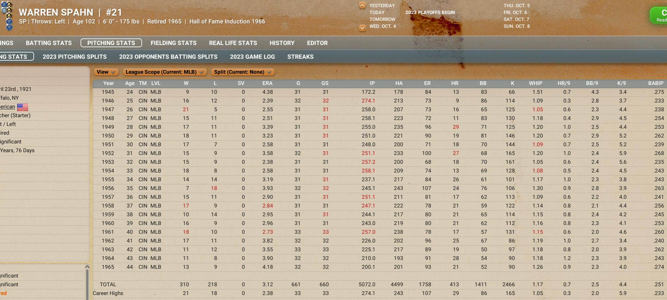 He real W-L was 363-245 during a career in which he had 4.5 R/G in offensive support. In OOTP he went 310-218 with only 3.9 R/G in offensive support. Real vs OOTP ERA: 3.09 vs 3.12 GS: 665 vs 660 IPouts: 15731 vs 15216 WHIP: 1.195 vs 1.165 HR per 9 innings: 0.744 vs 0.732 BB per 9 innings: 2.461 vs 2.503 K per 9 innings: 4.433 vs 4.375 K:BB ratio: 1.801 vs 1.747 HBP per 500 BF: 0.974 vs 1.438 Balks: 5 vs 12 FIP: 3.46 vs 3.56 Opponent BABIP: .261 vs .251 Opponent BA: .244 vs .236 Opponent OPS: .653 vs .643 Last edited by Garlon; 05-21-2024 at 07:55 PM. |
