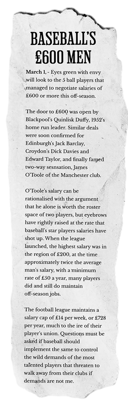 The only notable business from the British Baseball Association’s annual general meeting was the announcement that Liverpool Giants had Blackpool Excursions had signed affiliation agreements for the development of player talent with Alliance League clubs Derby Rams and Preston Rifles. Notable Free Agents Bristol Pirates beat a gang of other clubs to the signing of Matthew Jones. The 24 year-old starting pitcher had dominated in the southern amateur competitions of the past 2 years and was known to be on the radar of the London Monarchs this entire time. The right-handed Jones, with a curveball that could be considered the best in the professional ranks, opted to sign with Bristol to stay closer to his family in the Bournemouth area. Beaten to the punch when it came to signing Jones, the Croydon Capitals confirmed the signing of Billy Walsh, the 25 year-old RHP another amateur star of recent seasons, a few days later. Walsh is a London boy, and should he meet the standards expected of him, he’s sure to be adored by the Croydon support. Centre-fielder Teague Doyle signed with the Manchester Elephants, the 29 year-old centre-fielder with a powerful swing has finally got a chance at professional level. It’s rumoured his poor work ethic has hampered a professional career that could’ve started years earlier, it will be interesting to see if the Elephants giving Doyle a chance pays dividends. Sheffield born first-baseman shocked apparently shocked his family by opting to accept a deal with the Blackpool Excursions over his hometown club. The 23 year-old was noted by professional league scouts for his contact hitting and ability to get the ball in play. Players' Union Born ![]() With the financial success of professional baseball, pay negotiations to-date had mostly been conducted in a cordial and reasonable manner. However, the players do have very little bargaining power, they’re effectively tied to their clubs for life by the ‘reserve-clause’, threats of holding out and not returning for the following season or walking away completely are usually just threats. As attendances across the league exceeded all expectations, the star players that brought in those crowds had been compensated with larger salaries. Over this off-season top salaries broke the £600 mark, which caused a stir across the whole spectrum of national news outlets. As commentators started to question if a salary cap was required for the sustainability of the game, as is in place in association football, players responded by organising to protect their interests. Liverpool’s Jack Kennedy and Manchester’s Ross McCaffrey hosted several meetings to discuss unionisation at the Manchester Mechanics Institute, the birthplace of the Trades Union Congress, and Co-Operative Insurance Society. On Saturday, April 4, 2 days before players were to report for spring training, the National Union of Baseball Players' (NUBP) was born. 38-year old Jude Carroll was elected to the position of General Secretary of the union and immediately informed the London Monarchs of his retirement from baseball. By Monday the British Baseball Association wrote to Carroll to place on record that the owners had no desire or ambition to impose a salary cap. |