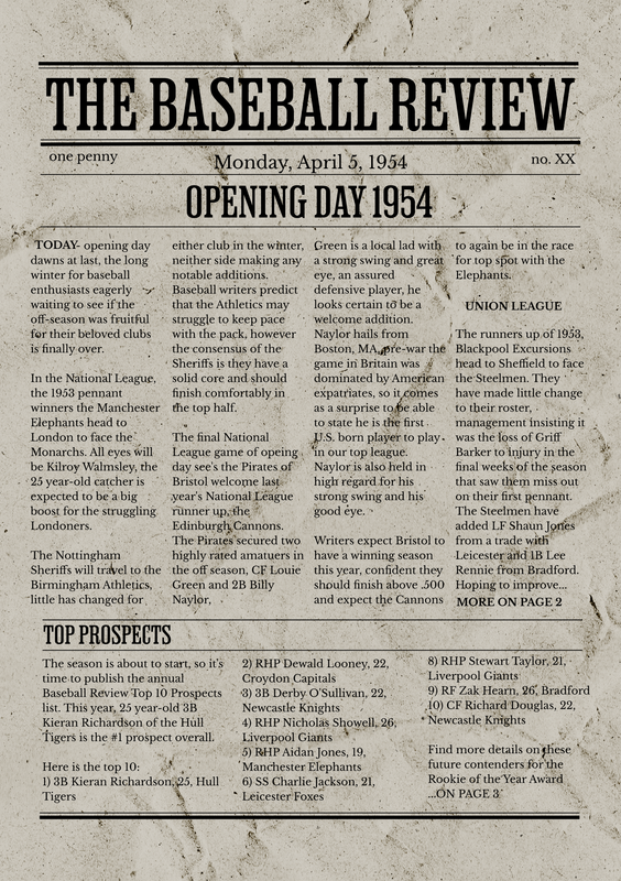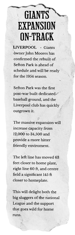B.B.A. Winter Meeting Comes to a Close Monday, November 9, 1953 End of Interleague Play. Heavy rains and icy Atlantic winds would make for terrible baseball weather, but for the annual general meeting of the British Baseball Association, weather doesn’t delay play. The biggest surprise of the meetings was a revolt against interleague play led by Edinburgh Cannons owner Donegan Campbell. A hangover from scheduling when the National League was regionally divided, Campbell was frustrated about games he considered “a waste of effort”, adding “we lose to Union League clubs, we lose ground to our rivals, we win against Union League clubs, it could be for naught…”. Campbell proposed as a sweetener; increasing to a 154-game season and using the extra generated revenue to increase the professional contract minimum salary. The salary increase would meet a known demand of the players’ union. Liverpool Giants owner, John Moores, spoke at length in the debate, most notably adding “this would bring us more inline with how our American cousins operate, and add an extra special element to the Championship Series.”. Blackpool owner Doris Thompson stated she saw no real need to make such a dramatic change to the season, going on the abstain in the vote that passed 12-3 with her lone abstention. Fans will be interested to see if the end of interleague play dramatically changes fortunes for any teams. The only other major piece of news was that 8 southern independent teams were to join the Alliance League, the league will operate as two regional sub leagues with an end of season play off for the Alliance Trophy. Rumours of further Alliance League clubs signing up to player development contracts with the pro clubs persisted throughout the week, but nothing set in stone confirmed as the meetings closed. There was no progress on a Home Nations contest, the idea stumbling on scheduling around weather and owner objections as to the risk of fatiguing players before the season has even begun. Finally a commitment was made to explore an under-18s feeder league, the proposal suggested the BBA create a county level contest by 1955 at the earliest, the best schoolboys getting called up to represent their county in an annual contest. The proposals arose from concerns that raiding amateur level clubs is not sustainable, "there must to be a commitment to the growth and development, not just of the sport but of the player" the document stated. The BBA executive and the club owners are keen to control the development of the player from school to the professional leagues. |