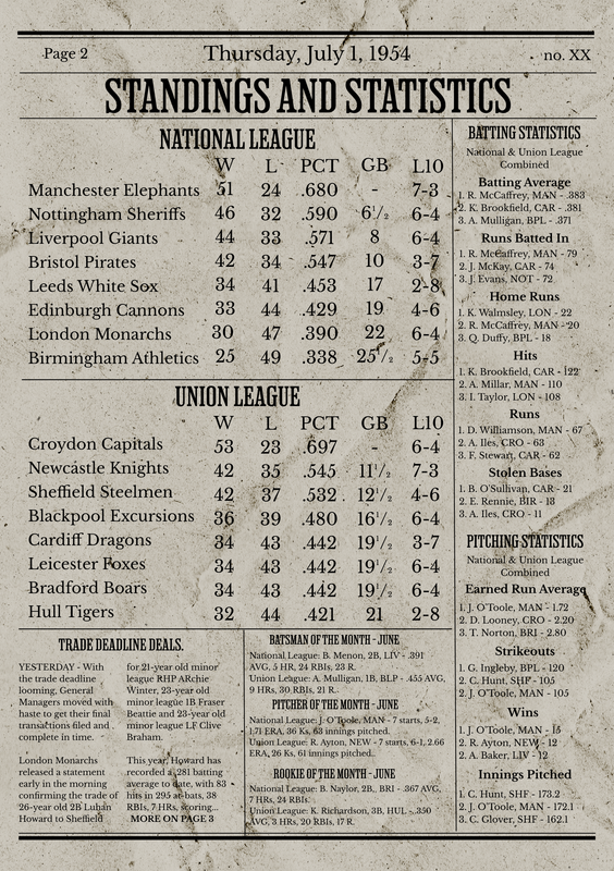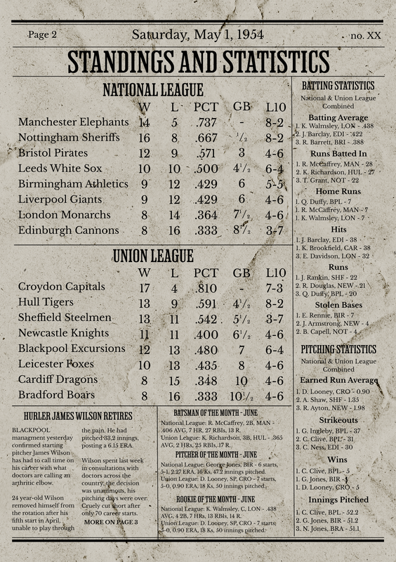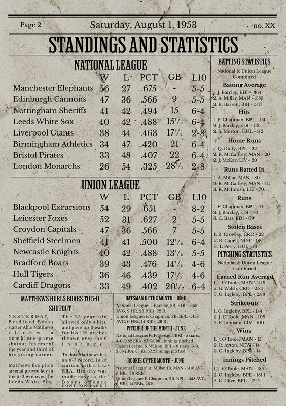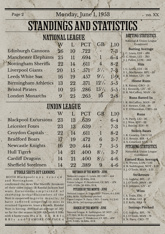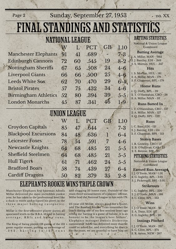 Monday, September 7, 1953 The Pennant Chase As the temperature begins to fall and the days begin to get shorter, it dawns on us clearly that the baseball season is steadily coming to its end. With 18 games now remaining the National League pennant is all but confirmed to be heading to Manchester for the second consecutive season. The Edinburgh Cannons trail the Elephants by 15 games, with a six-game series starting in Manchester today (Sept, 7), except for some divine intervention on the Cannons part, we can assume the Manchester club will celebrate in front of their own support at some point this week. Edinburgh’s star man, Jack Barclay, and Manchester’s red-hot rookie Adonis Millar will still be battling it out for the batting title and home run title. Barclay sits on .360, closely followed by Millar with .352, Barclay has 29 home runs, Millar 27. A fantastic showing from Millar as half his games are in Belle Vue Stadium, not a home run friendly park. The Union League is offering a tighter race, Croydon Capitals and Blackpool Excursions inseparable, both with a 74-40 record, the Foxes desperately trying to keep pace 6 games behind. The Capitals play their final away trip this week in Hull, then finish up in London with series against Leicester and Cardiff. The series against Leicester could prove to be pivotal in deciding where the 1953 pennant is heading. If the Foxes can return home from Croydon with a good set of results behind them, they could still be in the mix, or the Capitals could crush any hope that remains. The Excursions will first visit Newcastle before finishing their season at home with series against Cardiff and Sheffield. You would expect them to do well in the remaining games, the Steelmen likely posing the toughest ask, after a slow start they have pulled themselves up and could finish the season with a .500 record, the Dragons are propping up the league, well off pace, 29 games behind. Blackpool’s Quinlisk Duffy has had an injury free year and already past his previous season high of 31 home runs, at the time of writing he stands proudly before a 34 record, he will want to get a few more in these final few outings. He is closely followed by Thomas O’Hanrahan of Croydon in the UL, with 31. Before the Foxes go to Croydon, they’ll face the struggling Bradford Boars at home, and finish up at home against the Newcastle Knights. Rank outsiders, they will be hoping to finish up with a strong push so they can look back with no regrets. With Blackpool’s Griff Barker now out for the rest of the regular season, Foxes’ Conrad Sloan just has to keep up his current pace to secure the Union League batting title, a surprise to many to see the 32-year old, 3B at the top as we move through the final month of the season. In 1952 he featured in only 34 games, recording a .237 average. |