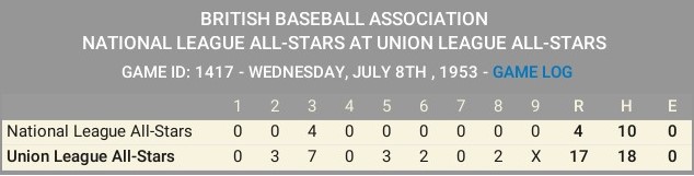 The All-Star Classic is here again! It's the 1954 British Baseball Association All-Star Game! This is a game for the fans. They choose the players that are the best at their positions. Then these fan favorites take on one another to determine which league is best. Who will be top league this season: the National League or the Union League? We'll get the answer soon.
