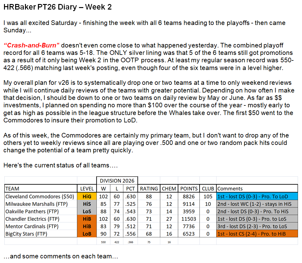 HRBaker's PT26 Diary (FTP) Not bad for Week 1. Four(4) of 6 teams ended up with 92+ Wins, were in the Playoffs, and 1 of them won the World Series (Low Gold). Two(2) of the other 3 got to the WS but choked. The other 2 teams that didn't make the Playoffs ended up in 3rd and 4th place in their Divisions. Heading into Week 2, my best team is in High Gold, 2 in Silver, and 3 in Bronze. Can't complain.