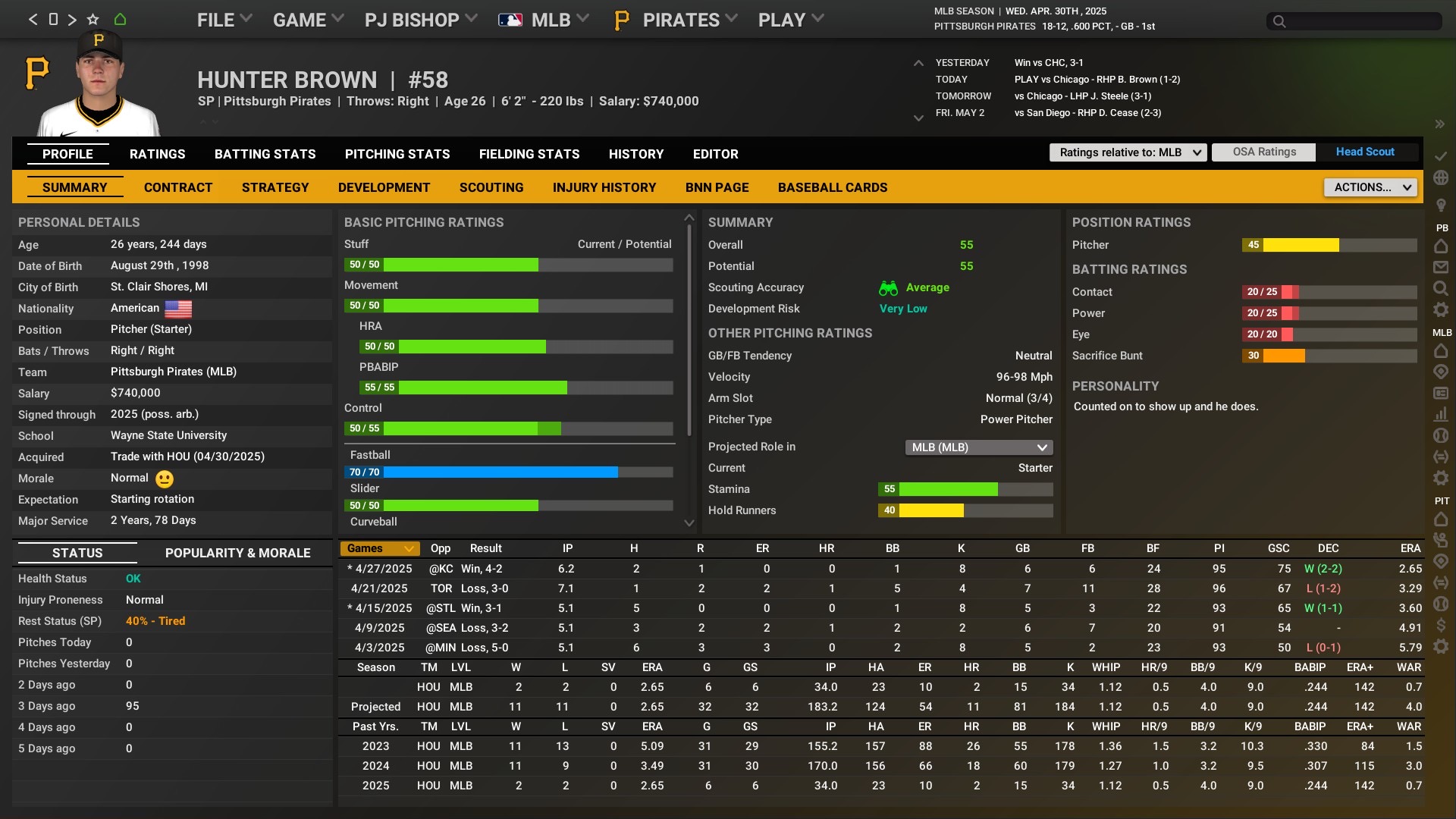 LHP Joey Wentz waived and DFA. RHP Hunter Brown placed on the active roster. He will slide into the 3rd rotation slot and make his Pittsburgh debut later today. |