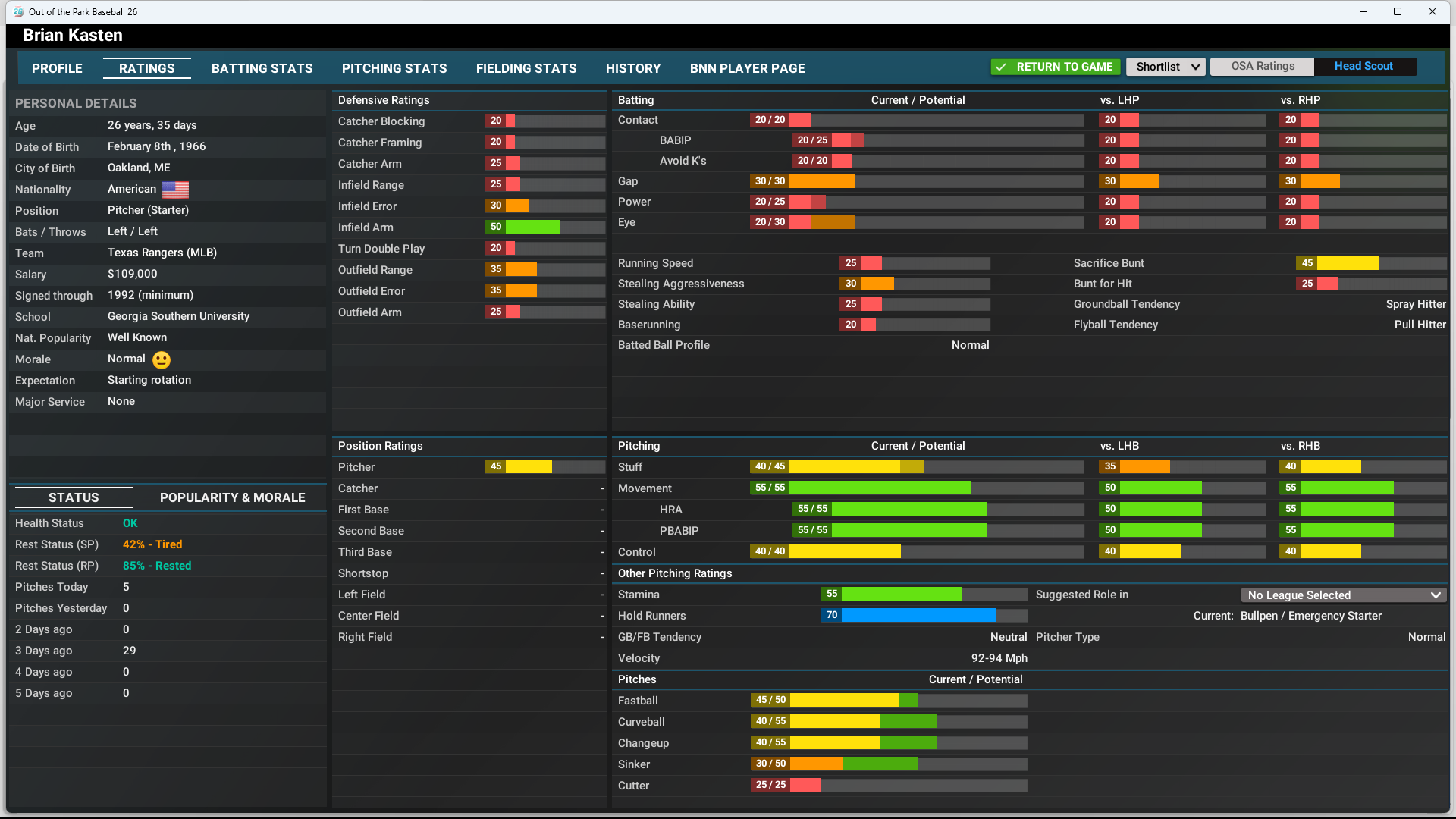 I wonder because I have a pitcher in AAA up for Spring Training with low STUFF 35. but M=55 and HR=55 and BABIP = 55. So the way I am looking at this the plyer should be a pretty good pitcher now. Thoughts? |