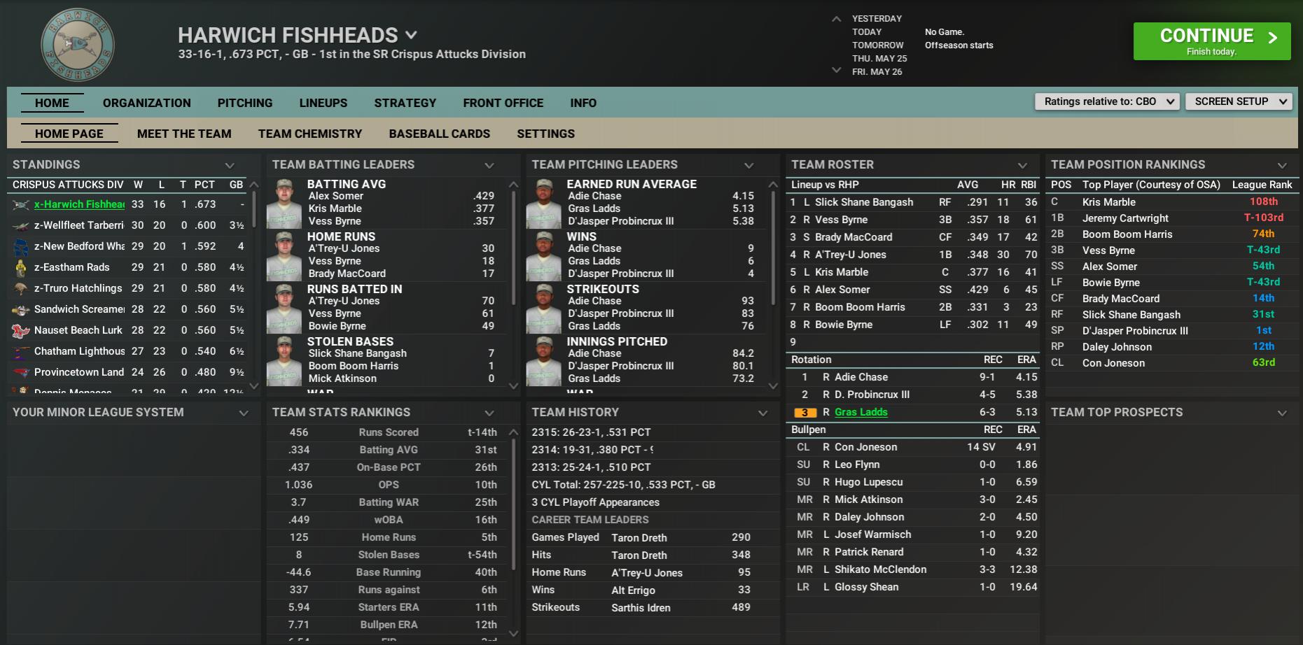 BNN Report News from the CBO, Minors, CCBL, and CYL by Nat Wright-Kawolski 22 May 2316 Fort Hagen, Vault 81 Hot; Atop CBO Both teams will be featured in our league breakdowns, so we do not want to give away too much here. What you need to know, though, is that 38 games in, the Fort Hagen Silver Shroud and Vault 81 Dwellers are both the CBO's hottest teams and their current best teams, according to records and power rankings. Here are the current team power rankings for Commonwealth Baseball Organization: Teams (Total Points, Tendency): 1) Vault 81 Dwellers (135.4, ++) 2) Fort Hagen Silver Shroud (126.4, -) 3) Glowing Sea Radscorpions (112.9, +) 4) Malden Grognaks (112.9, ++) 5) Bunker Hill 75ers (111.8, --) 6) Atom Cats (108.1, --) 7) Quincy Gunners (107.2, -) 8) Nordhagen Beach Party Boys (104.5, ++) 9) Diamond City Swatters (102.2, -) 10) Easy Town Assaultrons (102.2, --) 11) Cambridge Coursers (101.5, +) 12) County Crossing Bloodbugs (96.0, ++) 13) Concord Radstags (90.7, --) 14) Roxbury Rad Sox (90.3, ++) 15) University Point Deathclaws (89.7, -) 16) Lexington Synths (87.0, +) 17) Salem Witch Hats (85.5, ++) 18) Nahant Celtics (83.0, --) 19) Goodneighbor Hancocks (81.3, --) 20) The Slog Ghouls (79.5, -) 21) Spectacle Island Reapers (78.3, --) 22) Jamaica Plain Red Rockets (75.1, ++) 23) Oberland T-51s (73.5, --) 24) FHE Yao Guai (72.9, --) 25) Sunshine Tidings Chemists (72.1, -) 26) Egret Ninjas (69.1, --) 27) Southie Brews (58.6, -) 28) Starlight Killers (19.4, o) Brotherhood League With a weekend series win over Easy Town, the Malden Grognaks have taken over 1st place by a game over the Assaultrons. Nordhagen Beach is the only other team above .500, with County Crossing, Nahant, The Slog, and Salem all within six games of 1st place in the CBO's tightest league. The Celtics are on a current five-game losing streak that has dropped them to a tie for 4th and currently out of a wildcard spot in the playoff race. Nahant is probably getting closer to their true talent, currently 7th in runs scored (156) and tied for 10th in runs allowed (174). On offense, CF Josh Peerson (.328/5/24) has been outstanding and won a Player of the Week award. On the mound, there is a mixed bag with the Starters ERA (3.64) ranking 7th in what has been a pitcher's year. Ace Lacky Luster (3-2, 3.14) has been decent, while 4th starter, Goody Two Shoes Robertson (6-1, 1.37) looks to be in the Vim! Pitcher Award race. Institute League Like the BL, the IL had a weekend series for 1st place with Fort Hagen winning the last two to take the series and IL lead over Bunker Hill. Cambridge and Concord are also both above .500, with Lexington at .500, Sunshine Tidings 10 back, and Starlight 19 games back with a .158 winning percentage. The Shroud are tied with the Party Boys for the second-best 10-game stretch at 8-2 and now possess both the NCA's best record and a tie with the Dwellers for the CBO's best record (25-13). Fort Hagen is 2nd in runs scored (186) and 6th in runs allowed (144), showing that statistically they belong near the top. SS Nauseous Revere (.307/8/24/6 SB) is second on the team in average and first in homers, RBI, and stolen bases. On the mound, both La'Ray Kalel (4-2, 2.74) and Pollox Troye (6-1, 2.62) have been outstanding for the 4th-best starters (2.97). Closer Max Grove (12 SV, 3.38) has shown his age some but there are no better options currently in the role. Minutemen League Both Atom and Quincy have been hot as of late, while University Point went cold to drop from 1st to 3rd. The Cats lead the Gunners by a half-game. Each of Goodneighbor, Spectacle Island, Jamaica Plain, and Southie are below .500. The Brews currently hold the SCA's worst record and look to be left behind compared to their fellow 2310 expansion brethren. Southie is the only of the four currently below .500 and would pick 2nd (Cool Papa Cornwell? Malik Goodneighbor? Honey Badger Matthews?) if the draft were held today. Southie is 12th in runs scored (132) and 8th in runs allowed (161). On offense, the best hitter has been 1B Keen Sugiura (.322/7/18) who leads the team in average and home runs and is second behind RF Jimmie Dimmick (.237/6/20) in RBI. Three pitchers have sub-4.00 ERAs, led by ace Buzzcut McDonald (3-1, 3.26), but that means the Brews are only 6th in Starters ERA (3.38). Closer Killian Austin (2 SV, 2.16) took over for Hutch Wellspring (3 SV, 1-4, 7.71), who was not getting the job done. Railroad League As mentioned, Vault 81 is the CBO's hottest team, winning nine straight headed into today. The Dwellers hold a two-game lead over Glowing Sea and a three-game lead over Diamond City. The rest of the RL--Roxbury, Oberland, FHE, and Egret--are below .500. Vault 81 was not expected to make the playoffs when preseason predictions came out. Right now, though, the defending champions are by record and statistics the best team in baseball. Their demise predictions have proven to be premature. The Dwellers are 1st in the SCA in just about every offensive category, including runs scored (194). They are also 1st in runs allowed (113) and Starters ERA (2.61). Two giants with the bat are RF Pockets Wrench (.336/8/33) and C Phantom Vargas (.336/7/27). Harry Byrd (.310/4/21) has been contributing more than expected for the 38-year-old. On the mound, Zack Million (5-1, 1.78) has been one of the best, though nowhere near Glowing Sea's Alex Language (4-2, 1.26, 1st in the CBO in ERA, WAR, Ks, WHIP, FIP, rWAR, BABIP, and Opponents Avg.). Back to the Dwellers, Scruffy Taguchi (6-2, 2.50) and Exxie Summerset (5-2, 2.48) have been excellent, too. RP Clutch Hand Morello (4-1, 1.61) have been the best out of the bullpen. CBO Standings CBO Players of the Week May 15 - Josh Peerson has the tools to stick in this league for many years. The 23-year-old center fielder of the Nahant Celtics had a hot bat in the North Charles Association over the past seven days and won the Player of the Week honors. Peerson batted .536 with 15 hits in 28 at-