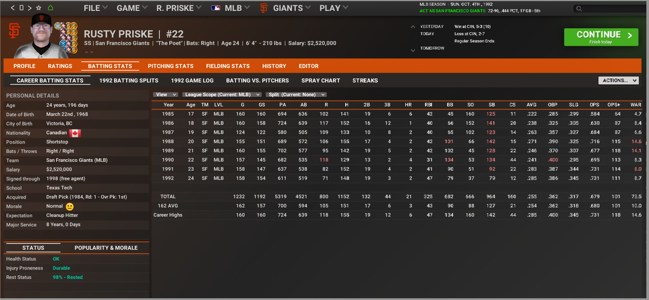 The Mets pounded the Giants, 11-3. I went 1 for 2 with an RBI single. March 13th We beat the new Rockies, 5-1. I went 1 for 2 with a 2-run double, a run scored, a walk, and a stolen base. March 14th The Pirates crushed us, 10-1. I went 0 for 2. March 15th We beat the new Marlins, 7-1. I went 1 for 3 with a single, a run scored, and a stolen base. March 16th We beat the Cubs, 5-4. I walked twice, stole THREE bases, and scored once. March 17th We beat the Padres 6-5 I went 0 for 1 with a walk and a run scored. March 18th We were shut out by the Braves, 5-0. I went 0 for 2. March 19th We beat the Expos, 5-3. I went 1 for 3 with an RBI single and a stolen base. March 20th The Reds beat us 7-1. I went 0 for 1 as a pinch hitter. March 21st We beat the Astros, 4-2 in 14 innings. I went 0 for 2. March 22nd The Phillies beat the Giants, 7-3. I went 1 for 2 with an RBI single, a run scored, a walk, and a stolen base. March 23rd We beat the Dodgers, 8-5. I went 1 for 1 with a single and a walk. March 25th We beat the Cardinals, 2-1 in 10 innings. I went 0 for 3. March 26th We lost, 2-1, to the Mets. I went 0 for 2. March 27th The Rockies shut us out, 2-0. I went 1 for 1 with a single and a walk. March 28th The Pirates beat the Giants, 4-2. I went 0 for 2 with a walk and two stolen bases. March 29th We beat the Marlins, 2-1. I went 0 for 2 with a walk. March 30th We beat the Cubs, 5-4, in 10 innings. I went 2 for 2 with a double, a single, an RBI, and a run scored. March 31st The Padres shut out the Giants, 4-0 I went 1 for 3 with a single. April 1st We lost, 7-5, to the Braves. I went 0 for 2. We went 14-16 this spring. I hit .264 with 11 stolen bases and 7 RBI. I had a .391 OBP.