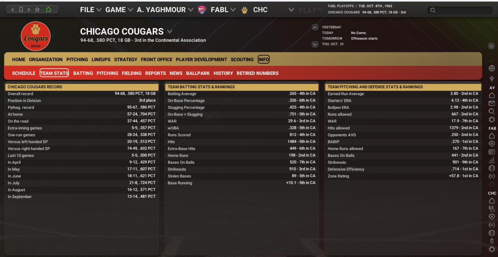 But I just can't resist. Even if all my players had bad careers and the true star of the franchise is the immortal Pug White. I just can't resist writing about the Cougars. Revivals are always exciting and I just enjoy this too much. I'm not committing to any timeline or consistency, but Figment is starting sims again next week and I have control of the Cougars for the first time since 1963 and once I got back from vacation it truly set in how excited I was. Everything is different but Roger Alford is absurd and I guess it's cool that guys like Doc Griffin, Tom Holliday, and Henry Watson are still here. A lot of weird things have happened but at least Jerry Smith was a Hall-of-Famer. I was right to give him a ton of praise when I drafted him and I'm sure every other time I mentioned him. And yes, I did trade for Morty. The current day is now January 1st, 1975, and that will continue to advance starting Monday. The organization is a mess and the Cougars suck, so despite a new franchise high in wins (99) in 1966, they haven't broke my annoyingly long playoff drought. It does start to get easier, as their are four divisions of six now, but ours contains three 95-win teams. And again. The Cougars suck. Three of the last four years have had 88 losses or more, and the only reason that '66 team was good is most of those players were guys I drafted or brought in. A relatively blank slate will be interesting, and with the 2nd ranked farm system I can do pretty much whatever I want. Our scout sucks, so I'm not sure what. But at least we have some time before the draft. This should be extremely fun even if all the stars of old are gone or on the edge. We'll see the twilight of Hank Williams career but Buddy Miller and Adrian Czerwinski have plaques. Frenchy Mack just gave it up when he got hurt. Just 33 and a year removed from his 6th Allen in 7 seasons. He could have been the best. 2,766 strikeouts, 2.66 ERA (147 ERA+), 1.09 WHIP, 3 rings, and 6 All-Stars. 89.8 WAR. All before 32. But that was it. That was it. Baseball was robbed. Okay enough non-Cougar talk. There's plenty of room for that everywhere else. Roger Alford is our new Pete Papenfus. Tom Halliday has done a great Skipper Schneider impression. And I guess we cosplay as a retirement home? Not even in a bad way either. Pair of 250-win hurlers. I can't wait to see how the chaos plays out, but the one thing I can guarantee is that I am trying to break this pennant drought. It's been far too long... Edit: I left out the best part! Pug Bryan is the manager! I drafted him back in 2021! He's 61 and just a third year manager, but it would be awesome if our former draft pick is t he one who finally ends the drought. He had a costly outing in the infamous game six extra inning loss in 1941. Just like my Blue Jays, we blew a 3-2 lead, but losing all four games by a single run was far more painful. Oh no please don't be an omen... At least we were on the road? Completely unrelated! Last edited by ayaghmour2; 12-03-2025 at 12:46 AM. |