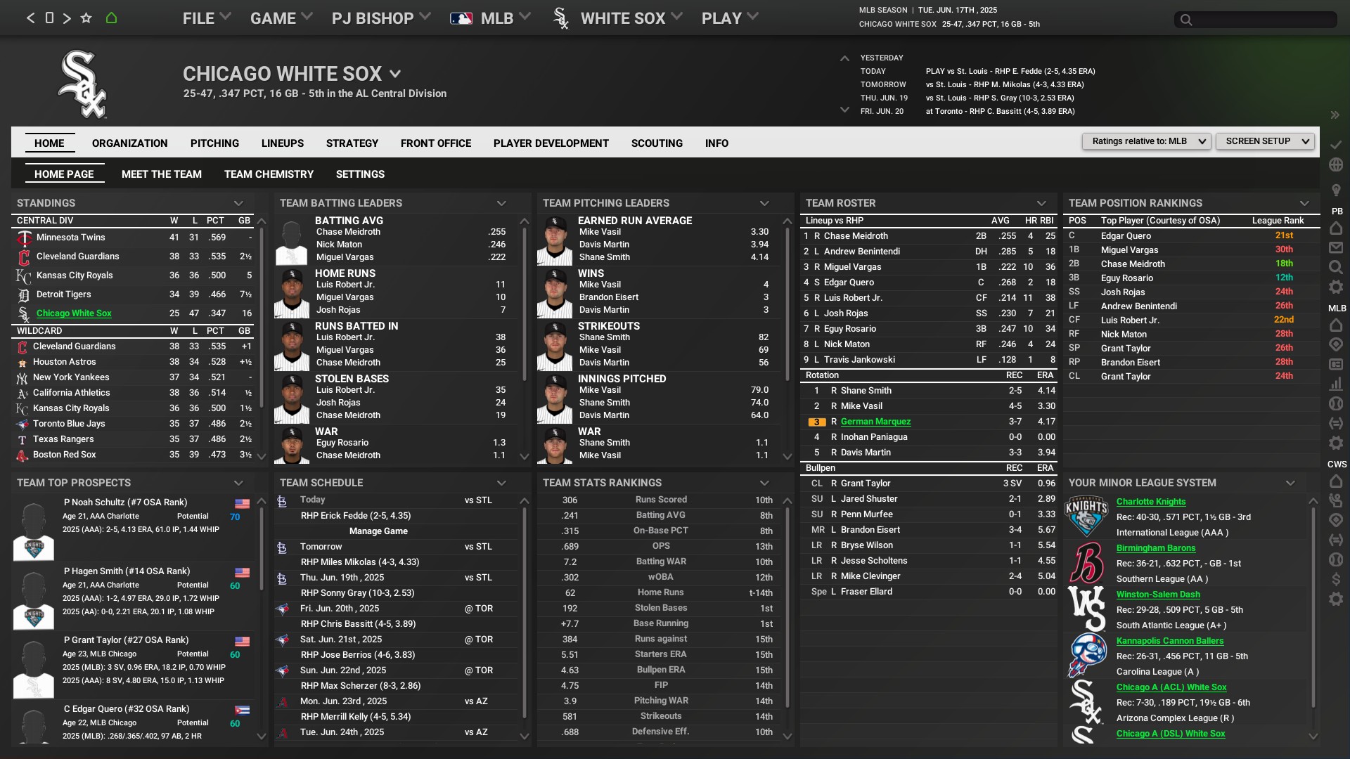 Record: 19–40 (.322), last in the AL Central, 13 GB. Pythag: 21–38, so still bad but a little unlucky. By month: March: 2–2 April: 11–15 (competent, at least) May: 6–22 (season cratered) Identity so far: fun offense + chaos on the bases, buried by the rotation. You’re oddly balanced on paper: 8th in the AL in batting average and 6th in OBP, but 14th in slugging and 12th in runs scored. On the mound you’re dead last in just about everything that matters: team ERA 5.53, starters’ ERA 6.48, runs allowed 333 (15th). Offense: OBP, kids and wheels Despite the record, the lineup’s actually a bright spot and has been reshaped a ton since Opening Day. Table-setters / core bats Andrew Benintendi: full-on bounce-back. .313/.382/.495 with 5 HR and 20 RBI in 24 games. He’s been your best pure bat and gives the lineup legitimacy. Chase Meidroth: everyday 2B and on-base monster. .260/.387/.427 with 4 HR, 18 RBI, and the team WAR lead. He’s turned into the offensive heartbeat, constantly on base and playing basically every day. Josh Rojas: maybe your most valuable all-around player: .258 AVG, .411 OBP, .447 SLG with 7 HR and 19 SB. The OBP + sneaky pop + versatility fits your “grind and run” identity perfectly. Eguy Rosario: quietly excellent at 3B, .265/.349/.460 with 5 HR and 23 RBI. One of the better bats at his position in the league so far. Edgar Quero / Eliezer Alfonzo at C: you’ve leaned into the youth at catcher. Quero has real thump (6 HR, .480 SLG), and Alfonzo chipped in clutch power earlier (4 HR, .460 SLG). Catcher was a black hole in a lot of Sox sims; you’ve turned it into a positive. Luis Robert Jr.: star in a weird season Robert’s line screams “frustrating star year”: .209 AVG, 7 HR, 19 RBI But 30 steals, leading the league and turning him into a terror even when he’s not hitting. He’s been your chaos engine: highlight-reel defense in CF, elite efficiency (1.019 DEF EFF), and game-breaking speed, but the bat hasn’t locked in yet. The running game This is the coolest part of your team: 164 stolen bases – 1st in the AL, with +5.4 baserunning runs (3rd). Robert (30), Rojas (19), Meidroth, Maton, Vargas, Jankowski, Rosario… basically everyone runs. For a 19–40 club, you’re miserable to play against because you never stop moving. Pitching: the anchor tied to your ankle The story of the season is that the arms just haven’t held up. Rotation Mike Vasil is the lone clear positive: 60.0 IP, 4.20 ERA, solid strikeout and walk numbers. Not an ace, but he looks like a legitimate mid-rotation guy. Shane Smith is your innings sponge: 55 IP, 5.24 ERA with 56 K. He keeps you in some games but also has the blowup starts. Davis Martin (4.50 ERA in 48 IP) has been “fine,” which on this staff actually makes him one of your better starters. German Márquez (7.62 ERA) and Tyler Schweitzer (12.88 ERA) are where a lot of the damage comes from. When those two start, you’re basically spotting the opponent a football score. Starters’ line as a group: 6.48 ERA, 15th in AL. That’s your season in one number. We’ve already seen specific carnage: Márquez getting obliterated in Baltimore (10 runs, 18–5 loss), Schweitzer buried by the O’s again in the finale, and a steady drumbeat of 3–5 run first innings that force your offense into chase mode. Bullpen The pen is more “stretched” than outright bad: Jared Shuster has actually handled the closer role well (3.06 ERA, 7 saves, 11.1 K/9). Penn Murfee, Mike Clevinger (in relief), Jesse Scholtens, Brandon Eisert, Bryse Wilson, Grant Taylor, Tyler Gilbert—you’ve used everyone, and the overall bullpen ERA is 4.55. When the starter hands over a lead, you’re not automatically doomed, but the pen is constantly inheriting traffic because the rotation rarely gets deep. Defense and style of play The fielding side has actually been solid, which makes the pitching numbers even more damning. Nick Maton has a 1.000 fielding percentage in RF and leads the team in games and innings out there. Josh Rojas has a +1.4 zone rating at SS—above-average range in a tough spot. Meidroth has turned 35 double plays at 2B, though he leads the team with 7 errors—young infielder learning on the fly. Luis Robert Jr. grades out as an elite CF again, topping the club in defensive efficiency. Add in the elite baserunning, and your on-field identity is clear: fast, athletic, more 80-grade chaos than 80-grade power. Month-by-month arc March / early April – Hopeful start You opened 2–2 in March and then played just under .500 ball for much of April (11–15). The offense was finding its shape—Meidroth cementing 2B, Rosario grabbing the 3B job, Rojas bouncing between spots—and Vasil plus Smith gave you a couple of credible outings a turn. There were some genuinely fun wins mixed in: aggressive baserunning manufacturing runs, Robert or Benintendi changing a game with one swing, Quero/Alfonzo providing surprise pop. May – The crash May is where the season fell into the hole: 6–22. Themes: Rotational blowups almost every series. That brutal road swing with the Mets and Orioles: You did steal a thriller at Citi Field behind a late Luis Robert Jr. bomb off A.J. Minter, but The Orioles series was a beating—scores like 7–3, 18–5, 8–3 in Camden Yards, featuring Márquez and Schweitzer getting torched and the staff giving up 35 runs in three days. By the end of May you’d cycled through a lot of pitching looks, the bullpen was overworked, and the record had sunk into “longshot” territory. June – Reset starting now You’re 0–1 so far after another loss (3–8) and heading into a set with Detroit, but the calendar flip plus some roster moves make this feel like a new phase. Notable moves and prospect churn Recent transactions: Justin Dunn released. Justin Anderson optioned to AAA Charlotte. Bryse Wilson activated from the IL and dropped straight into the long-relief mix. Prospects Braden Montgomery (LF) and Ge