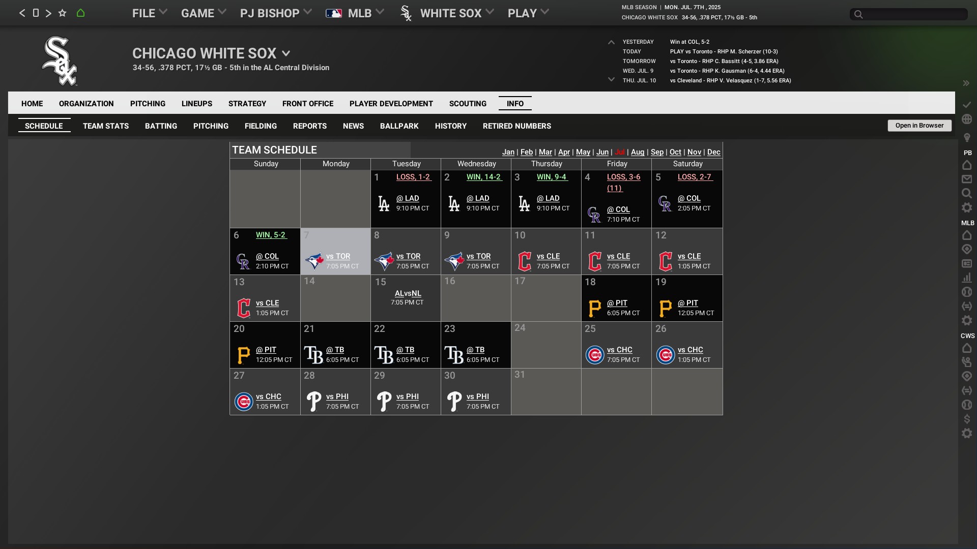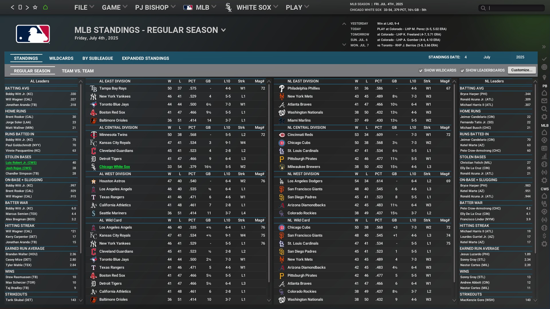 Record: 31–53 (.369), 5th in AL Central, 17 GB Big-picture identity Through three months you’ve carved out a very specific profile: Extreme running team: 218 steals, by far most in the AL, and +8.3 runs from baserunning (1st). Light on thump: .241/.316/.372 as a team – middle-of-the-pack OBP, but 14th in the AL in HR (72) and extra-base hits. Run prevention issues: 4.85 team ERA (15th), 5.10 rotation ERA, 4.56 bullpen ERA. Walks (most in the league) and lack of strikeouts have been killers. Not quite as bad as the record: Pythagorean record of 35–49 suggests you’ve underperformed your run differential and been a bit snakebitten in close games (7–13 in one-run games, 4–6 in extras). There is a clear young core emerging, but May’s collapse and a leaky bullpen dug a deep hole in the standings. Month-by-month March / April – Feeling things out (13–17) You came out of the gate 2–2 in March and 11–15 in April. The team looked like a scrappy, flawed club: Mike Vasil immediately established himself as the staff anchor, missing bats and limiting damage. Luis Robert Jr. looked like The Guy: power, speed, and highlight-reel defense in center. Eguy Rosario, Miguel Vargas, and Chase Meidroth started to settle into everyday roles around the infield. The offense got on base and ran, but inconsistent power and a shaky back half of the rotation (German Márquez, Davis Martin, Mike Clevinger) prevented any real early-season momentum. You hovered near .500 for stretches, but never put together a real run. May – The crash (6–22) May is where the season went off the rails. The club went 6–22, one of the worst months in baseball. The already-thin pitching staff cratered. Márquez’s ERA ballooned into the sixes, Martin scuffled, and the bullpen was constantly overexposed. Late-inning heartbreak showed up everywhere, feeding that ugly one-run record. Offensively, the lack of slug really showed. You could manufacture a run, but rarely bury teams with a crooked inning. By the end of May, you were buried in the division race and clearly trending toward a developmental year. June – Signs of life (12–14) June didn’t fix everything, but it at least stabilized things and gave you some positive storylines. Rotation bright spots Shane Smith put together a terrific month and was rewarded with AL Rookie of the Month. The stuff played, he missed bats, and he gave you multiple “that’s an SP2 if this clicks long-term” outings – including a strong start in the win over Arizona. Vasil kept churning quality work; his ERA around 3.00 has him on the league leaderboards and he looks like a legit frontline starter. Inohan Paniagua joined the rotation and immediately impressed – 16 IP, 2.81 ERA, capped by 6 strong innings (1 ER, 7 K) against the Giants on June 29th. Lineup taking shape Your everyday group is starting to look like a real nucleus: Luis Robert Jr. is having a monster half: 12 HR, 31 SB, and elite center-field defense. He’s near the top of the league in steals and on a 20+ HR / 60+ SB pace. Edgar Quero has quietly become one of the best bats on the team: .300+ average, solid OBP, gap power, and strong framing/throwing. He’s probably already a top-10 MLB catcher in this universe. Miguel Vargas ties for the team lead in homers (12) and extra-base hits while also playing a ton of innings at first; the bat + glove combo has been a real win. Eguy Rosario brings solid all-around value at 3B/2B – double-digit homers, some pop, and competent defense. Meidroth, Jankowski, Rojas, Ornelas and Robert Jr. fuel the running game; you’re weaponizing speed in a way almost no other team can. Kyle Teel came off the IL at the end of June and adds yet another OBP-focused, athletic bat in the outfield mix. The overall offensive line is still dragged down by black holes (Lenyn Sosa, some of the bench bats) and the lack of pure slug, but the framework of a fun, chaos-ball offense is there. The bullpen problem While Grant Taylor has been nails in the ninth (1.09 ERA, 5 saves) and Penn Murfee/Fraser Ellard have had their moments, the group as a whole has been a liability, which June made painfully clear: Team bullpen ERA: 4.56 (14th in AL) Walks are a huge issue; you’re last in the AL in free passes allowed. Multiple blown leads, including that gut-punch series opener vs the Giants. Recognizing the issue, you made a real move on June 30, flipping Nick Maton for veteran lefty A.J. Minter. He arrives with late-inning track record, above-average stuff, and fits perfectly as a high-leverage setup man in front of Taylor. The Giants series as a microcosm That three-game set vs. San Francisco at the end of June kind of summed up your season. Game 1 – 11-inning gut punch (5–4 L) You clawed back from 2–0 and then 4–2, with Luis Robert Jr. delivering a massive game-tying two-run double in the 6th and some wild baserunning + sac-fly chaos in the 8th to tie it 4–4. The pen couldn’t slam the door; the Giants cashed in the Manfred runner in the 11th, and you went quietly. A textbook “played well enough to win, but bullpen/late execution cost it” loss. Game 2 – Walk-off resilience (6–5 W in 10) You jumped Verlander early and carried a 3–2 lead into the late innings. Logan Porter’s 9th-inning homer off Grant Taylor tied it, but the offense punched back in extras: Eguy Rosario’s RBI single and Josh Rojas’ sac fly tied and then nudged you ahead. Andrew Benintendi capped it with the walk-off single in the 10th. A rare game where the lineup bailed out the pen and you actually stole a close one. Game 3 – One bad inning, no comeback (8–3 L) Inohan Paniagua was brilliant for six innings, holding SF to one run. Then the 7th and 8th turned into a bullpen horror show: the Giants dropped a 5-spot in the 7th and added on in the 8th with homers from Sergio Alcántara and Willy Adames. The offense wasted an early three-run shot from Lenyn Sosa and finished with just five hits. You leave