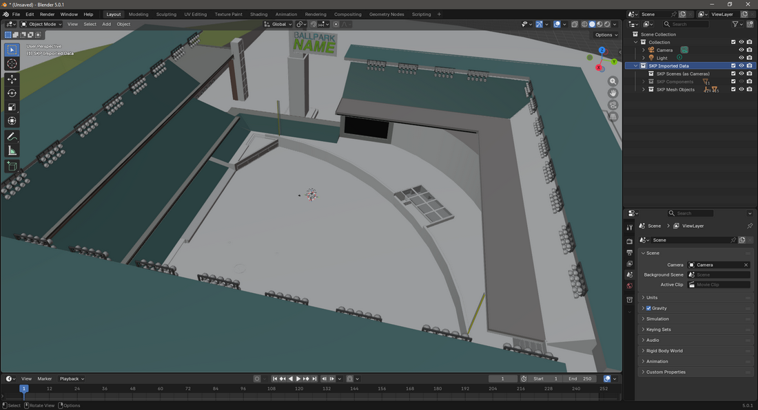 I'm generally looking for a ballpark and stumbled across one on 3D Warehouse. But in fact I can't even have a proper look at it lol It comes as a SketchUp .skp file, which won't import into SketchUp Make 2017 because it says it's created with v2024 or something, hence v2017 can't open it. (I'm not going to install/buy a newer version of sketchup, only because of this...) Now I've updated Blender to v5 (I was on v2.9), because there's that .skp importer addon which I also installed. And it's indeed importing the .skp, but it's not really looking right, seems to me textures are missing or something... So, does anyone know how I could just have a proper look at the damn thing??? ![]() When it comes to Blender, it could be just a user error, I'm anything but a pro with 3D stuff. Haven't used it since v2.9, that's probably several years... This is the link to the park at 3D Warehouse --> https://3dwarehouse.sketchup.com/mod...t-MLB-Ballpark By the way the 3D view there isn't working either. |