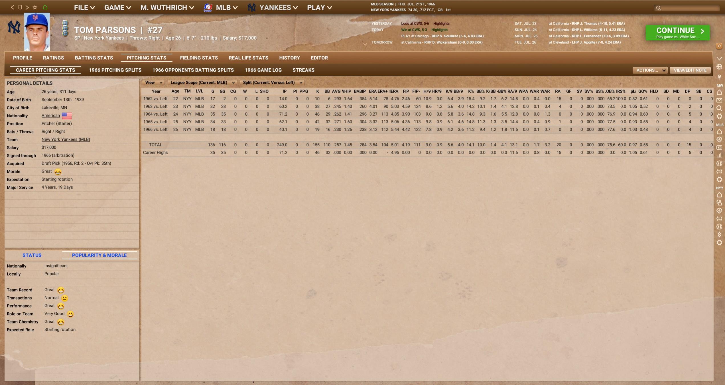 I am pretty new to baseball but i am trying to learn concepts that will help me pitch smarter with what i got when i don't have other options. I am playing an historical game, but with player recalc off and development/coaching on and TCR to 105. In my world Tom Parsons seems to be a perfectly good 3-5th SP. He really looks to be having quite the season thus far too. I can see though his BABIP it is way below its historical levels (so is he just on a good run so far dice roll wise?) and i can also see from his splits he is very good against righties but only so-so against lefties. Are there any in game levers i could pull that align with real baseball tactics on how i'd maximise this guys abilities and minimise risks (lefties) without having to micro manage and watch every pitch of every game ( all though i mostly do that anyhow). My initial thinking and again i have no way if this is legit baseball tactics or whether i'd be booted up the arse for suggesting it - if he's susceptible to lefties, is that weakness more likely to be exposed under fatigue or through repetition or in higher-leverage situations later in games? My thinking is maybe with his stamina, 55 - which is fine but not marathon man - i pull him after two goes through the lineup? Is this heresy or enough within boundaries of baseball realism that you'd tell me to 'give it a go a and see what happens'? I don't want to exploit the game - just try and respond in a tactically appropriate way...cheers in in advance for any baseball knowledge i can pick up here. |