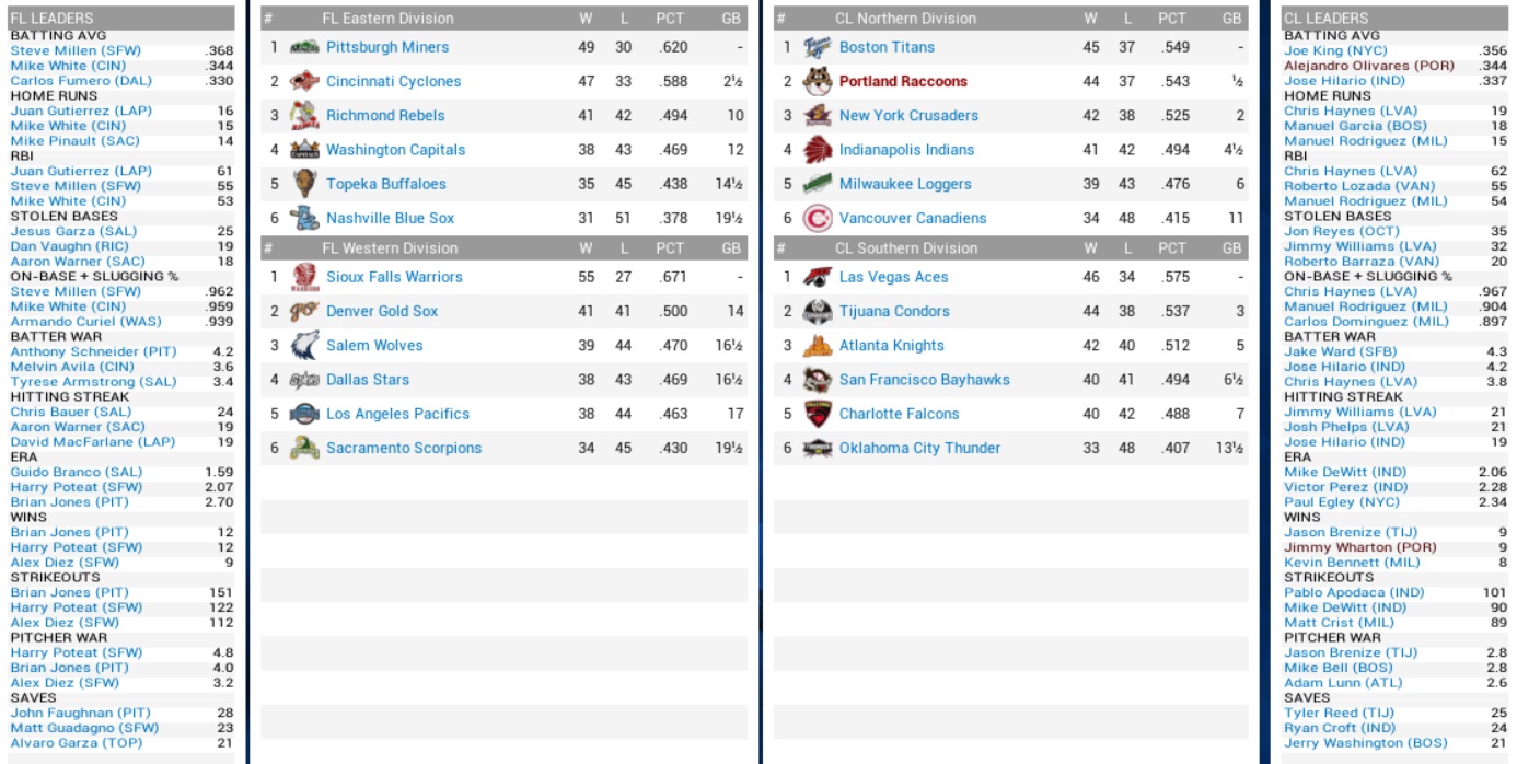 Also, this week of games below took too long, but I want to put that first base draft history together at some point this week. +++ Raccoons (37-25) @ Capitals (25-37) – June 15-17, 2071 The Caps had the most ineffective offense in the Federal League, scoring just 3.8 runs per game, while having average pitching. They had a -47 run differential, no speed, creaky defense, but a fairly sturdy bullpen, so you had to get them early. Third baseman Rick Healey was on the DL. These teams had last met in 2067, when the Caps won two of three from the Critters, who had not won a series between these two teams since ’63. Projected matchups: Gabriel Rios (3-7, 3.86 ERA) vs. Ken Nielsen (4-3, 4.46 ERA) Vinny Morales (3-1, 3.47 ERA) vs. Nick Robinson (5-2, 1.44 ERA) Jimmy Wharton (7-1, 2.75 ERA) vs. Bobby MacDonald (5-5, 4.54 ERA) 42-year-old Nick Robinson had only made 26 relief appearances and no starts so far this season, but the Caps had nobody else lined up after waiving and DFA’ing Tom Kies (2-6, 4.48 ERA) and Kevin Butte (2-7, 5.80 ERA) on Friday. Kies had been claimed by the Miners, and Butte had been sent to AAA Modesto. Robinson was the only left-hander in sight. Game 1 POR: LF Humphries – 2B Yocum – 1B Olivares – CF T. Wharton – RF Wilson – 3B Hernandez – C Rivas – SS McFarland – P Rios WAS: CF Chenette – 2B Goss – 1B A. Curiel – LF Streng – C Willhite – RF McKenna – 3B Frasher – SS Gilliam – P Nielsen Sharp singles by Tyler Chenette, the former Elks scourge upon the land, and Armando Curiel, and a meaty sac fly to right by Ian Streng, gave the Caps a 1-0 lead in the first inning. They continued to hit Rios well after that, but hit it into the teeth of the defense a lot, and in the fourth inning Rios issued two walks and struck out two others, and was bailed out of the inning by Tyler Wharton going back with pace to catch a drive by Tyler Gilliam to end the inning. The Coons were not really appearing on the map in those first four innings, putting out two hits, one of which auto-removed himself from the bases when Alejandro Olivares overran second base on a double and was tagged out. Jaden Wilson’s single, Hernandez getting brushed, Rivas’ groundout, and a free pass to Brian McFarland then put three runners on base for Portland in the fifth inning… but with Rios batting and one out. Rios ran a full count before whiffing against Nielsen, but Humph slapped a ball up the middle and through for a score-flipping, 2-out, 2-run single. Yocum grounded out, and the bottom 5th began with a K to Nielsen before Chenette drove a ball to the wall in right that Wilson caught, but also tumbled to the ground afterwards, and eventually received the attention and assistance in leaving the field of Luis Silva. Jamie Colter replaced him and crashed into a double play after leadoff singles by Olivares and Wharton in the top 6th. Pete McKenna picked Hernandez’ fly to right to end the inning. Curiel and Streng singles and a walk to McKenna loaded the bases in the bottom 6th, and switch-hitter Eric Frasher tied the game with another sac fly to center. Holzmeister and Morentin entered in a double switch for Rios and Hernandez, with McFarland moving to third base, and a pop off the bat of Gilliam ended the inning and kept the game tied at least. The Coons again started the seventh with runners as Rivas singled and Nielsen plunked McFarland. Morentin singled to center, and the bases were full with nobody out – whee. But Humph was again on the call and slapped a 2-run single through the left side now, giving the Coons a 4-2 lead. Streng’s throw home allowed the trail runners into scoring position even, but Yocum’s infield roller that he legged out for a single prevented any bid at the plate by Morentin, and we were back to three on, nobody out. Olivares’ RBI single to left knocked out Nielsen, but right-hander James Bilodeau also allowed an RBI single to Wharton, even though that ball didn’t even reach the infield dirt on the right side. Colter brought in a run with a groundout, 7-2, Holzmeister was sent to the plate and whiffed, but Rivas drove in two more runs with a single to left-center. McFarland hit *another* infield single, but Morentin grounded out to end a 7-run assault…! Holzmeister got around two singles in the seventh, and in the eighth Noah Newhard made his ABL debut. He gave up a leadoff double to Chris Willhite, walked PH Jay Lawyer, threw a wild pitch, but then struck out Frasher. Gilliam hit a 3-run homer and Alex Romero singled and Newhard left his first career game with the head hanging pretty low. McMahan was used to get out of the inning, and chronically unemployed Pedro Valentin got the ninth inning in a 4-run game, then made it a sweater by allowing hits to Willhite and Jonathan Gutierrez, and Morentin’s error put Frasher on, loading the bags with one out. Gilliam struck out, and Mike Meyer with two outs slapped a single through the right side. Willhite scored, and Gutierrez went for home – but was thrown out at the plate by Jamie Colter…! 9-6 Raccoons! Humphries 3-5, 4 RBI; Yocum 2-5; Olivares 3-4, BB, 2B, RBI; T. Wharton 2-5, RBI; Woodley (PH) 1-1, 2B; Rivas 2-4, BB, 2 RBI; A Crusaders loss left the Coons with sole possession of first place again. Unnoticed initially in the immediate postgame ruckus that included the Coons infielders holding paws and dancing around home plate while the Caps ferociously beleaguered the home plate umpire to protest the call at the plate was that Pedro Valentin did not join celebrations but instead sought out Luis Silva’s company. While Valentin turned out to be suffering from a mild abdominal strain that would leave him in day-to-day limbo for at least the rest of the series, but on the roster, Jaden Wilson hit the DL on Tuesday with an oblique strain and was out of the question until August… The first thought was to fill up the pen with the open roster spot, but our bench was already way too thi