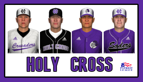 Here is Holy Cross. Finding their uniforms were not very easy. Some of these may not be up to date. I know the purple jersey with the logo on the front and the black one are newer. The white may be too. I would think all the hats could be switched around.