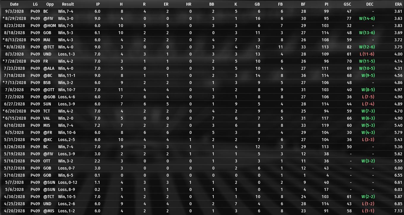 I would too, but I can never seem to afford those guys! My rotation is heavily geared toward movement, but doesn't include any premium arms like those. Keuchel (69-96-66), Blanton (68-84-76), Clemens (87-77-73), Hubbell (70-75-83), Cisco (64-80-66). Still does well in Perfect as long as my defense is clicking. |