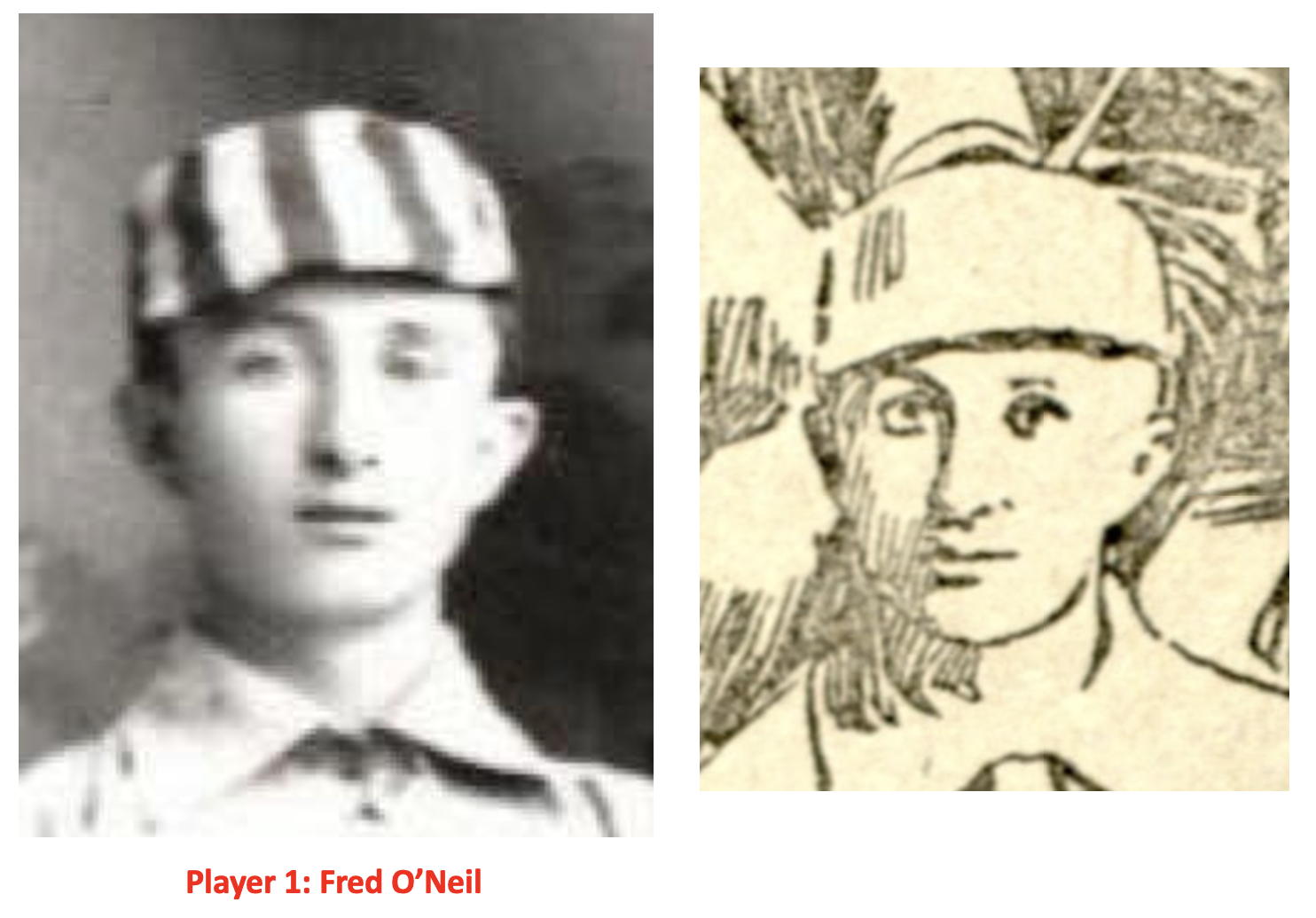 Comparing the sketch printed in the newspaper in July 1900 with the photo from the book "The Western League: A Baseball History", one player in each is shown in a uniform without "Denver" across the front. In the sketch, this player is identified as Silch, while in the photo this player is identified as O'Neil. I'm beginning to think one of these two is wrong. The comparisons are below between the photo and sketch, with the identifications as given for the photo. The sketch of O'Neil looks to me more like the player in the photo identified as Silch, while I can see the sketch identified as Silch matching the player in the photo identified as O'Neil.