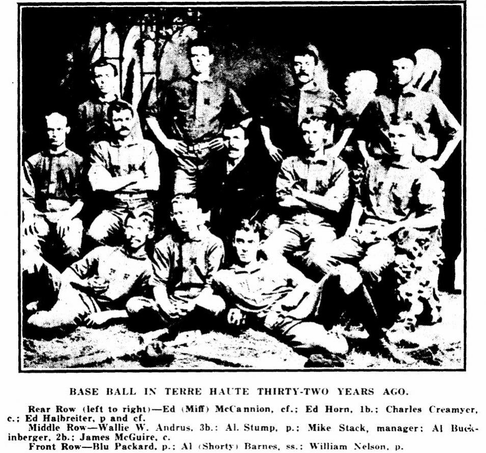 I was able to locate a photo (probably the only one according to the article) of the 1883 Terre Haute team. It was in the possession of player Ed Halbriter who had moved to Los Angeles. The Terre Haute Saturday Spectator of 10/16/1915 printed it and my hope is it may provide some clues as to the identities of a few of the 1884 players. Sadly the image is not as pristine as I'd want but beggars can't be choosers.