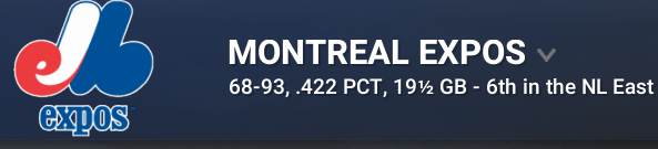 Batting Age BT G AB R H 2B 3B HR RBI BB SO SB CS DP BA OBP SLG Pos Morales, Willie 27 LL 142 533 62 143 32 1 27 89 34 94 0 0 10 .268 .313 .484 73/9 Ortega, Willie 27 RL 27 76 5 13 3 0 2 4 3 13 0 0 2 .171 .198 .289 7/9 Maldonado, Jose 27 RR 12 36 6 6 1 0 1 2 6 5 1 0 0 .167 .286 .278 7 Aldridge, Ben 27 RR 4 8 4 5 1 0 2 2 2 0 1 0 0 .625 .700 1.500 /7 Ash, Marc 28 RR 87 320 55 98 19 3 6 27 62 63 12 7 1 .306 .414 .441 89/7 Mendoza, Anton 26 RL 103 386 41 111 17 4 7 40 14 29 4 2 6 .288 .314 .407 897 Byce, Jeff 31 RR 51 189 16 37 6 1 1 12 11 32 6 2 3 .196 .243 .254 8/7 Owens, Andy 31 RR 12 24 3 2 0 0 0 1 3 9 0 0 1 .083 .179 .083 /8 Williams, Matt 32 RR 98 313 47 88 8 4 19 48 45 59 7 7 10 .281 .379 .514 9/7 Martinez, Gabe 29 SR 101 170 16 48 10 2 1 16 14 24 2 0 4 .282 .333 .382 9/347 Vargas, Johnny 23 LL 36 54 4 11 2 0 0 5 3 9 0 1 0 .204 .246 .241 /978 Sullivan, Aaron 37 LL 39 40 7 15 1 0 3 9 4 5 0 0 0 .375 .413 .625 /9 Marc Ash is yet another former Yankee outfielder, although Ash, to be fair, was not a product of NY's farm, having arrived there in a 1968 trade with the Minnesota Twins. Still, he went from pinch-hitter in the Bronx to full-time outfielder in the City of Fraunce of Canadia. Ash also does not strike me as a pure CF and like Mendoza he has to hit well in order to justify a move to an outfield corner. He definitely deserved a bigger role than what he got in NYC though and now he's getting it. [b]Matt Williams[b] got shut down with a looot of minor, assorted injuries last year and the Expos seemed reticent to hand him the RF job. Sure, they've got plenty of young guys to give a shot to. Williams is a 2 time All-Star, including a 1970 berth that, sadly, ended with him breaking his kneecap right after the AS break, who has hit as many as 39 HRs in a season. He's always deserved more playing time than what he's gotten. Perhaps this will be the year he gets it. If he's hurt again, the Expos do have Gabe Martinez, who otherwise does a fine job as the team's primary pinch hitter. There's also a couple guys on the farm WHO WILL REMAIN NAMELESS BECAUSE I WILL PROBABLY CHANGE THEIR NAMES.