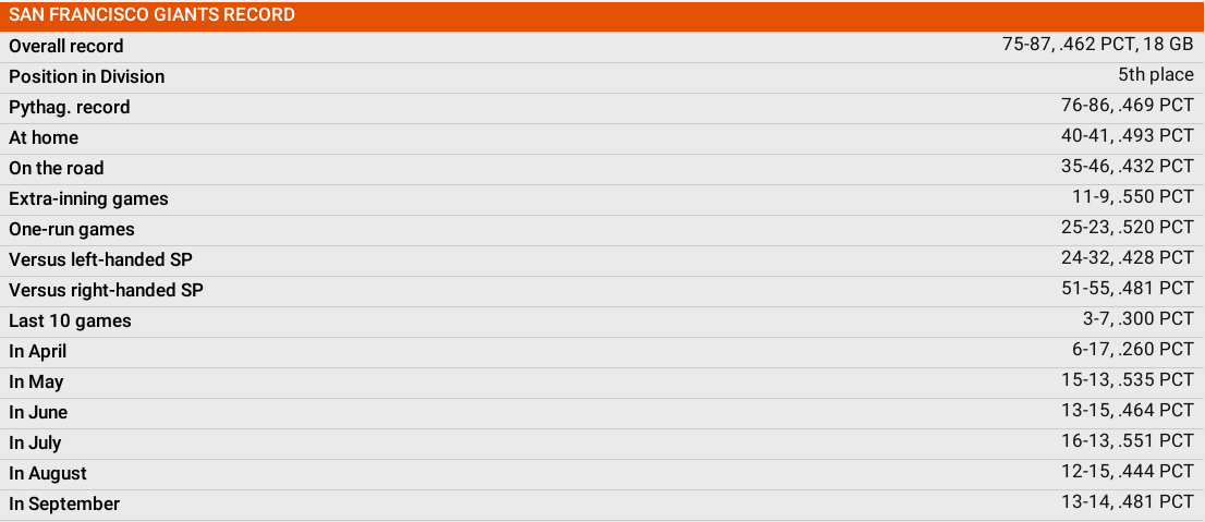 Batting Age BT G AB R H 2B 3B HR RBI BB SO SB CS DP BA OBP SLG Pos Seek, Chris 27 RR 134 439 49 118 23 2 2 47 35 42 0 0 16 .269 .322 .344 3 Everhart, John 36 RR 59 191 18 29 11 0 2 13 29 32 0 0 5 .152 .267 .241 37 van Velthoven, Kelsey 34 RR 13 11 2 1 1 0 0 0 1 2 0 0 0 .091 .231 .182 Juarez, Rodrigo 24 RR 126 459 67 109 18 4 17 69 54 75 2 1 13 .237 .317 .405 4* Luper, Jimmy 28 RR 19 55 4 11 3 0 0 4 6 10 0 0 6 .200 .270 .255 4 Mock, Tim 30 RR 109 407 39 100 12 4 7 43 26 45 4 2 8 .246 .287 .346 5 Harrison, George 23 LR 33 121 15 47 14 2 2 13 5 12 0 1 0 .388 .394 .587 5/4 Jersey, Ryan 26 RR 47 99 17 27 2 1 5 13 16 17 0 0 1 .273 .371 .465 5 Krupenski, Armando 26 RR 13 25 2 6 0 0 0 0 3 4 0 0 0 .240 .310 .240 /564 Fujimoto, Akiho 33 RR 131 500 46 127 18 2 3 41 42 44 2 0 14 .254 .306 .316 6* Sanchez, Mario 23 RR 65 208 25 48 8 3 1 23 24 46 0 1 2 .231 .308 .313 64 Rodrigo Juarez was handed the second base job out of spring training and as a 24 year old it was a positive just that he held onto it all year. He's got nice power for a middle infielder and scouts say he could walk 70 times a season if he gets the opportunity. If he wants to stick around he'll need to raise his average, possibly by cutting down on the whiffs. As a defender, he's nothing special and is pretty much confined to second by a below average arm. The Giants do have another guy sitting in AA, <name redacted>, who hit .281 in A ball and who looks like an elite defensive second baseman (like Juarez, he's got a poor arm, so no shortstop for him). He's probably at best a September call-up. After dealing with the mediocrity of Tim Mock for 2 seasons the Giants tried something new for September and that new thing - prospect George Harrison - looks like the best thing that's happened to this team in a long time. Harrison did nothing but rake from the day he was called up in early August. Hey, he won't hit .388 but .288, even, would be a huge step up from what Mock was giving them. As a fielder, too, he's got the kind of arm that boys dream about and girls get their mind set on. Akiho "The Truth" Fujimoto is a fine defensive shortstop who hits, for the most part, like a fine defensive shortstop. This is an obvious place where SF will do well to find a replacement before the 33 year old Fujimoto's range falls off, but for now it's... a position. Mario Sanchez exists here and is 10 years younger, not nearly as good defensively, and similarly poor on offense. The best bets for long-term replacements are still more than a year away. Code: