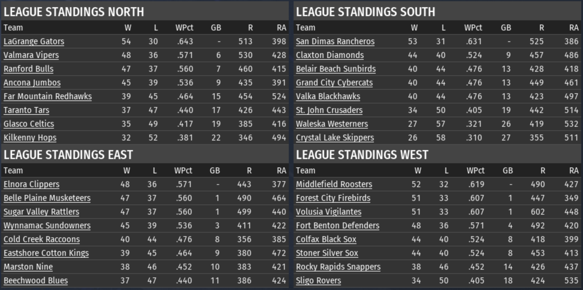 The current RU champion Valmara Vipers (48-36) are in 2nd place, 6 games behind RU North frontrunner LaGrange Gators (54-30). The IPA champion Cape Coral Hurricanes (43-41) are struggling to stay above .500. They are in 5th place in the TU South, 12 games behind division leader Summerland Sunsets (55-29). |