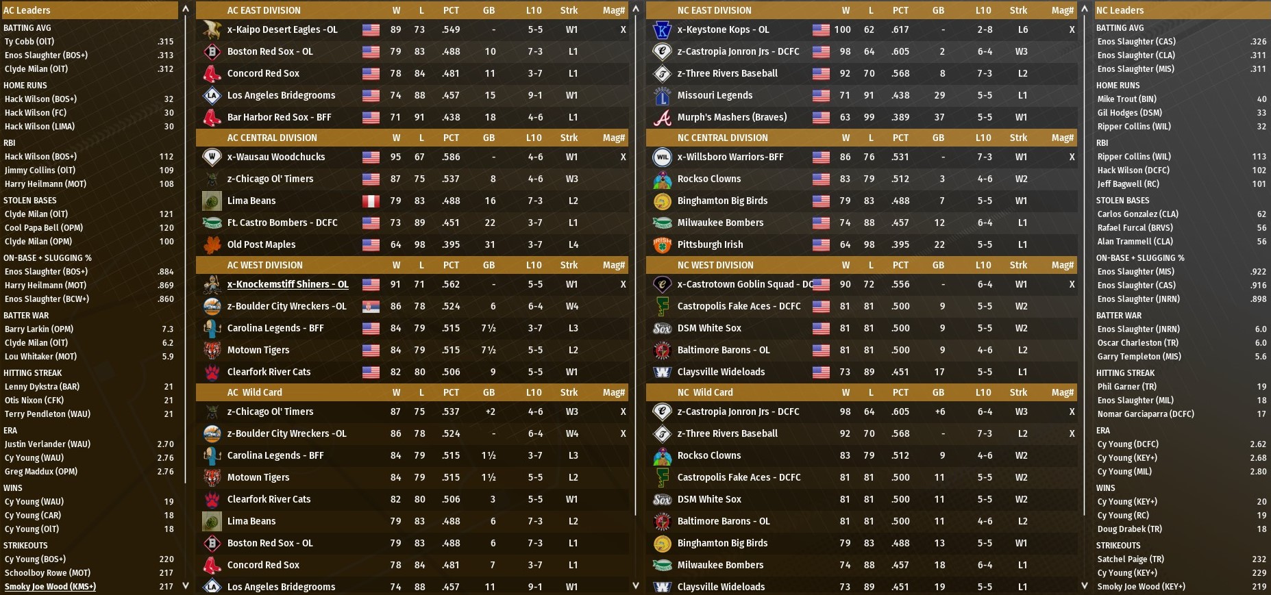 Crazily tight final standings! Baltimore and Keystone split their 6 games 3-3, but the Kops outscored the Barons by 25 runs to 22, so I assume that is the deciding factor? In which case, congratulations to the Keystone Kops! With the best record in the league, Keystone are guaranteed promotion to Gold. I think Knockemstiff are too. Kaipo will be promoted if they beat the Shiners in the DS, and Boulder City will too if they also make it past the DS. I wanted Knockemstiff to stay in Silver for a while, so I could take care of the tables, but I guess I overcooked them slightly
